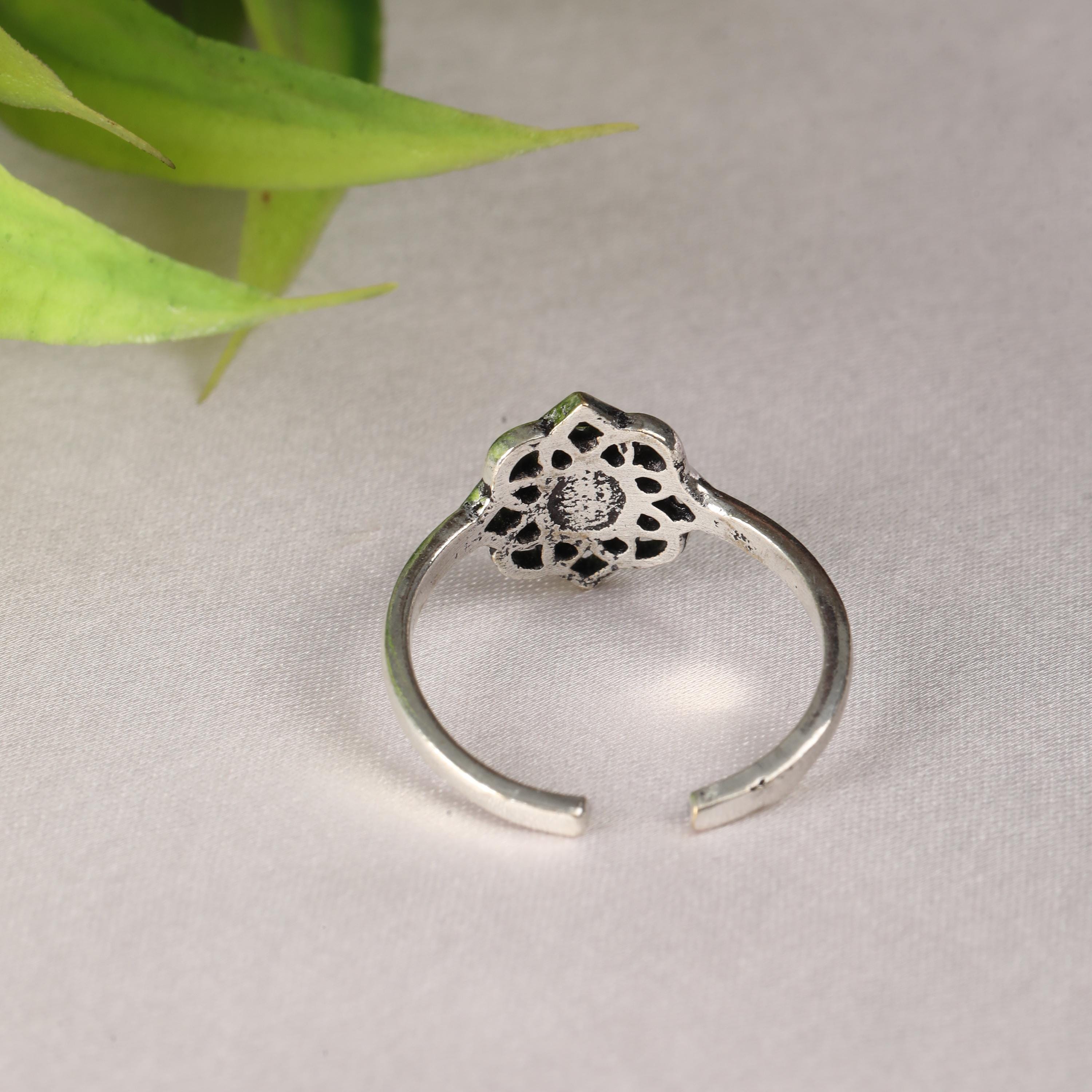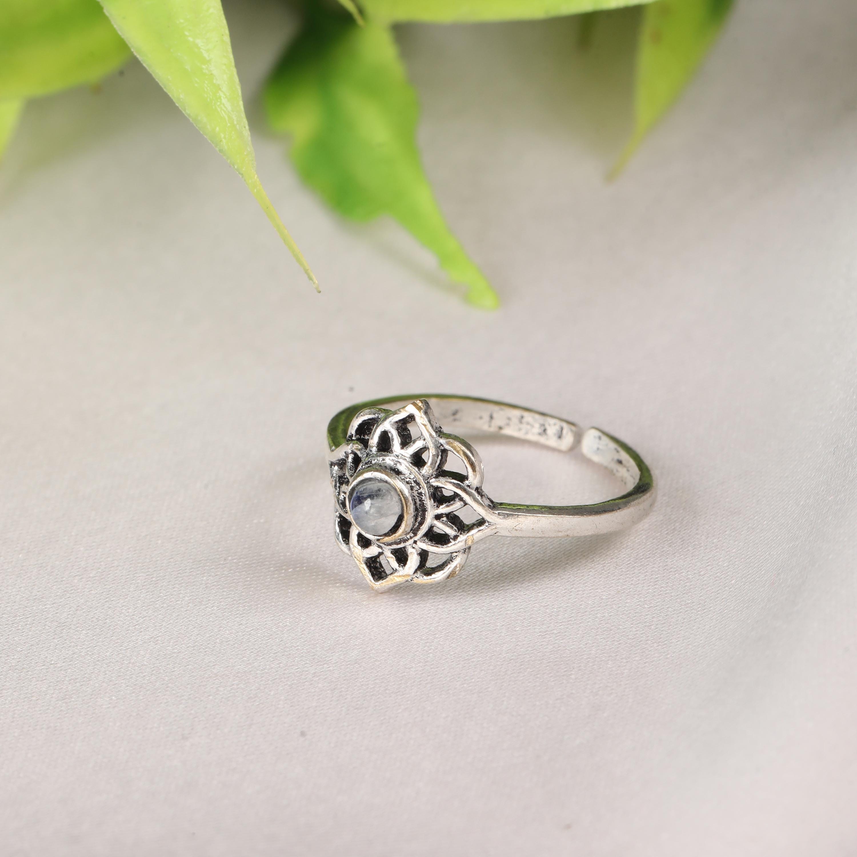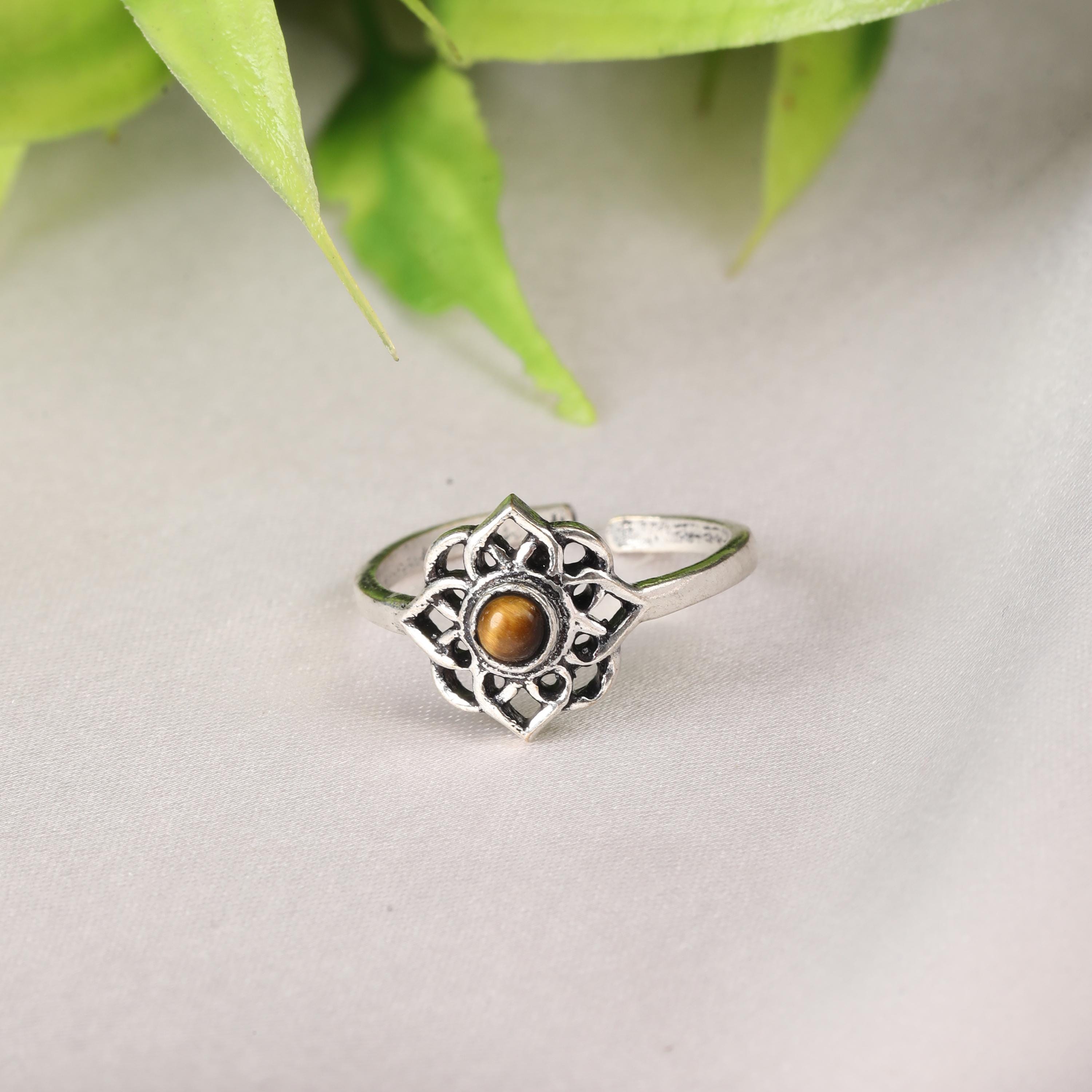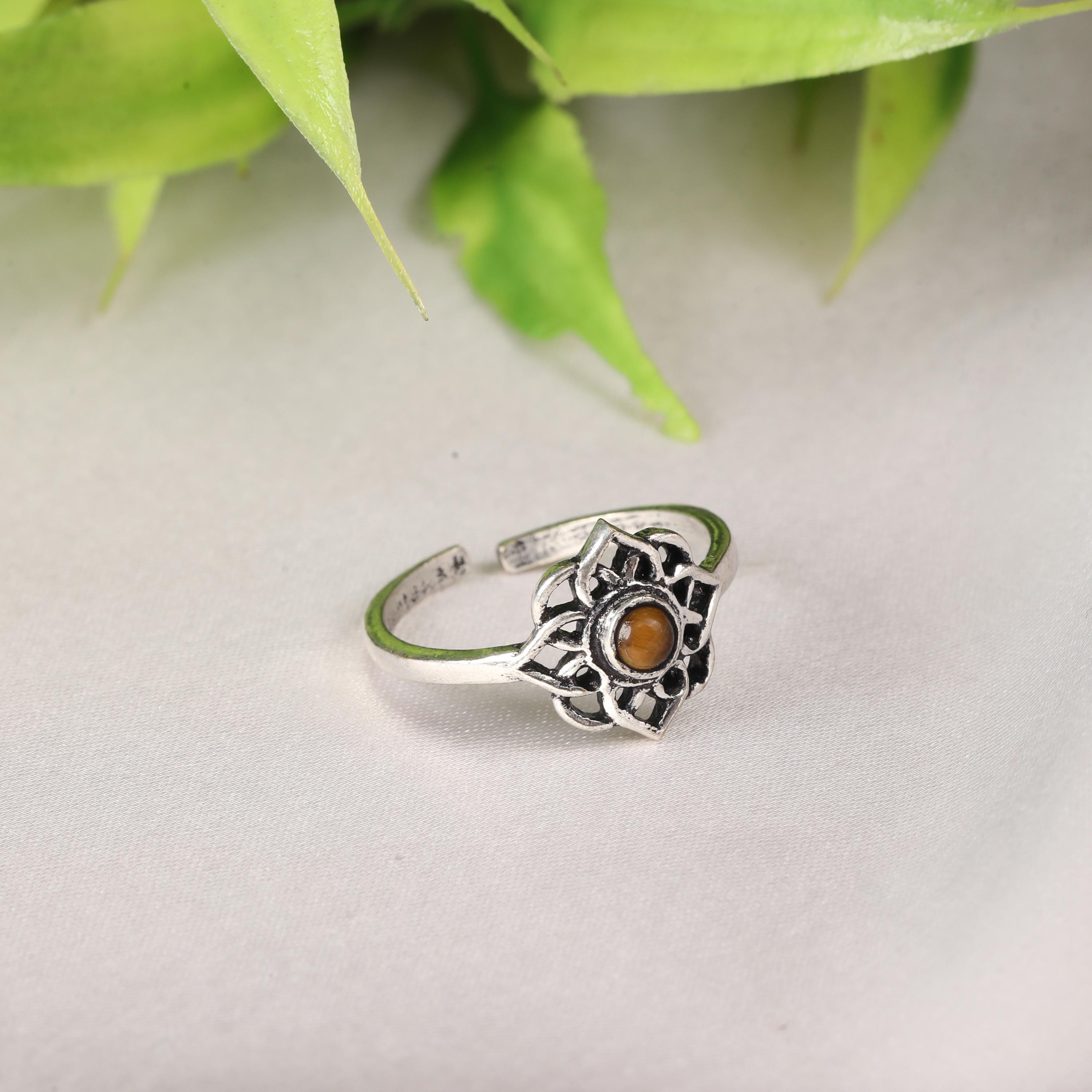 Adjustable Ring in the Shape of a Mandala with a Semi Precious Stone Cabochon in the Center. Silver Brass Ring. You Can Adjust This Ring Directly On Your Finger Because It Is Flexible.