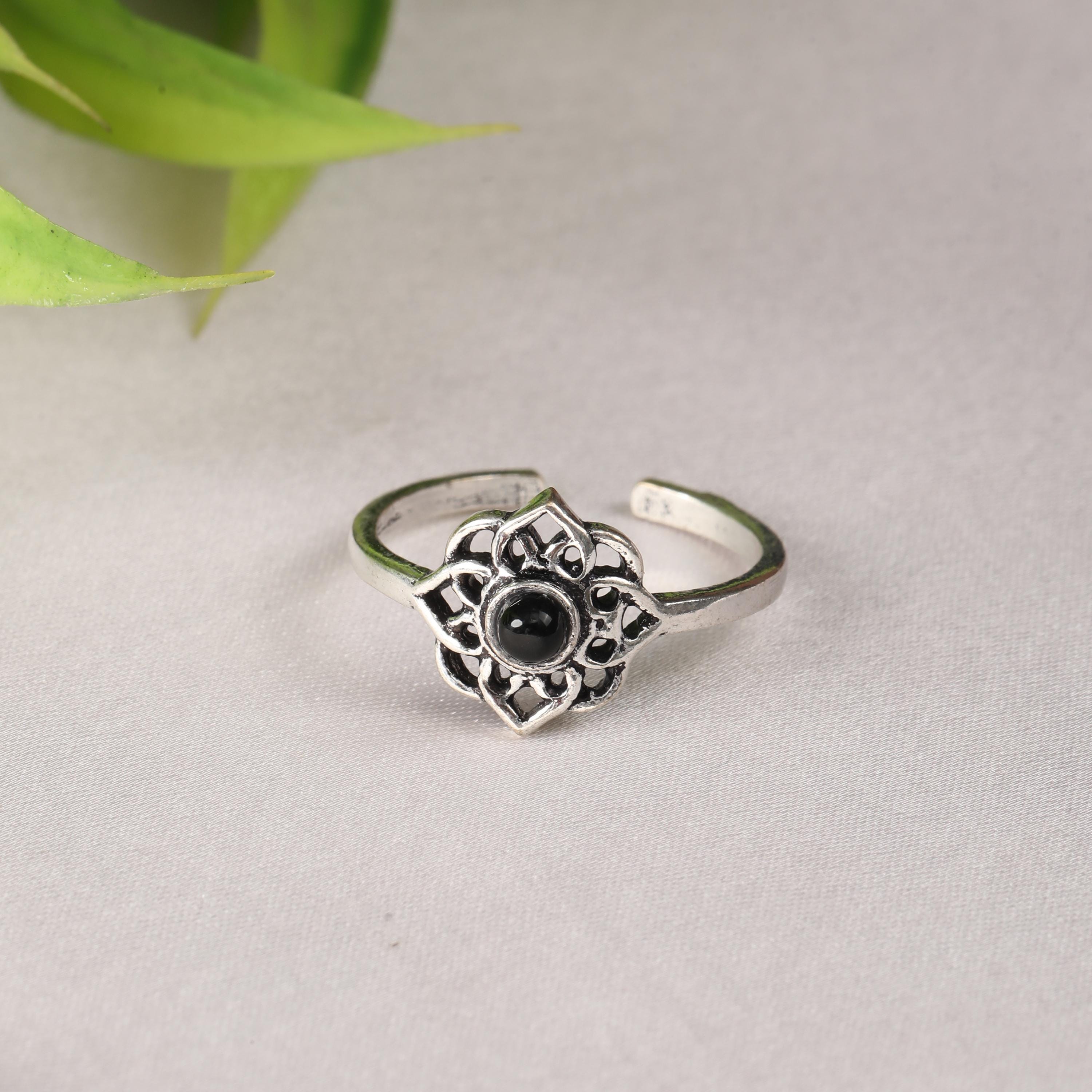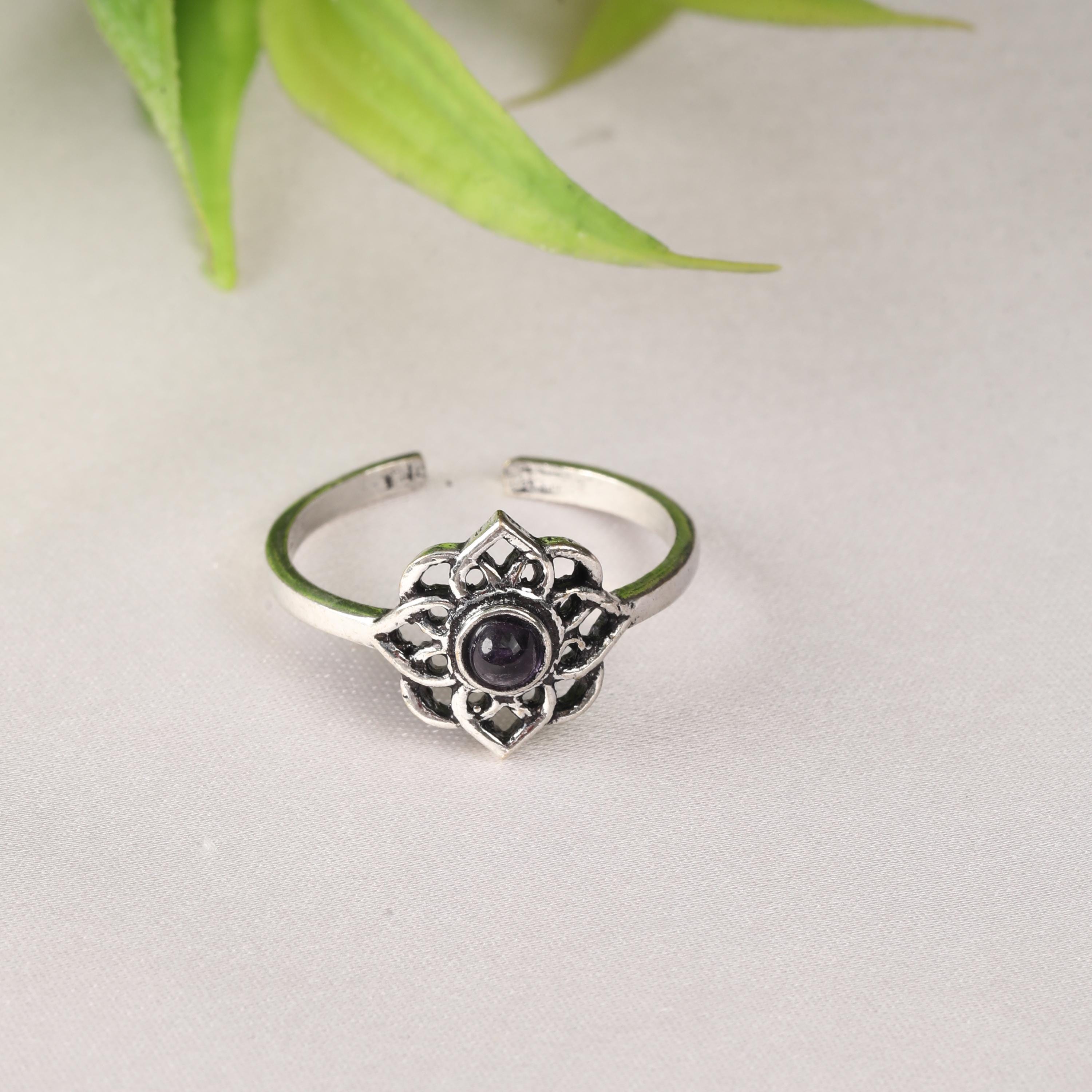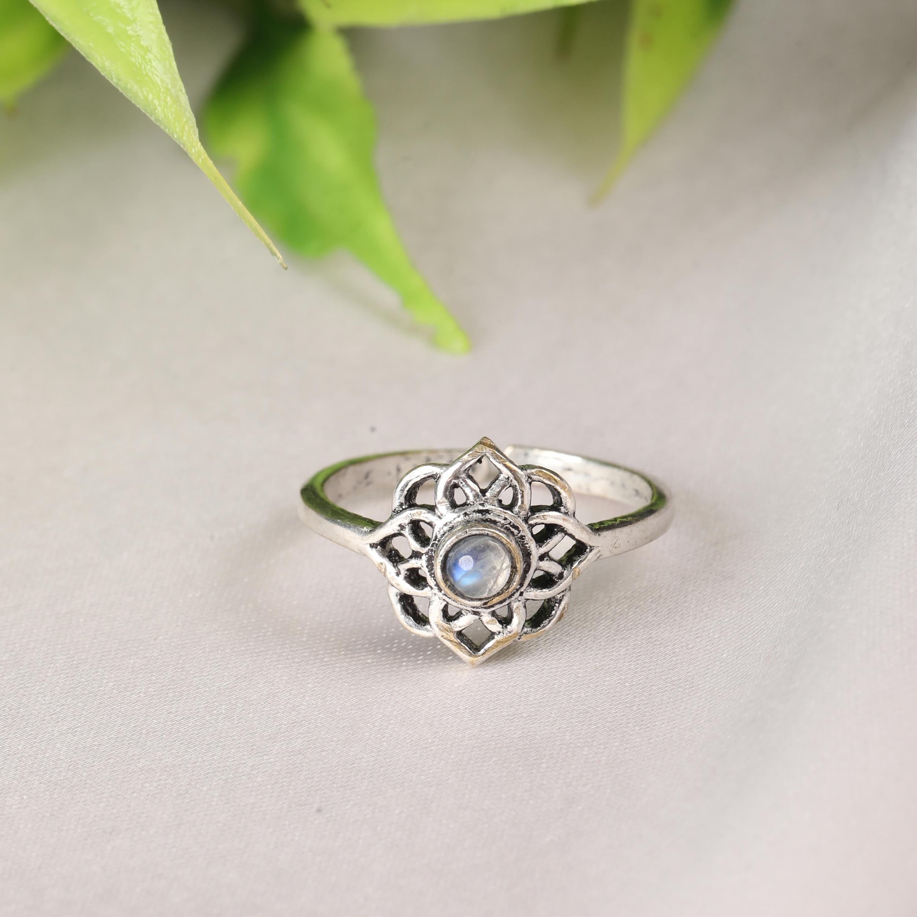 Adjustable Ring in the Shape of a Mandala with a Semi Precious Stone Cabochon in the Center. Silver Brass Ring. You Can Adjust This Ring Directly On Your Finger Because It Is Flexible.