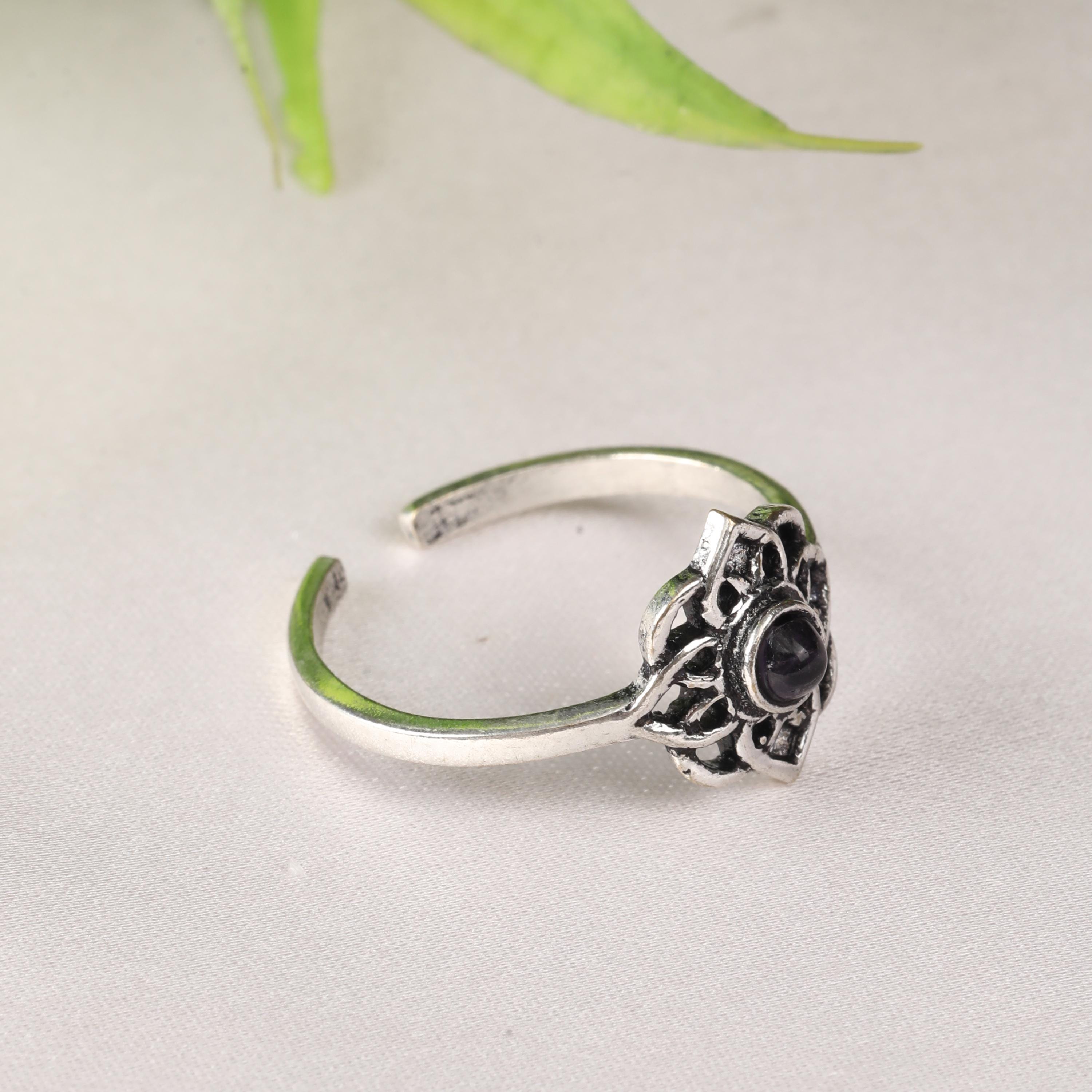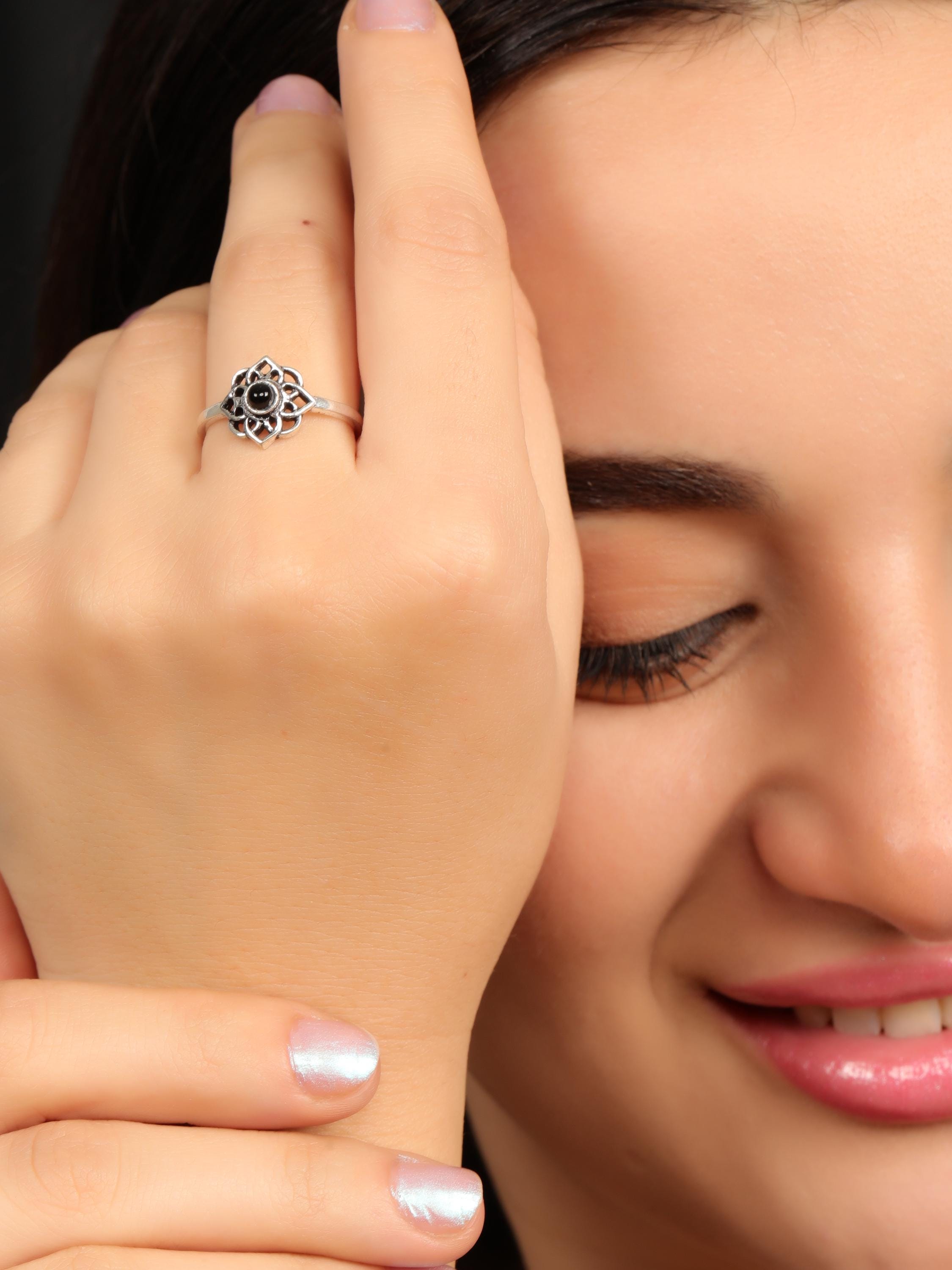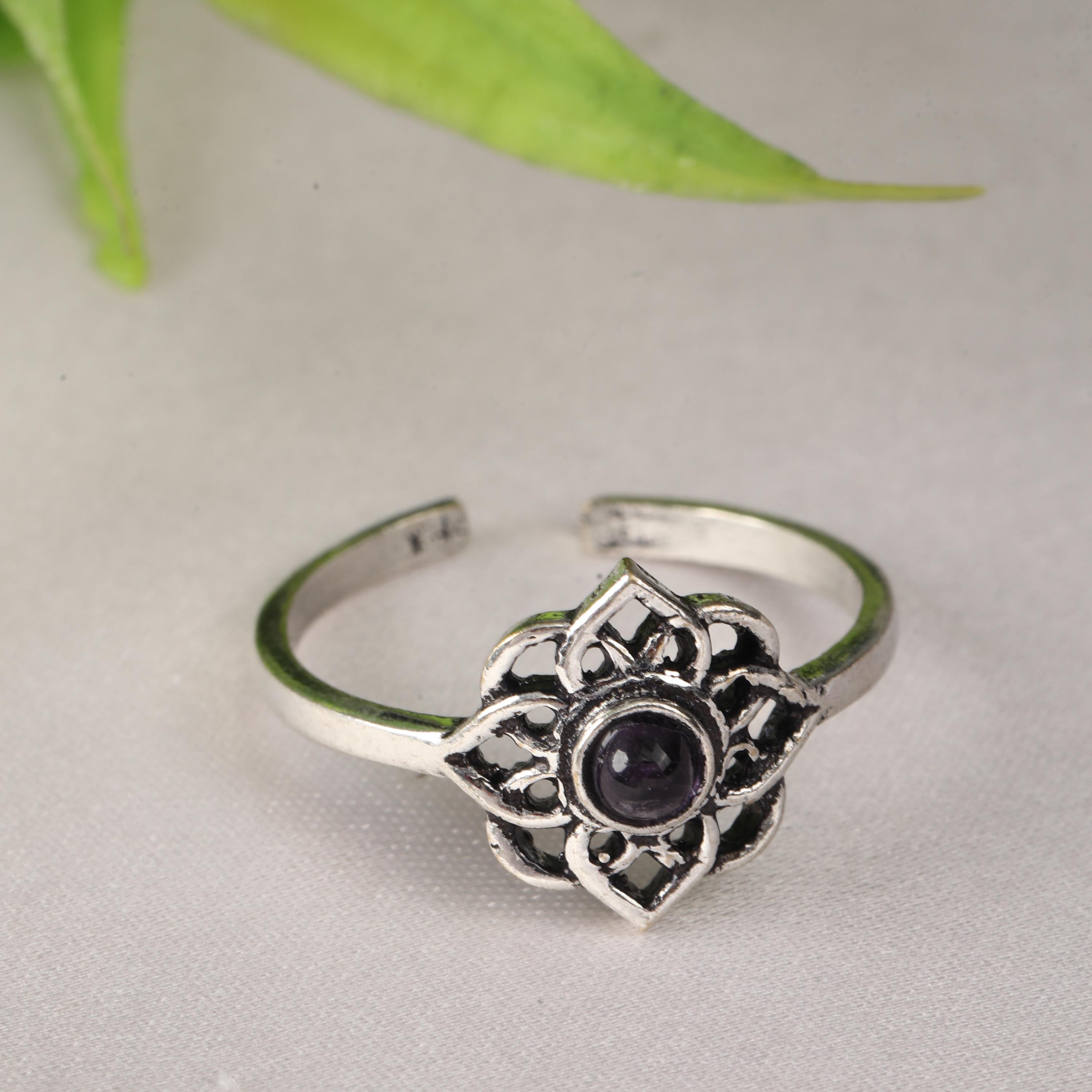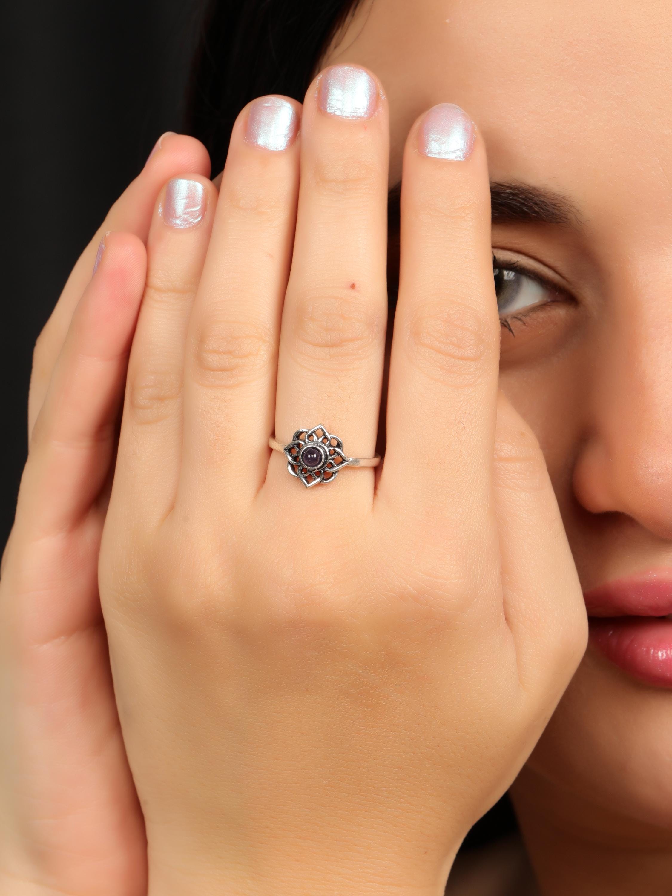 Adjustable Ring in the Shape of a Mandala with a Semi Precious Stone Cabochon in the Center. Silver Brass Ring. You Can Adjust This Ring Directly On Your Finger Because It Is Flexible.
