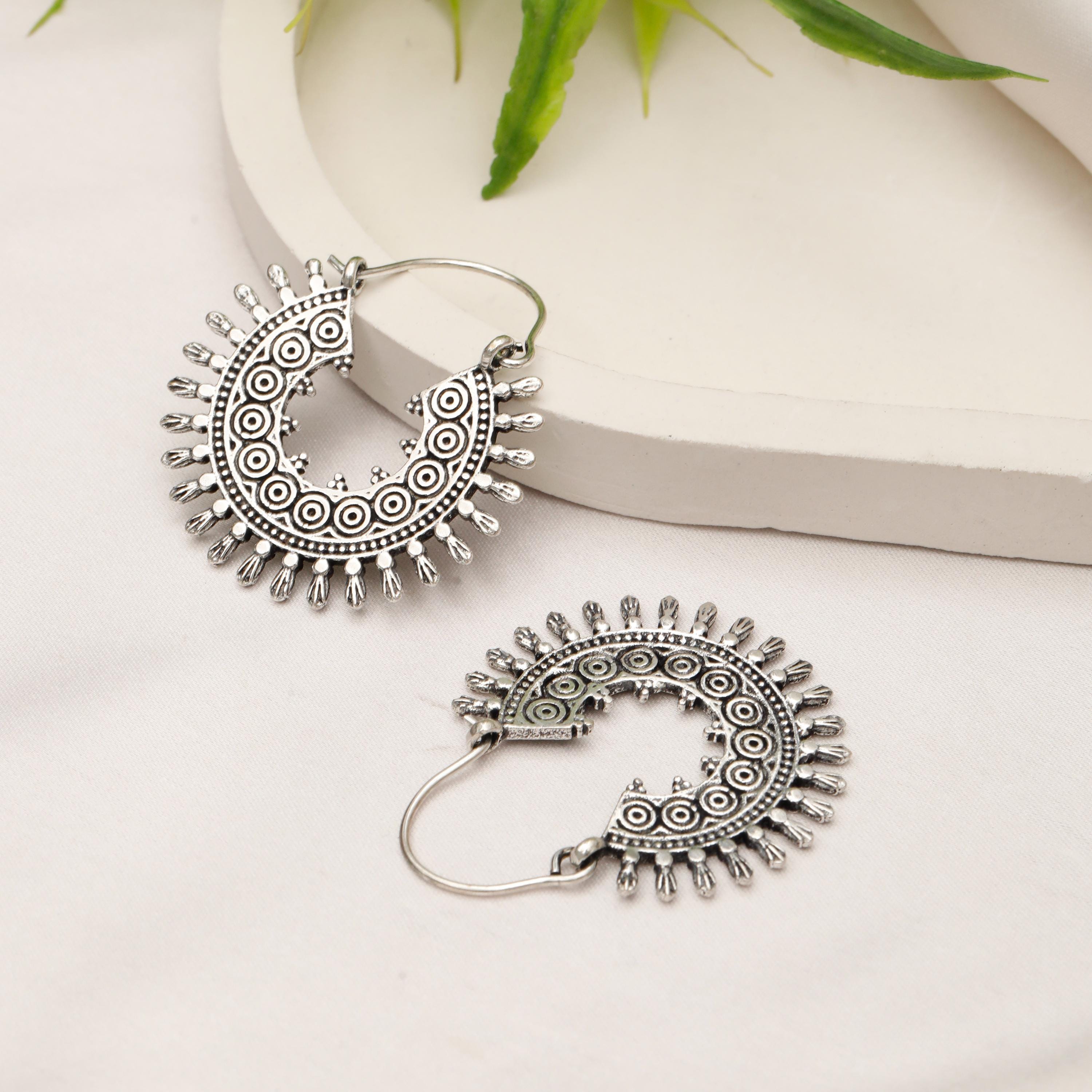 Hoop Earrings in Silver or Gold Brass. These Creoles are Elegantly Decorated with Spiral Patterns and Geometric Patterns. The Perimeter is Embellished with Peaks to Give a More Ethnic Style.