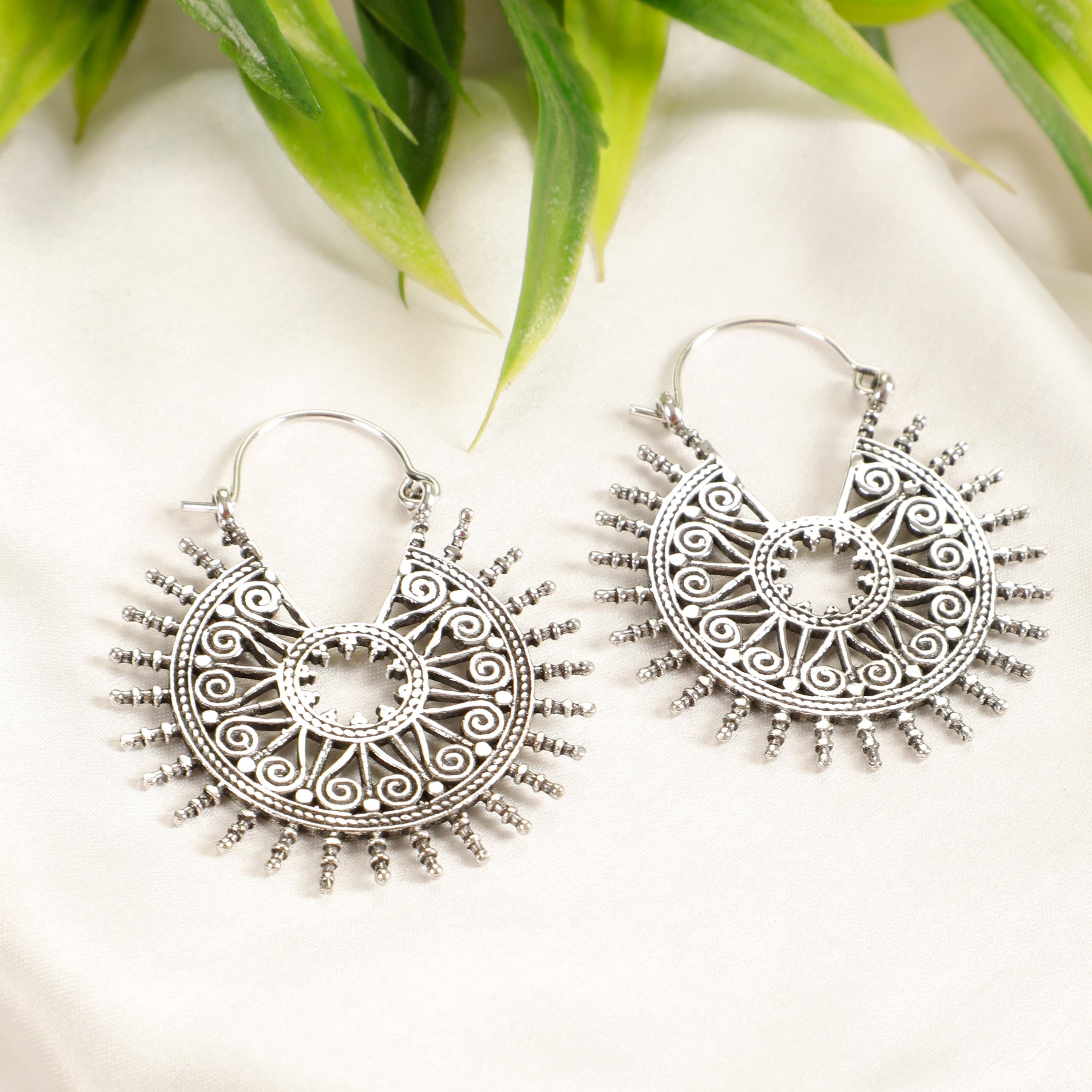 Openwork Silver or Gold Brass Hoop Earrings. These Creoles are Elegantly Decorated with Openwork Swirl Patterns and The Tower Is Decorated with Peaks which Gives them an Ethnic Style.