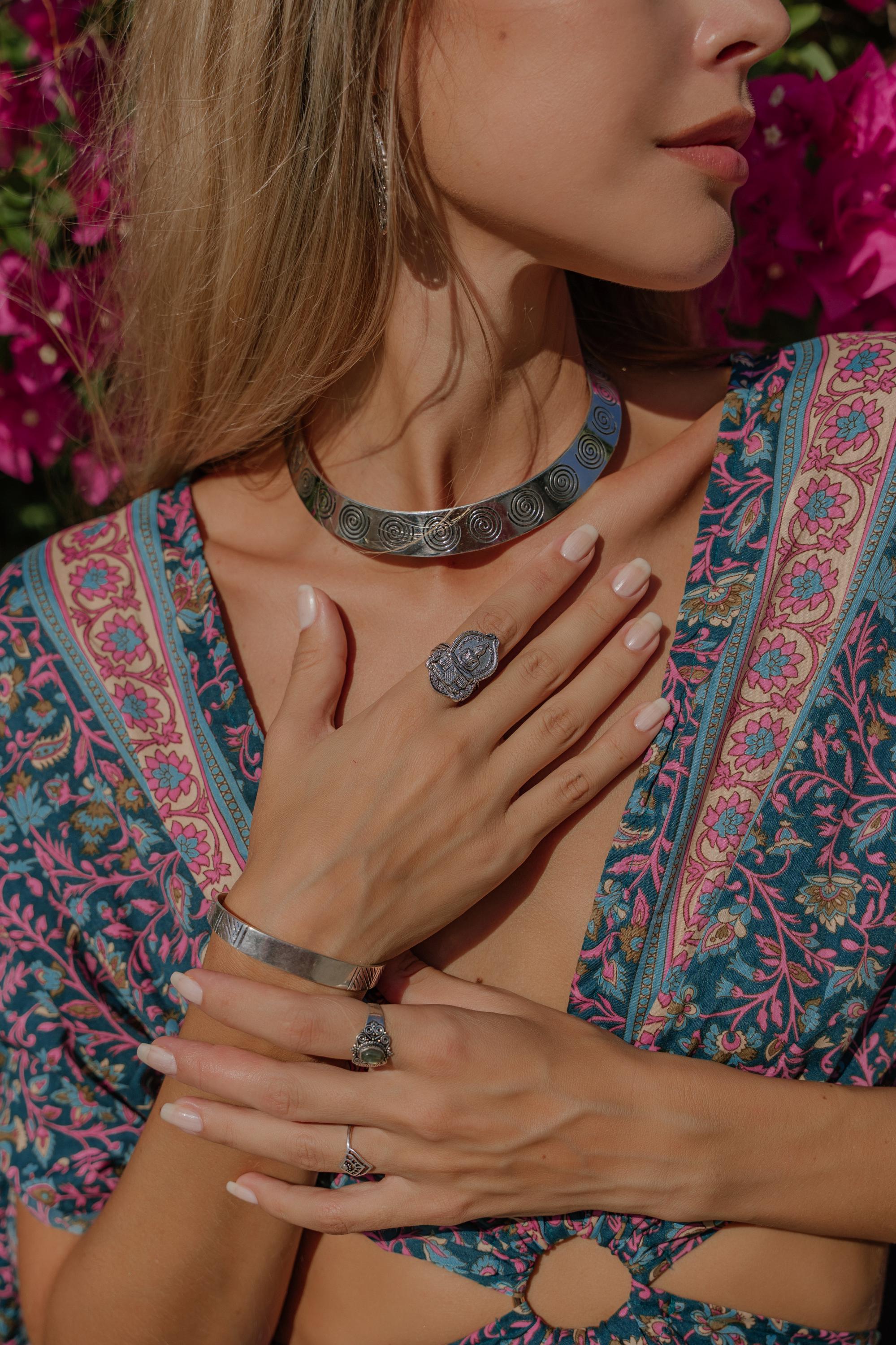 Ethnic Choker Necklace In Silvered Brass With Engraved Spiral Patterns. This necklace is reminiscent of the Viking or Tribal Torques while being more Contemporary. This Necklace is Delicately Engraved and Patinated by Hand to Enhance the Patterns. Its manufacture is artisanal. Its Elegant and Refined Shape Will Fit the Shape of your Neck perfectly.