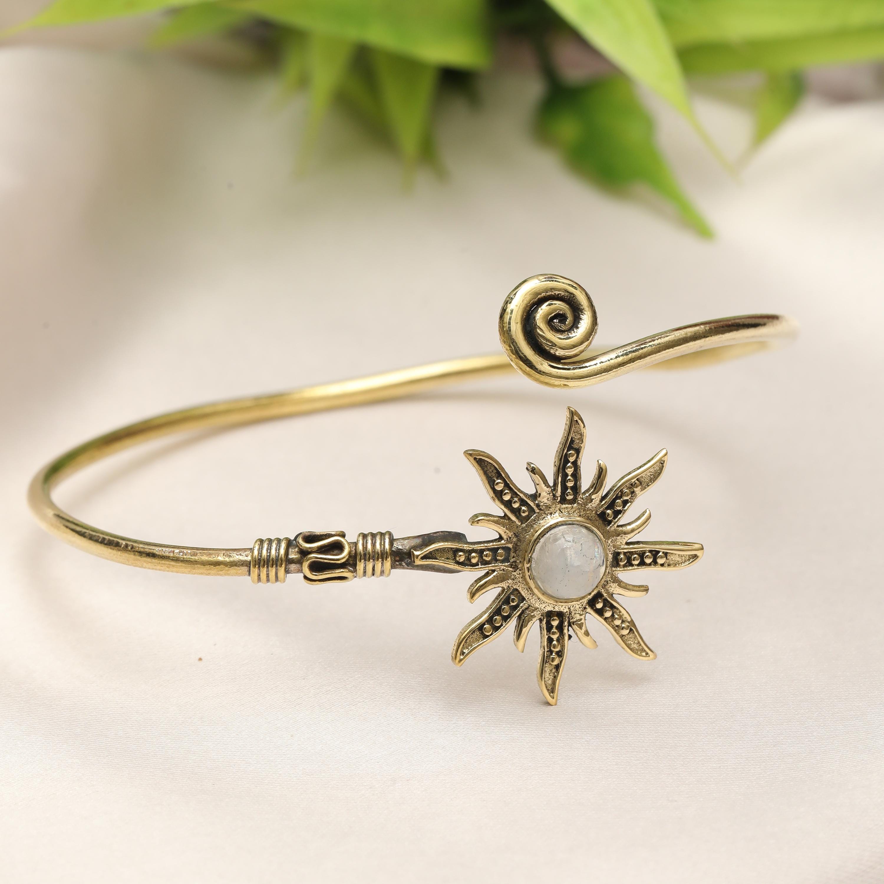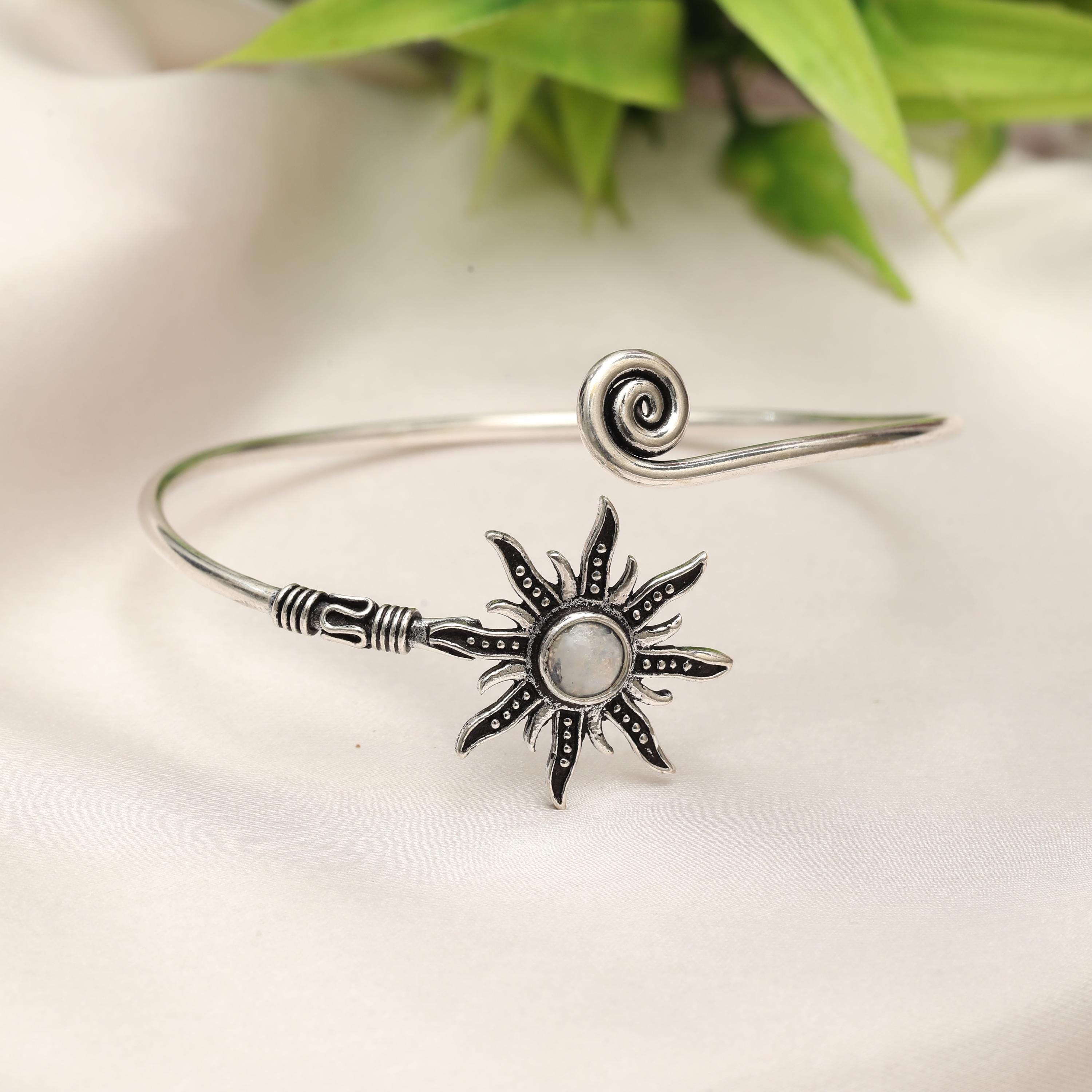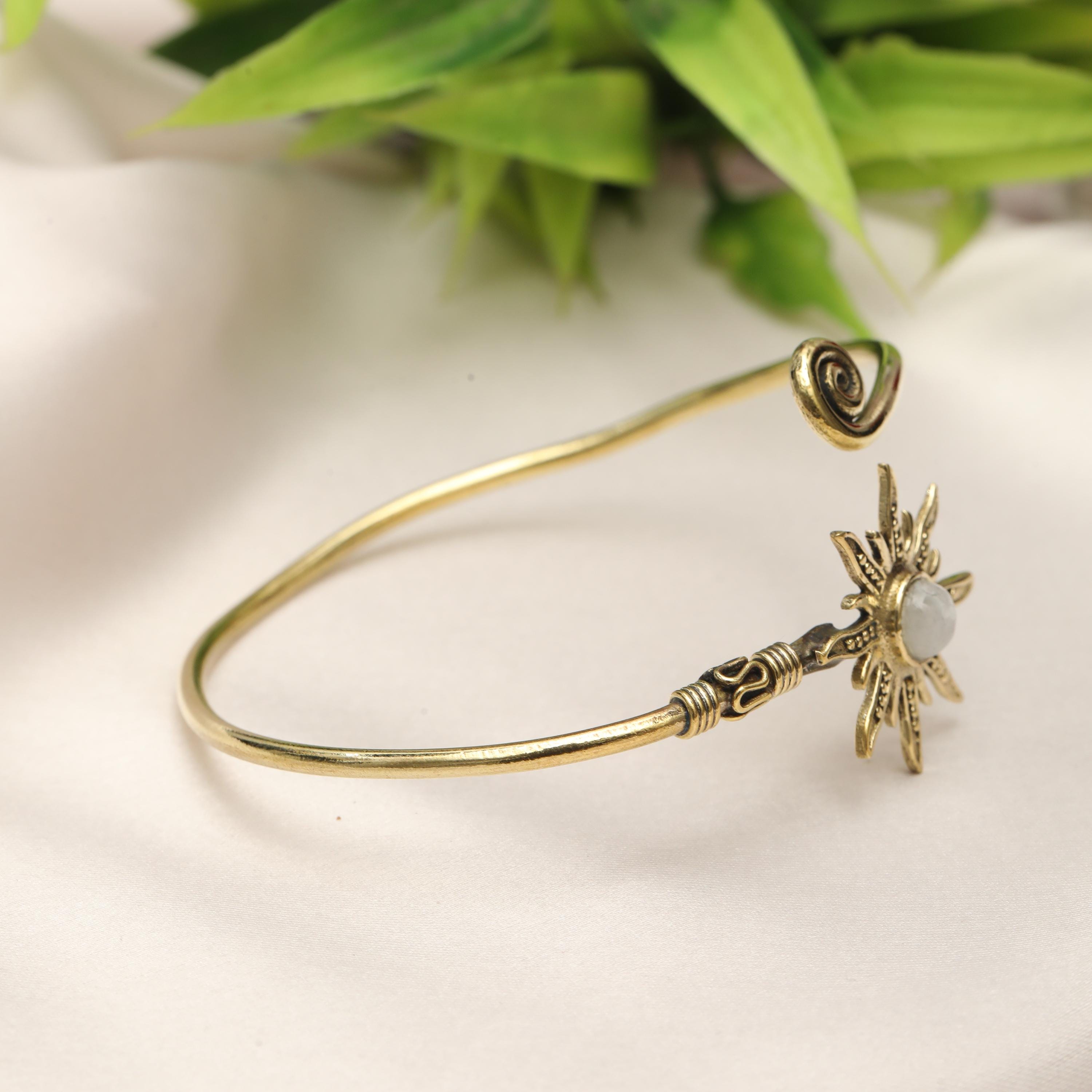 Thin Adjustable Semi Open Bangle Bracelet. Finished on one side with a Round Moonstone Cabochon that is Decorated with Ethnic Motifs Reminiscent of the Sun, and on the Other with a Spiral