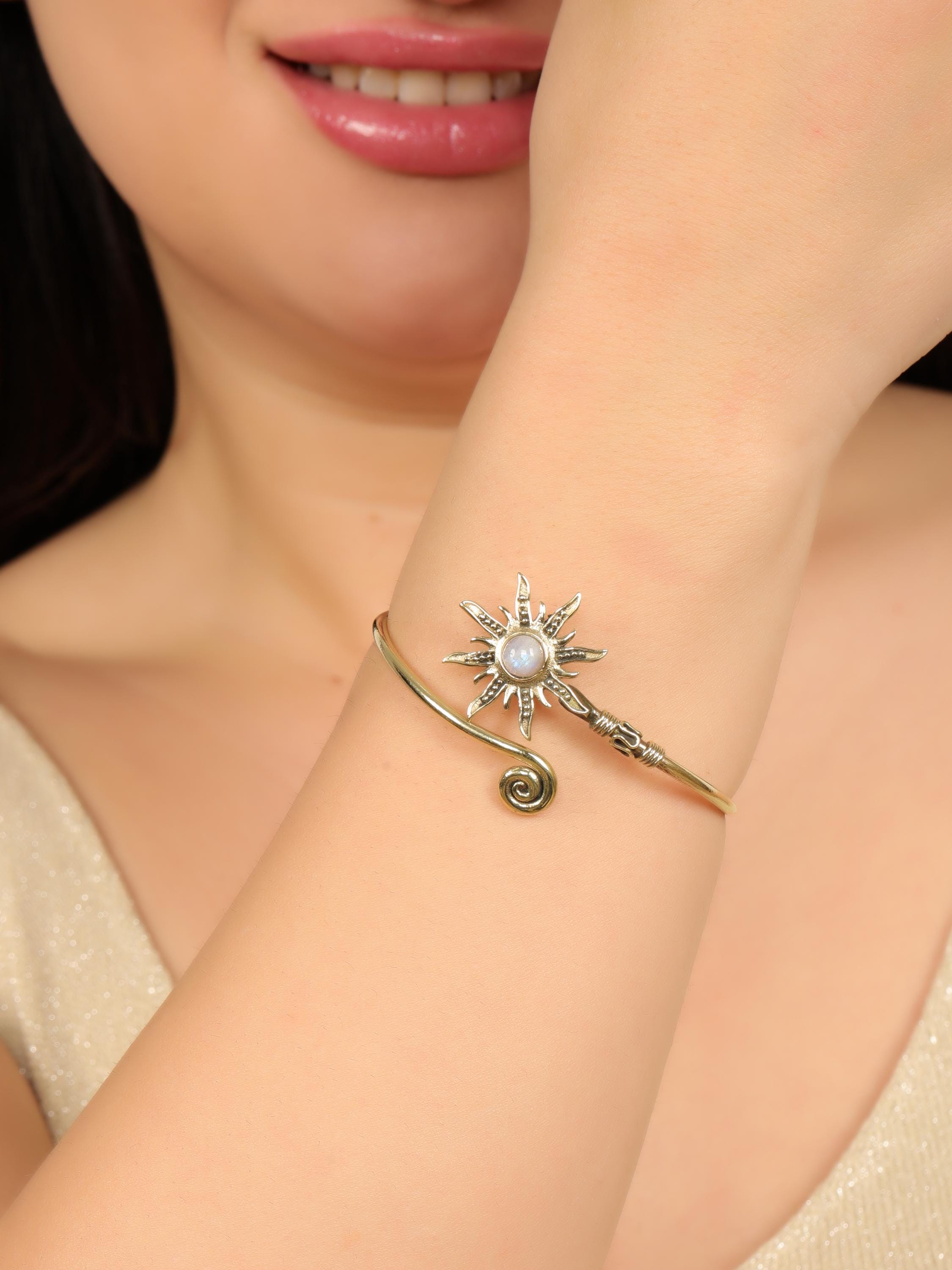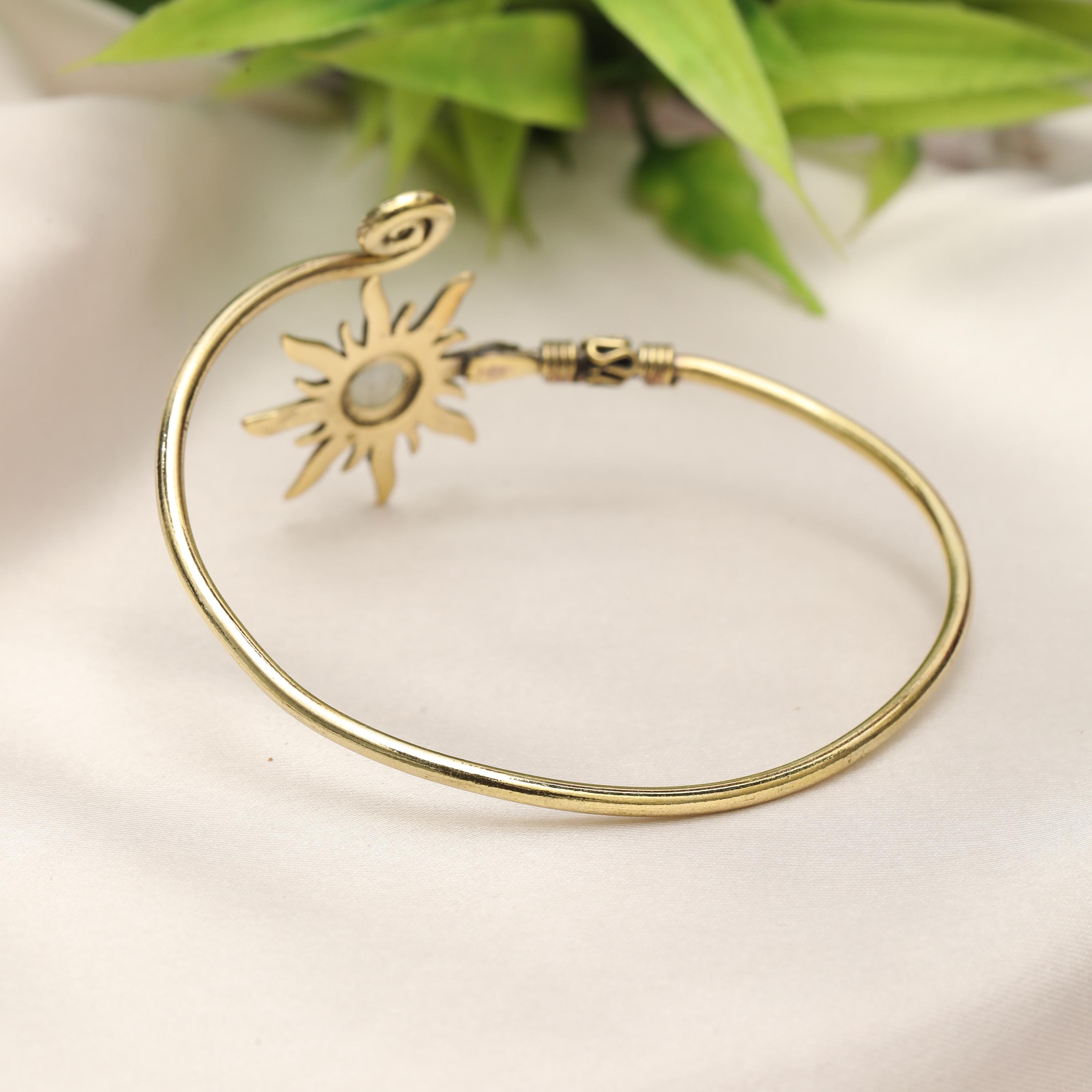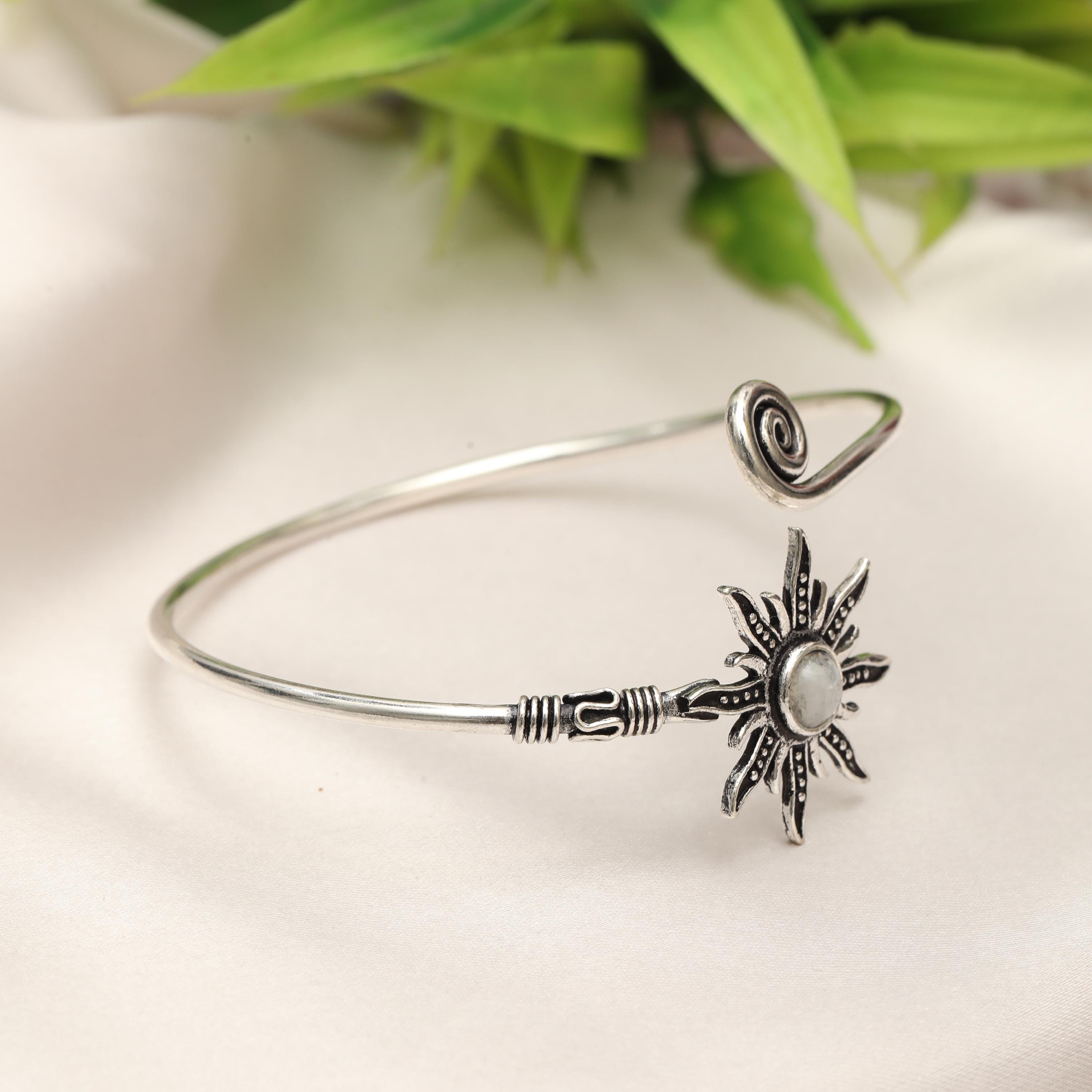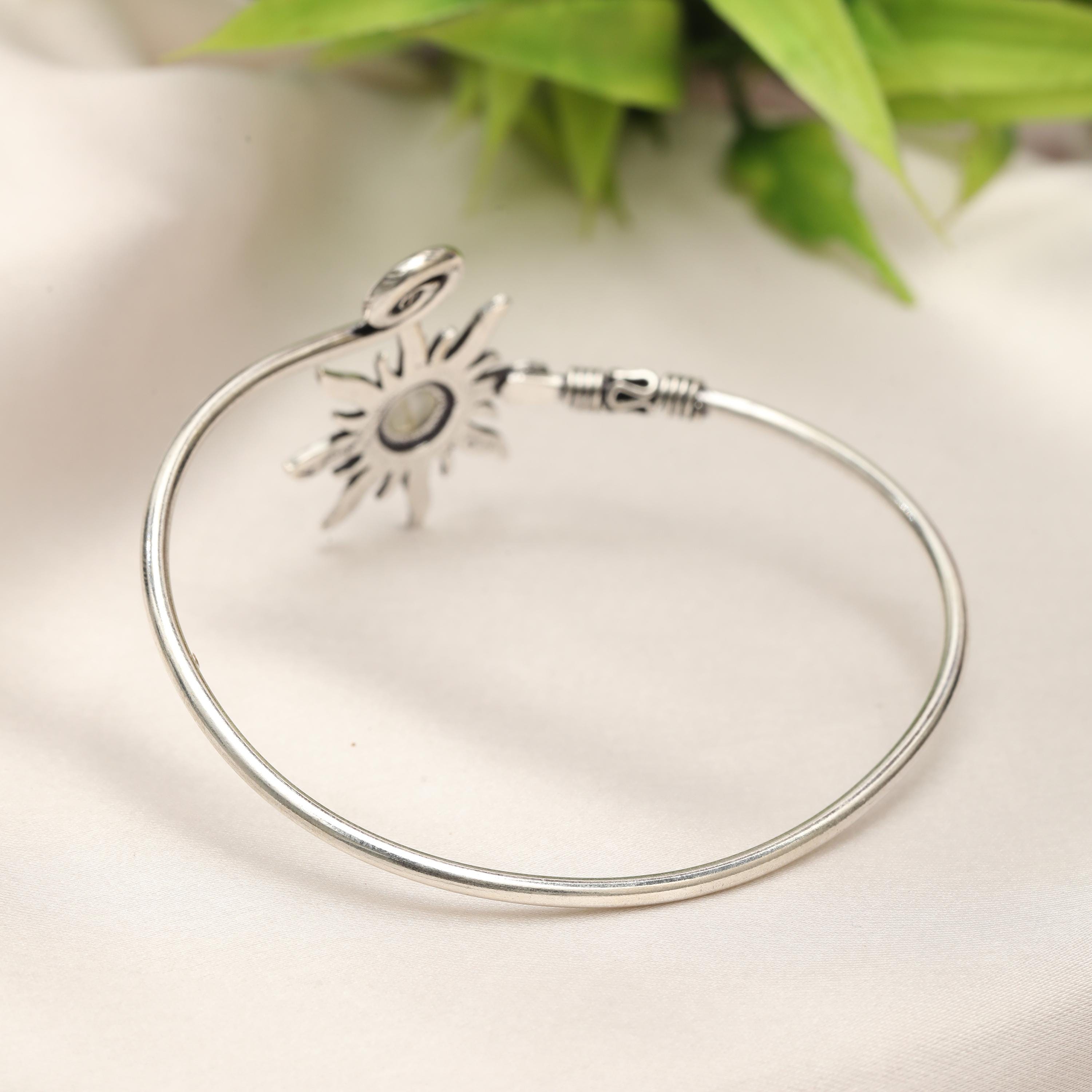 Thin Adjustable Semi Open Bangle Bracelet. Finished on one side with a Round Moonstone Cabochon that is Decorated with Ethnic Motifs Reminiscent of the Sun, and on the Other with a Spiral