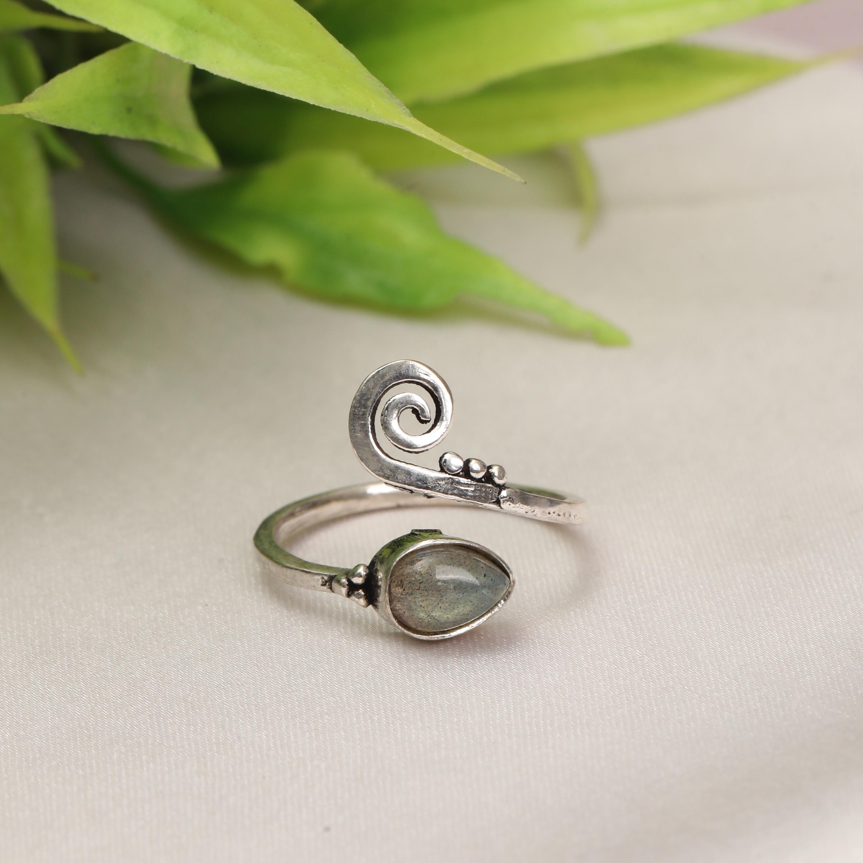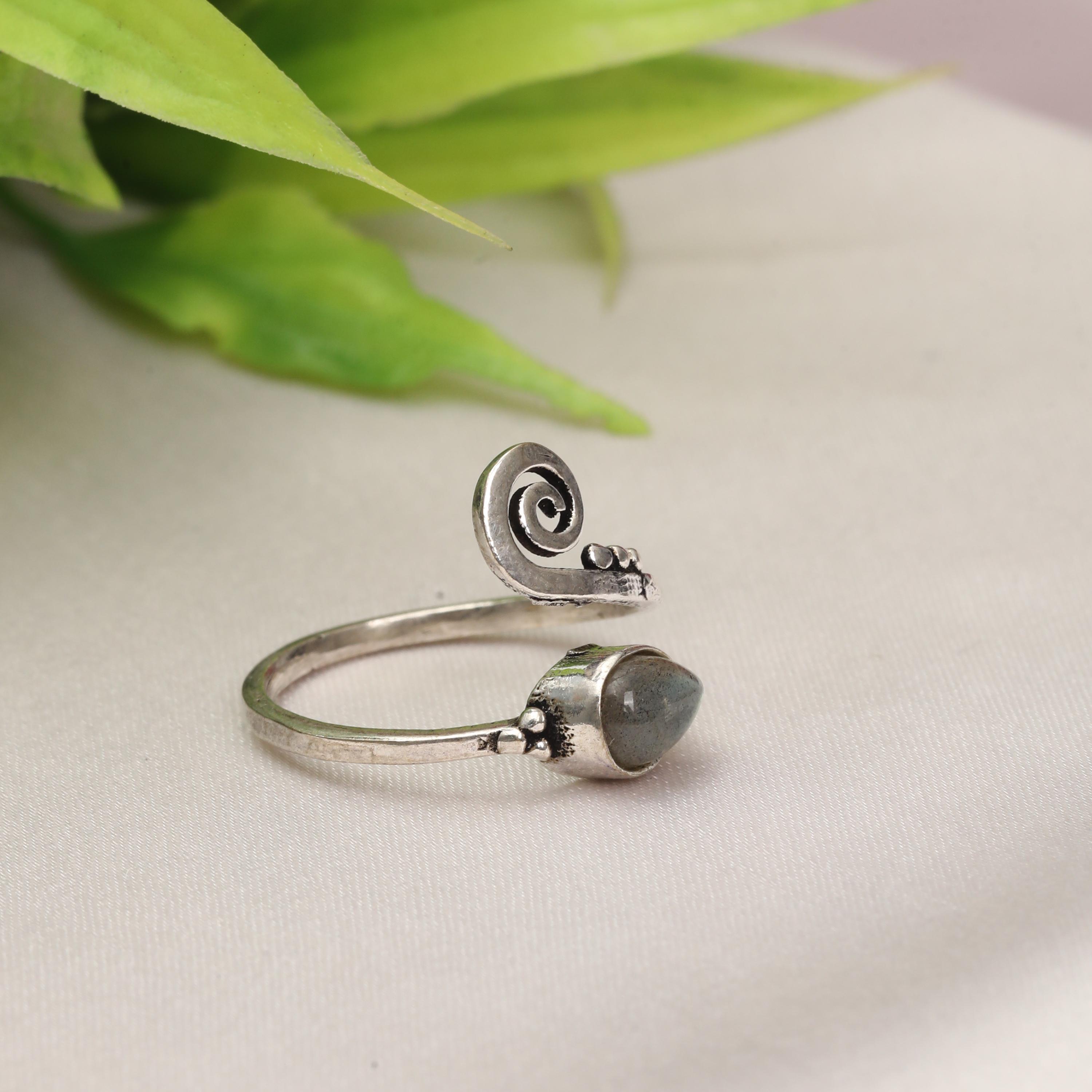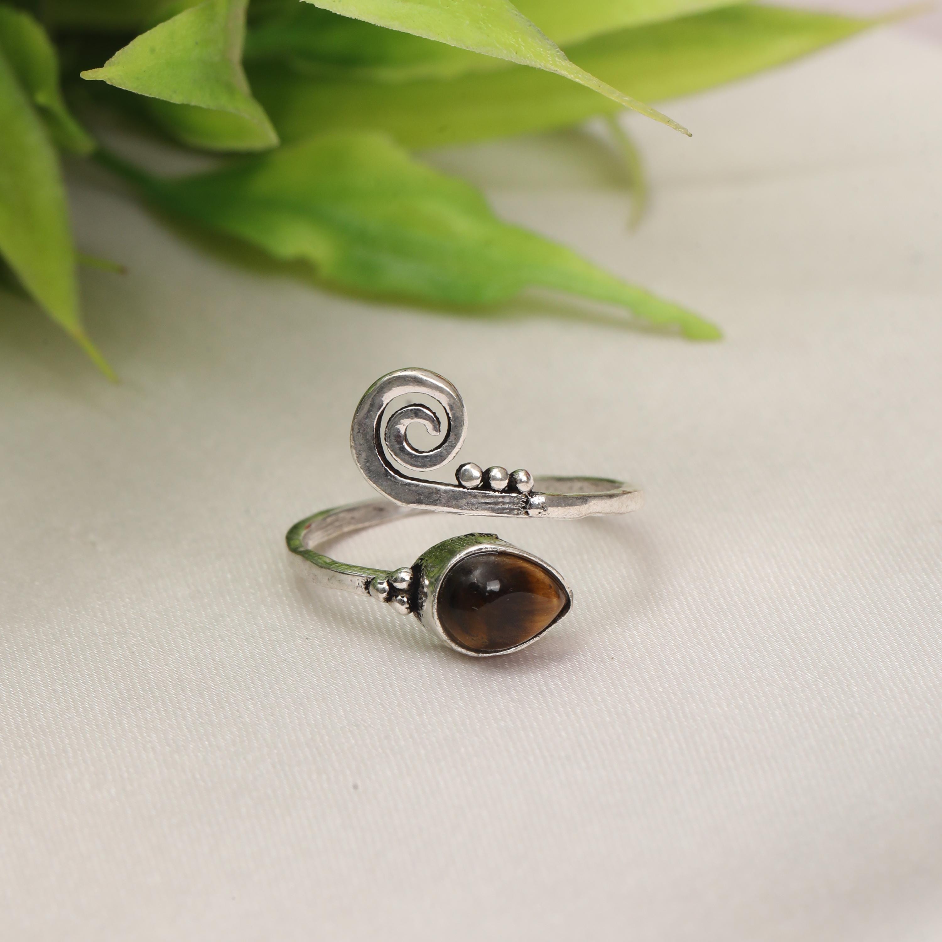 Elegant Adjustable Brass Ring Adorned With A a Drop Shape Gemstone . The Stone is Surmounted by a Spiral.