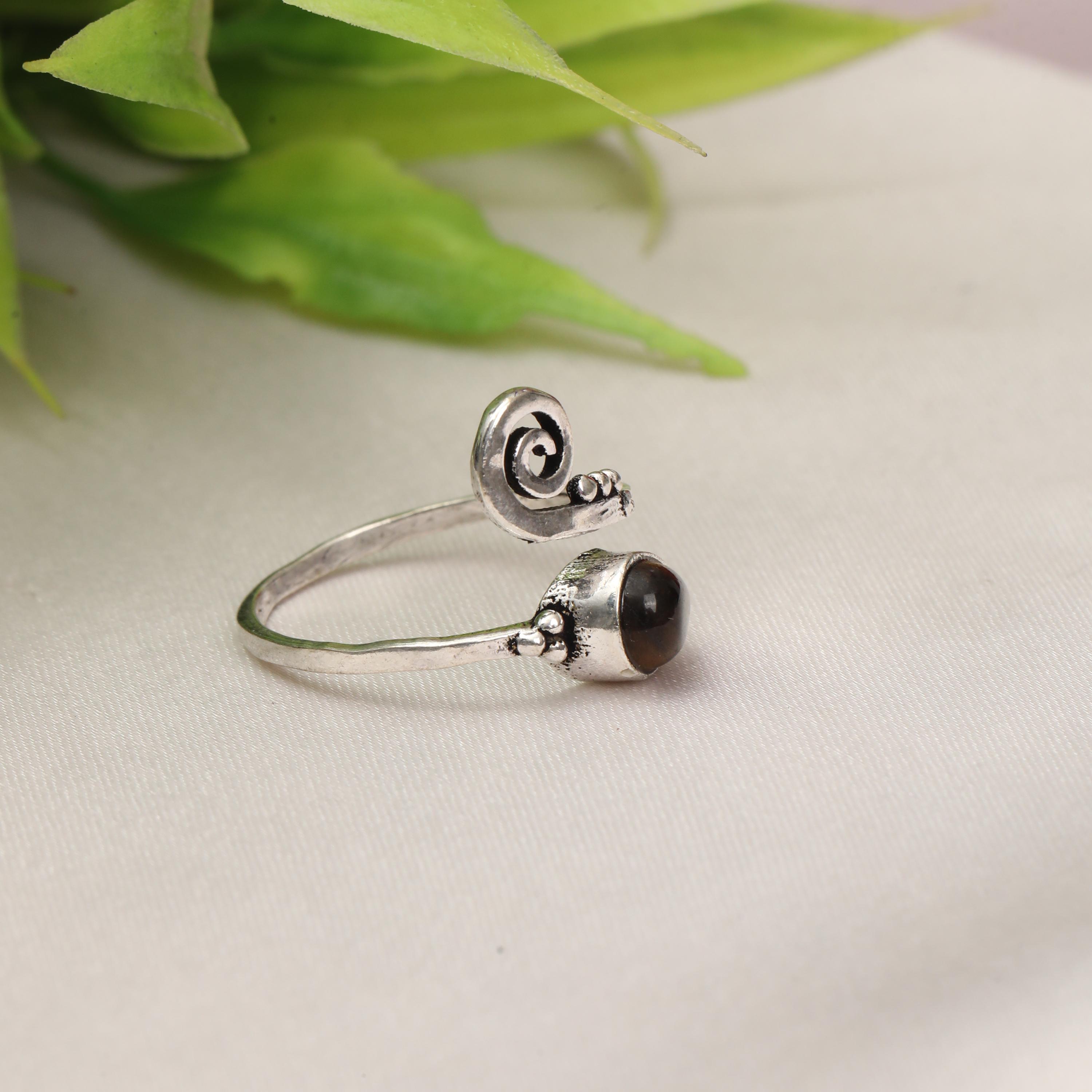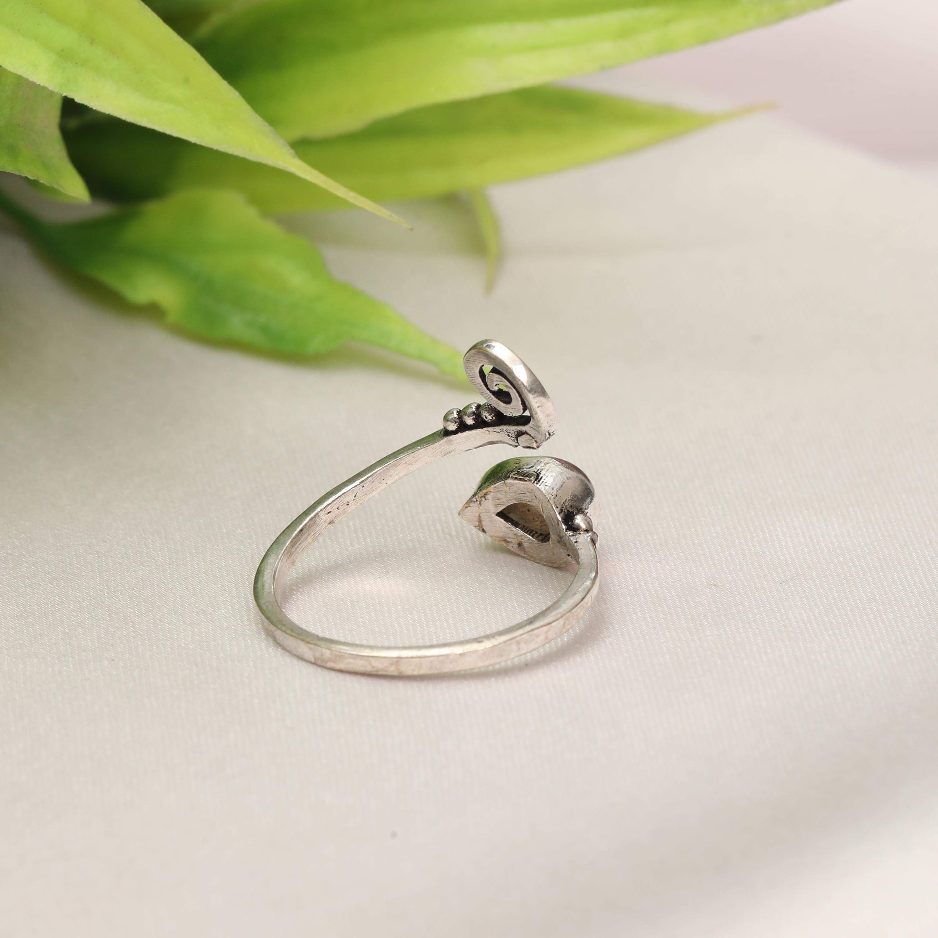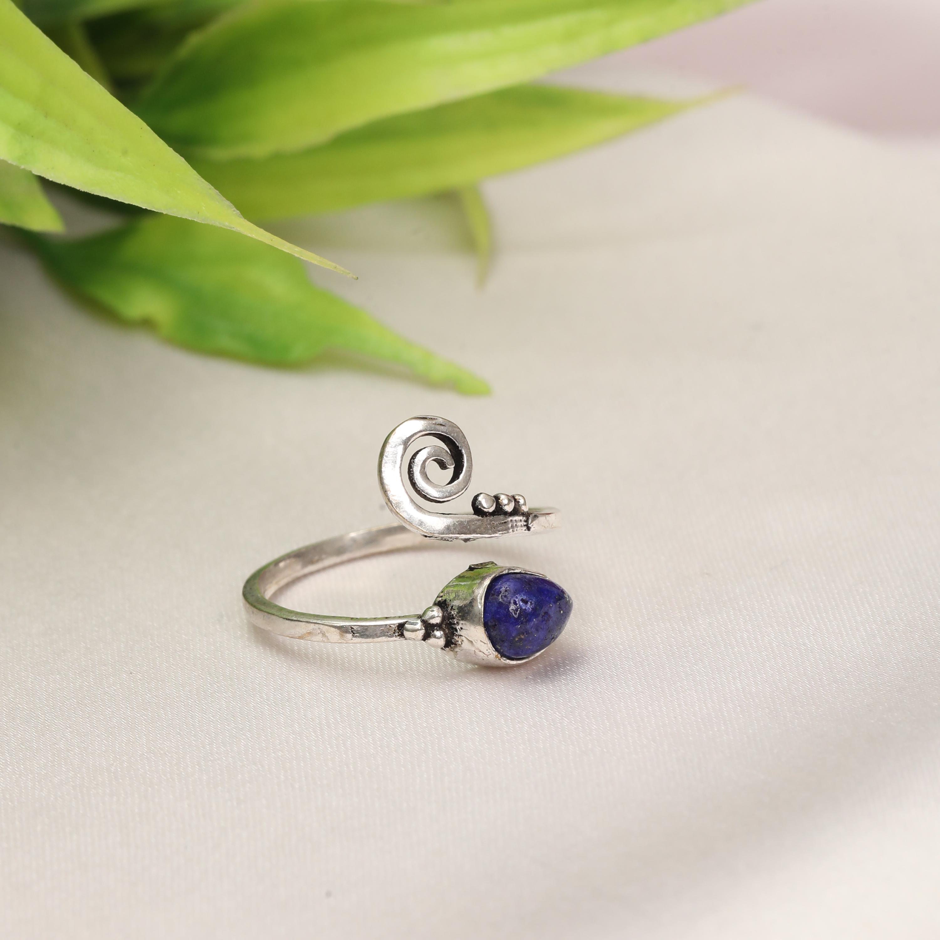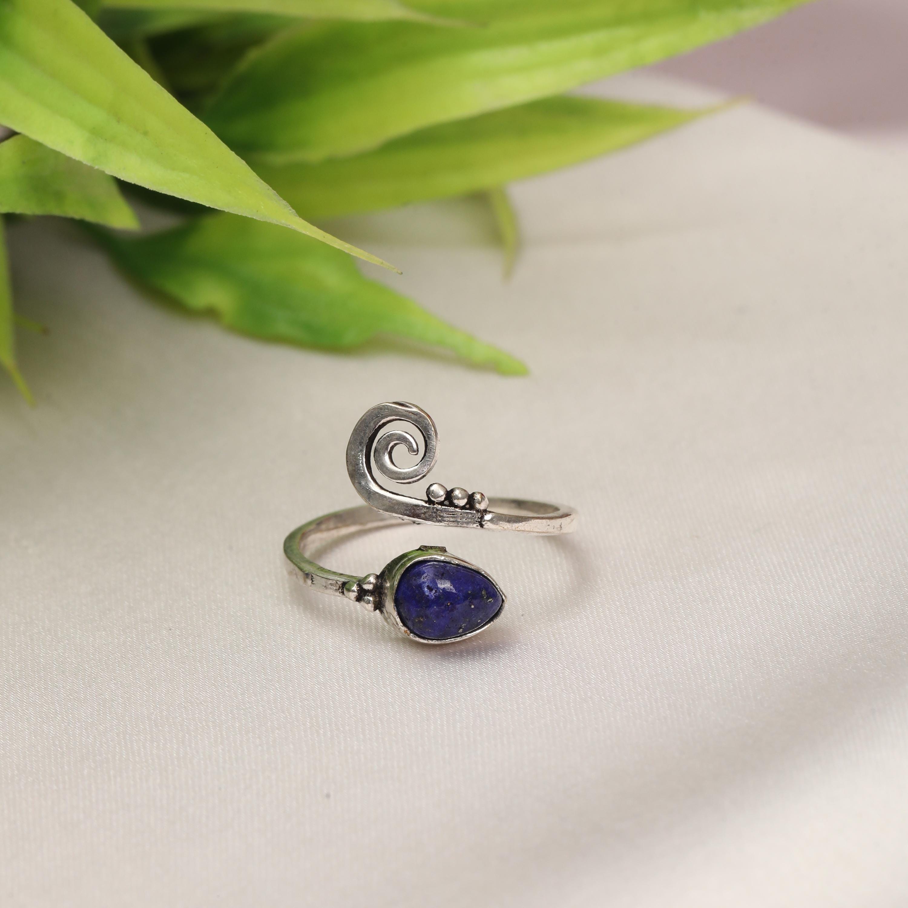 Elegant Adjustable Brass Ring Adorned With A a Drop Shape Gemstone . The Stone is Surmounted by a Spiral.