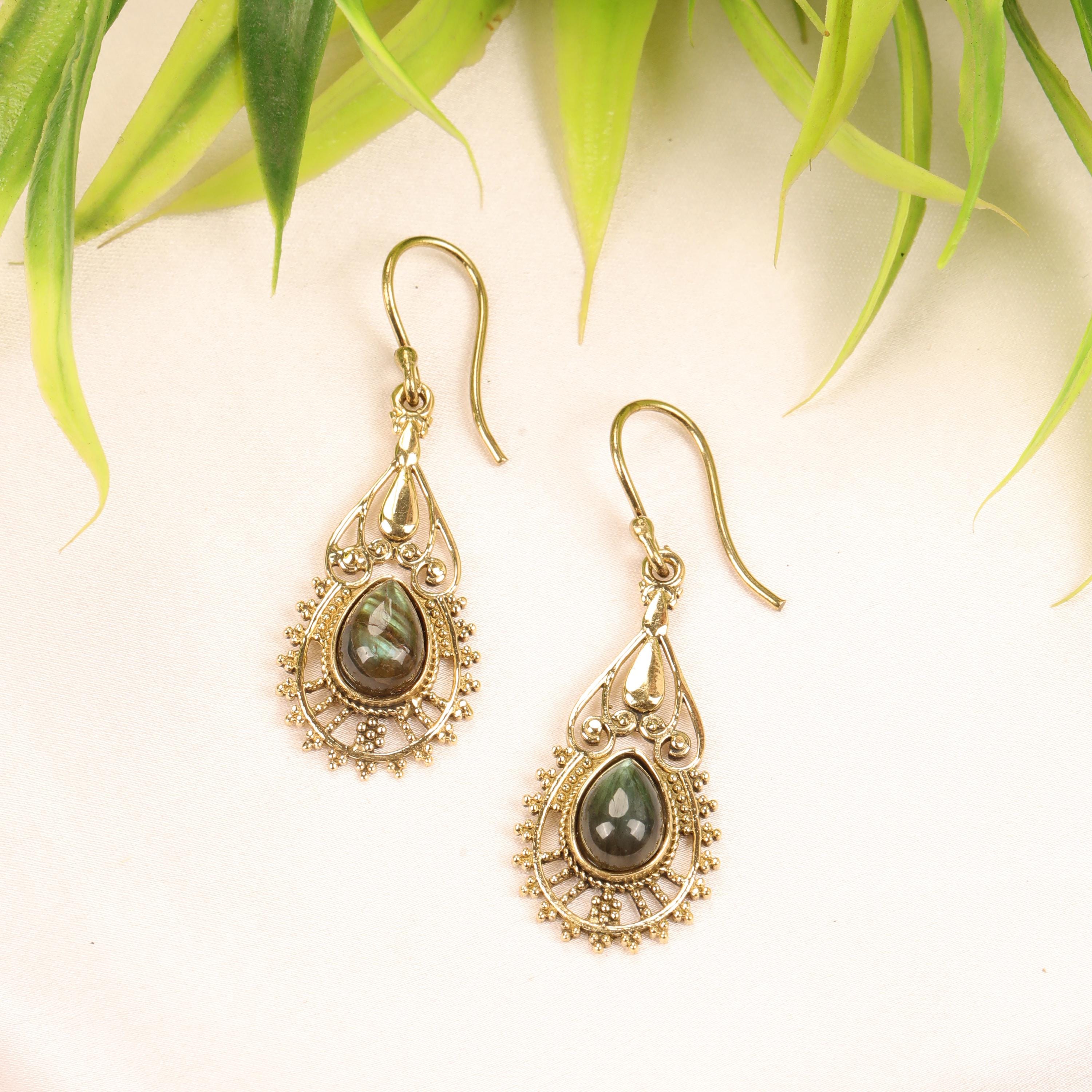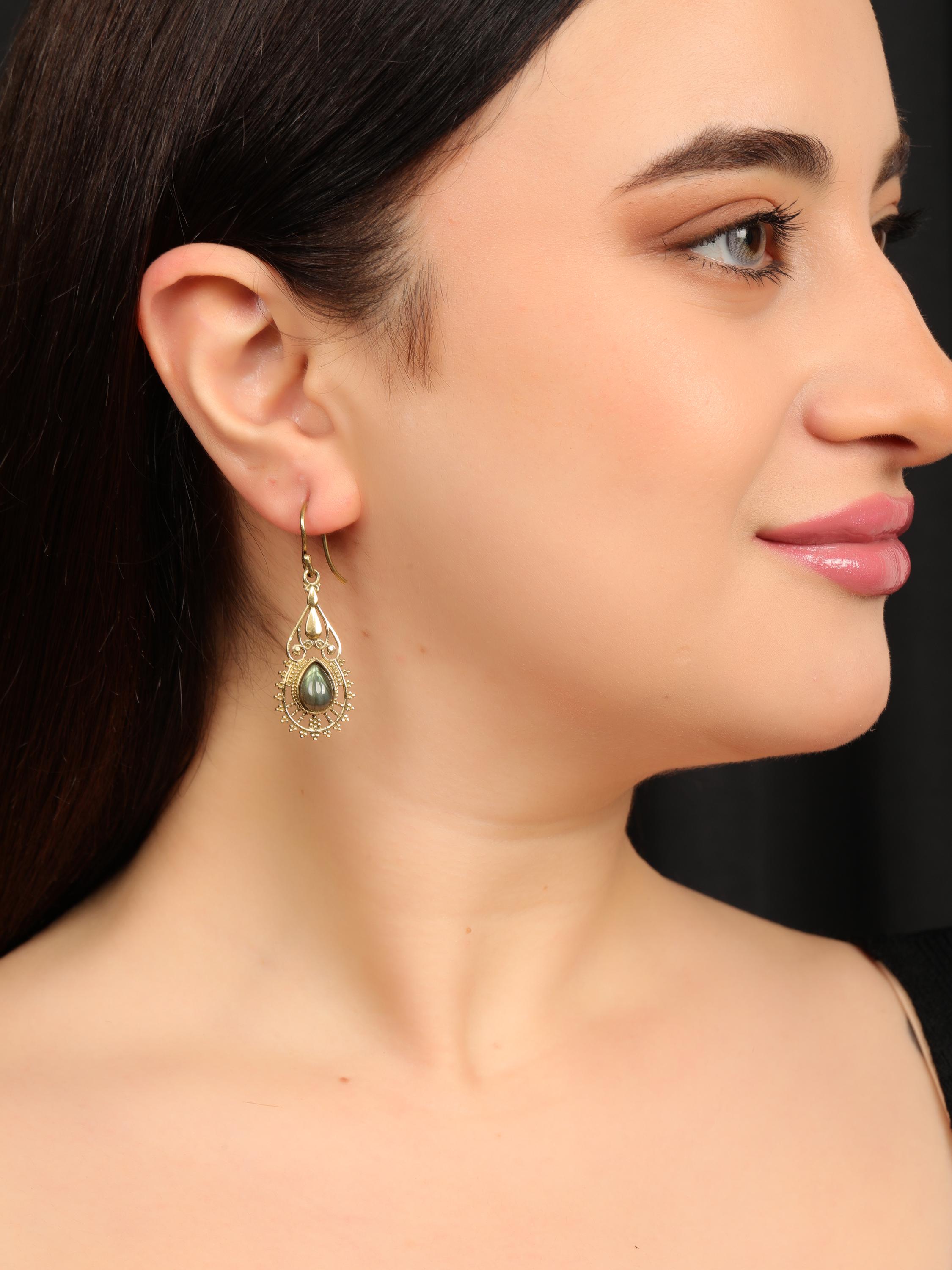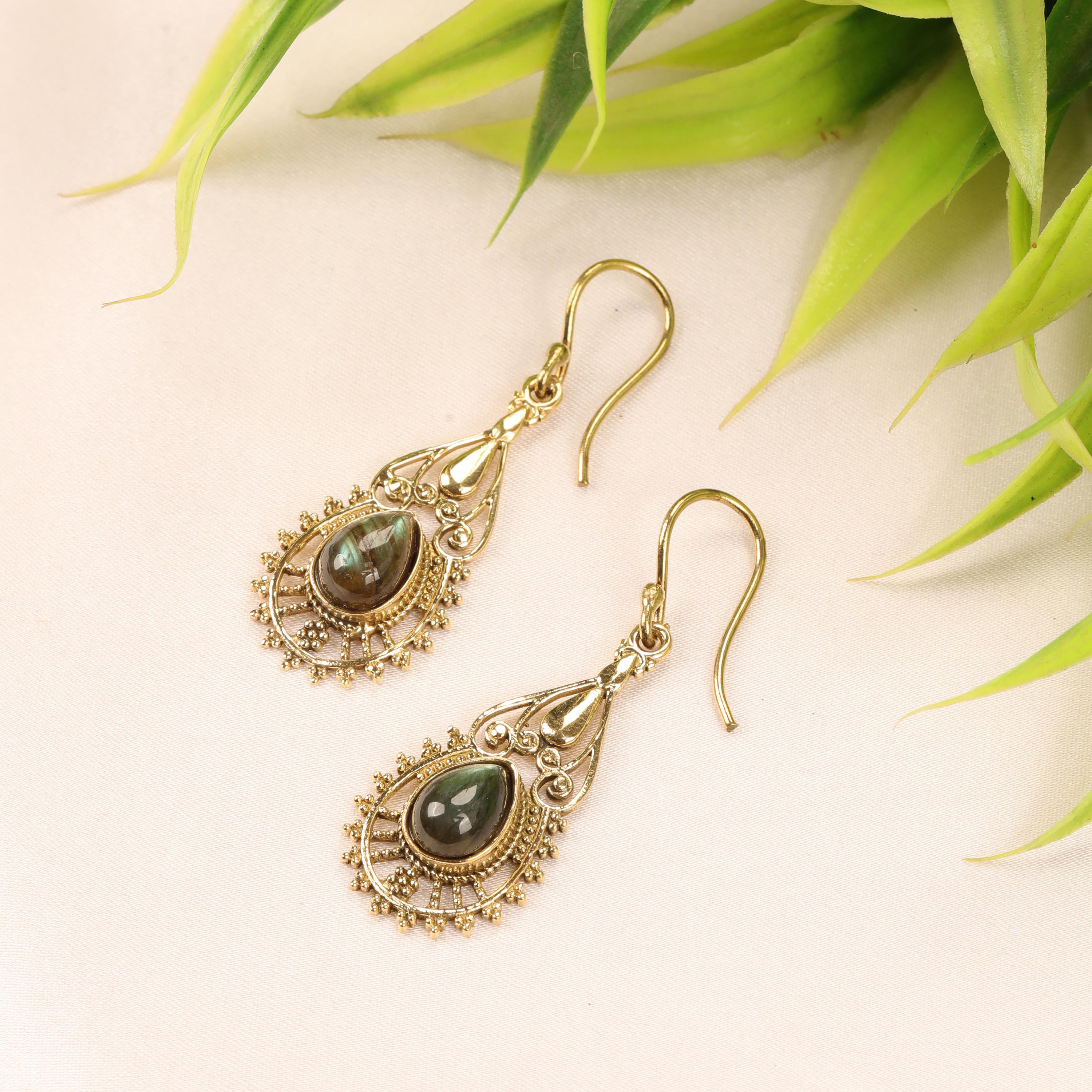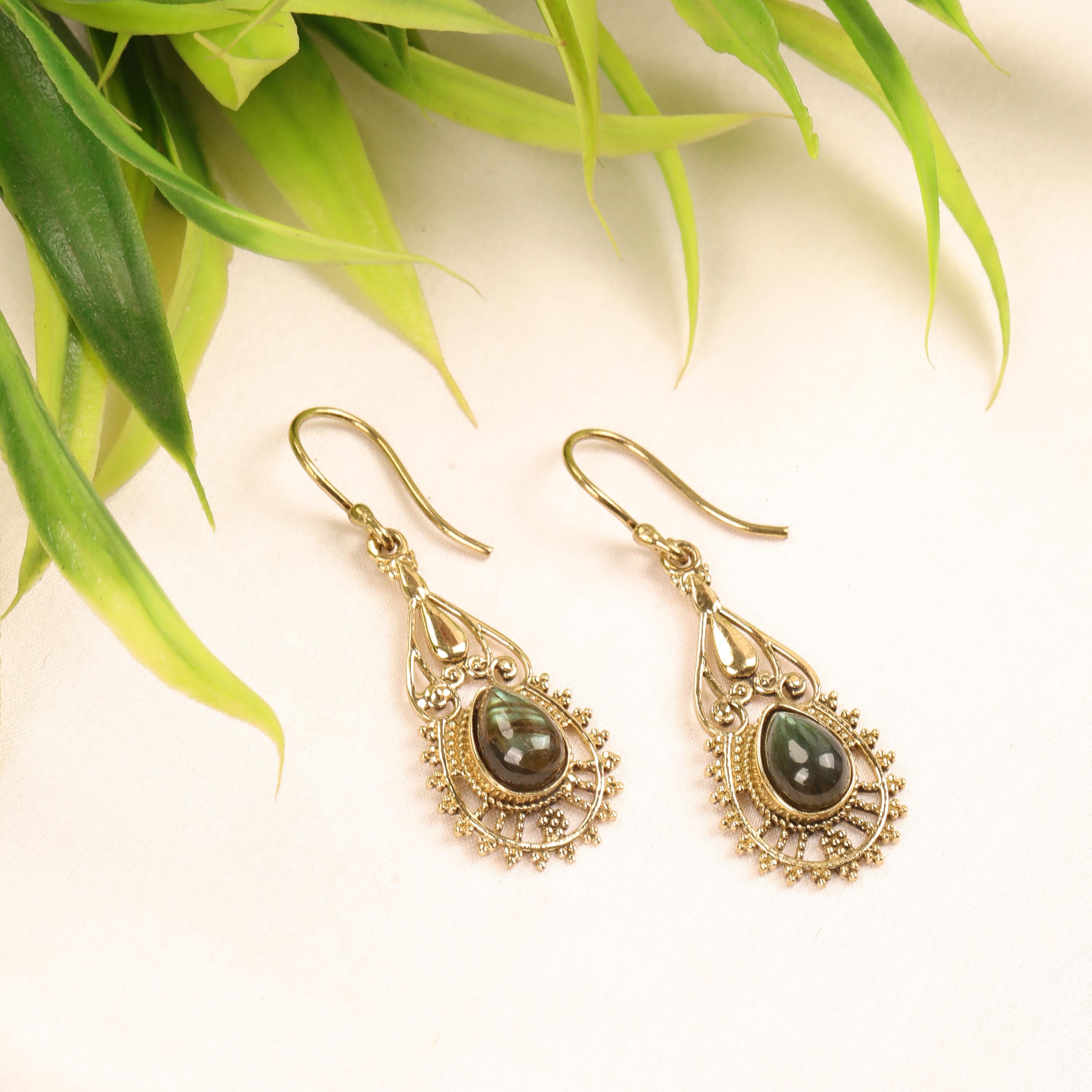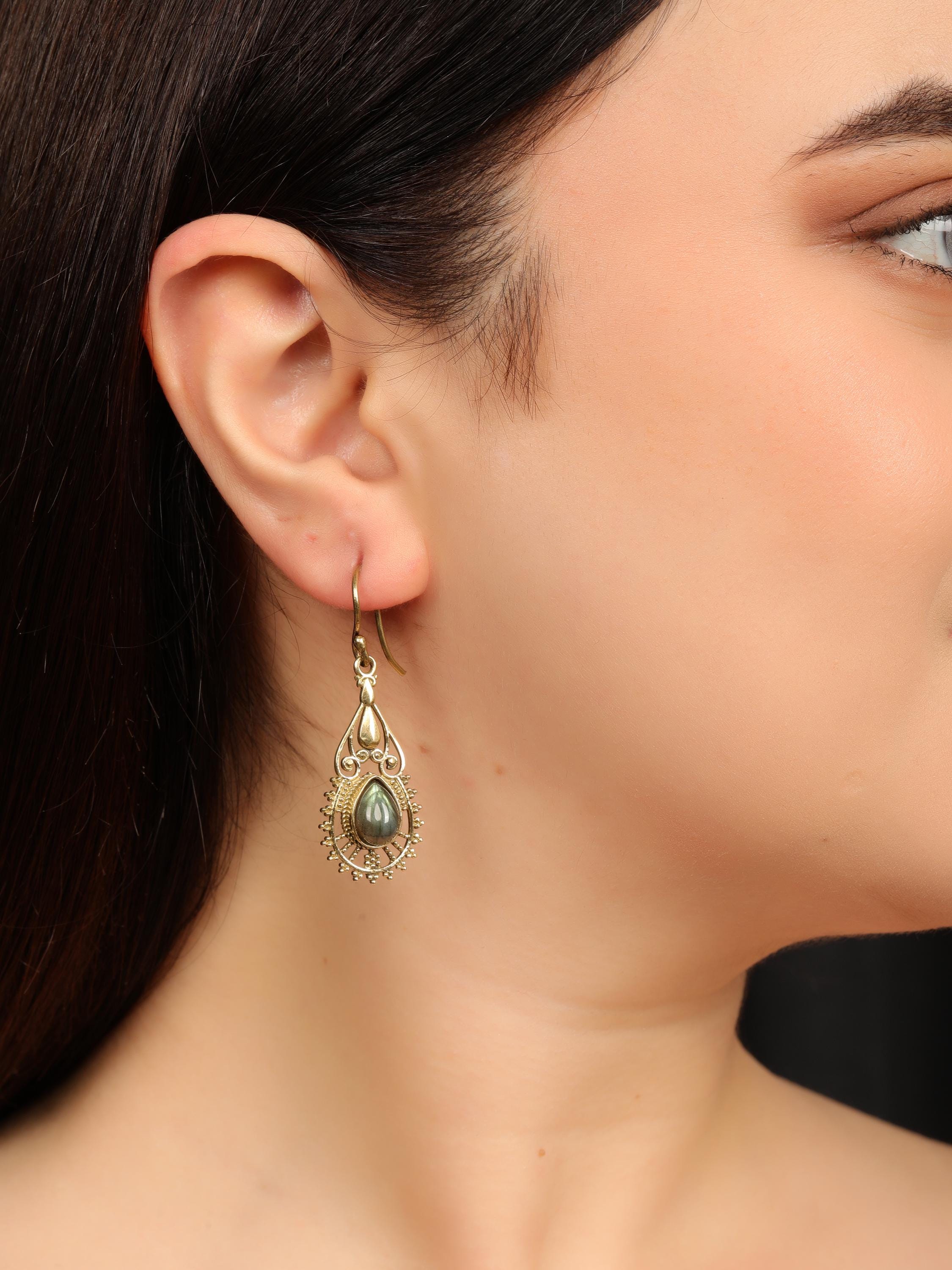 Magnificent Ethnic Dangling Brass Earrings Finely Inscribed And Surmounted by a Cabochon Set With Drop Shaped Semi Precious Stone.