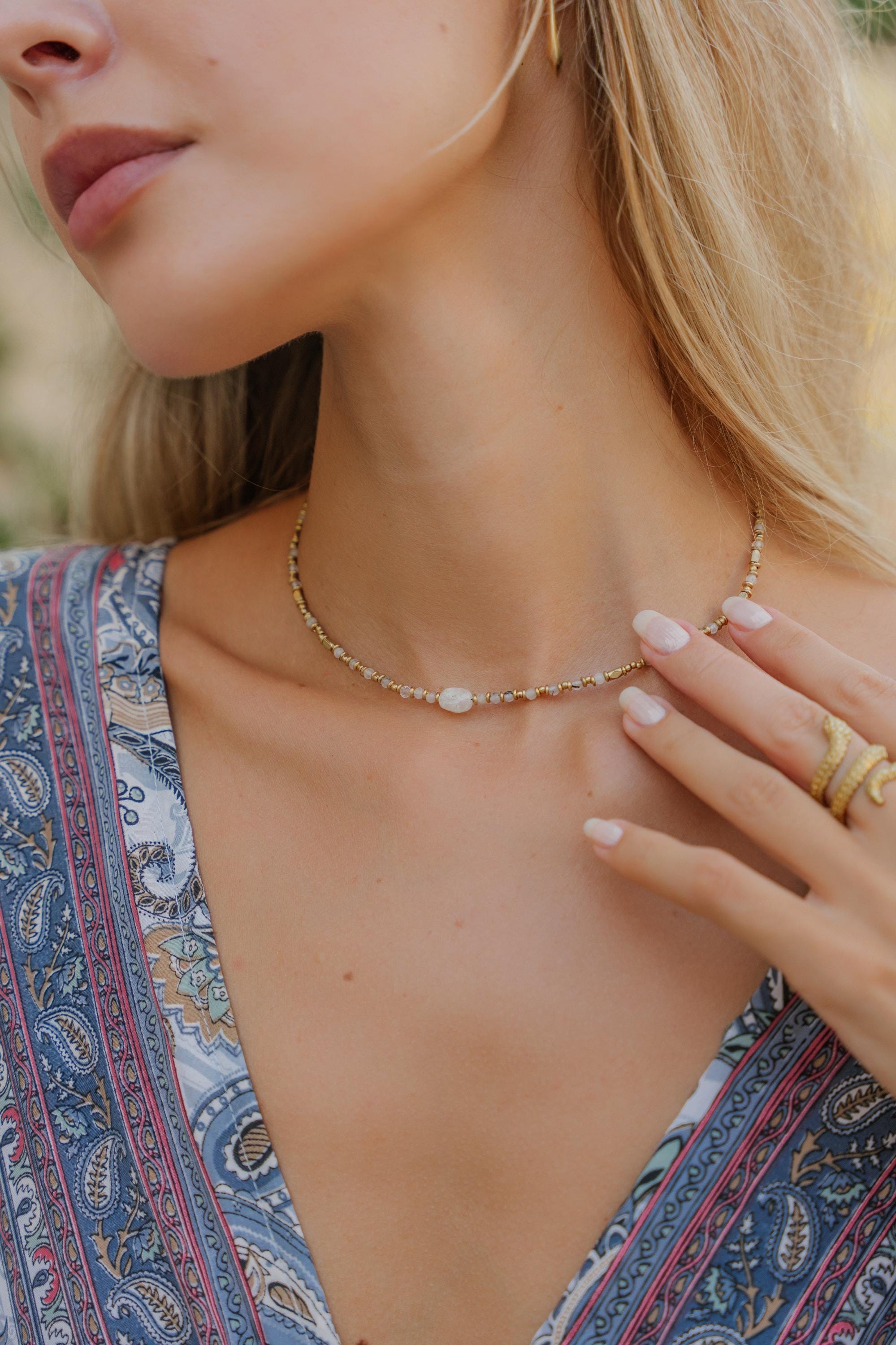 Elegant Necklace made From 2mm Semi Precious Stone Beads and Brass Beads in Different Shapes Strung on Metallic Wire for Durability.