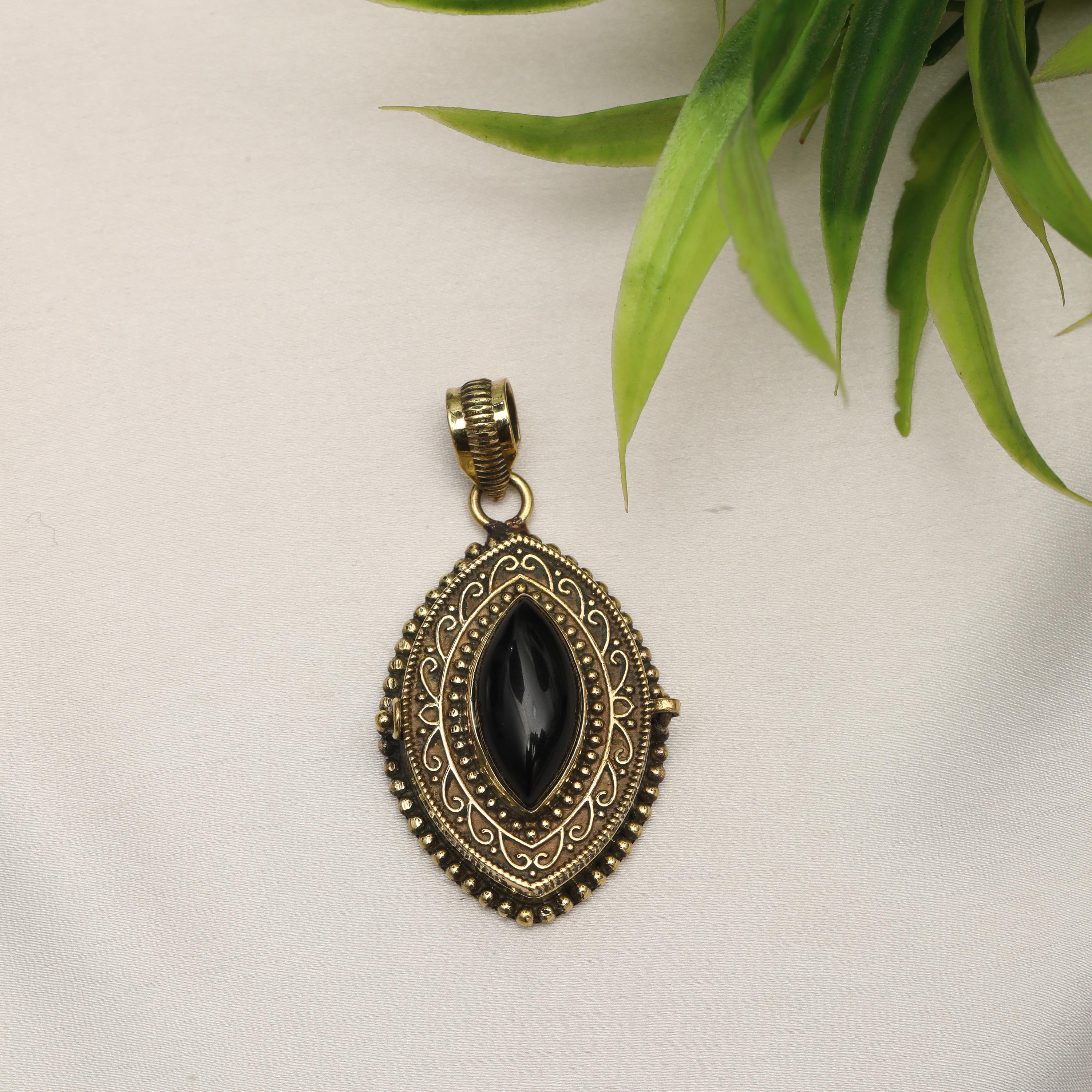 Oval Golden or Silvered Box Pendant in Bohemian Style. This Magnificent Medallion is Delicately Chiselled with Swirls Patterns and a Pretty Oval Cabochon of Semi Precious Stone is Set in the Center.