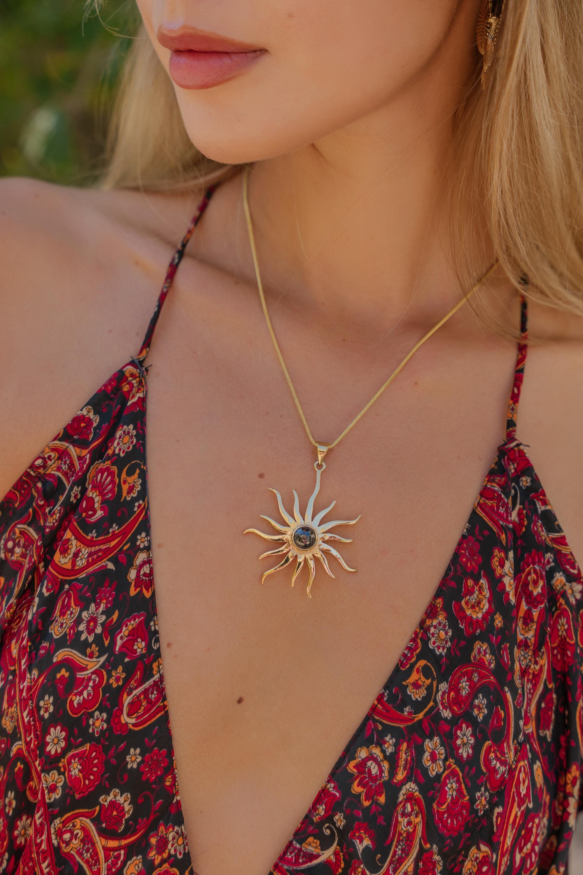 Brass Pendant Adorned with a Semi-Precious Stone Cabochon Representing a Sun