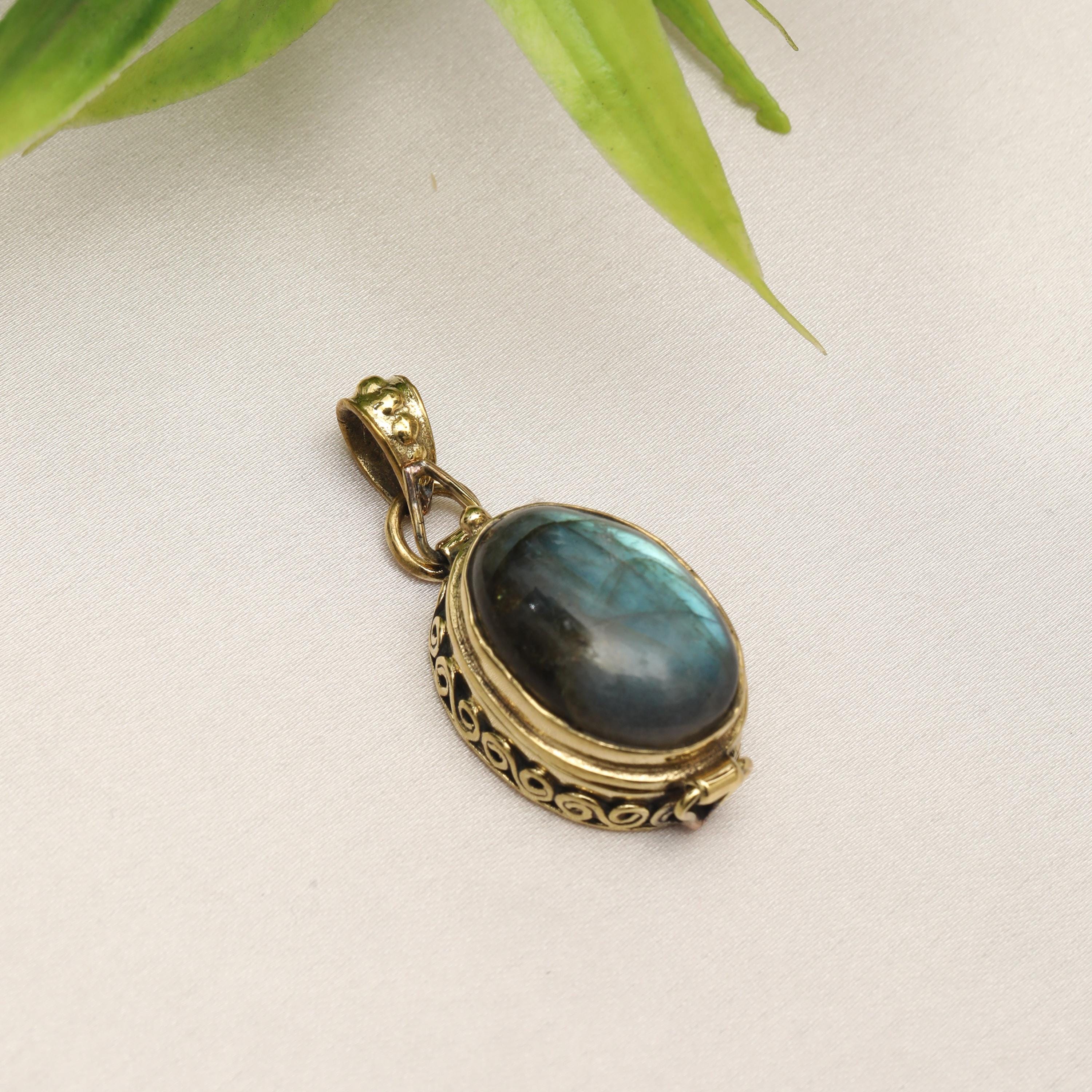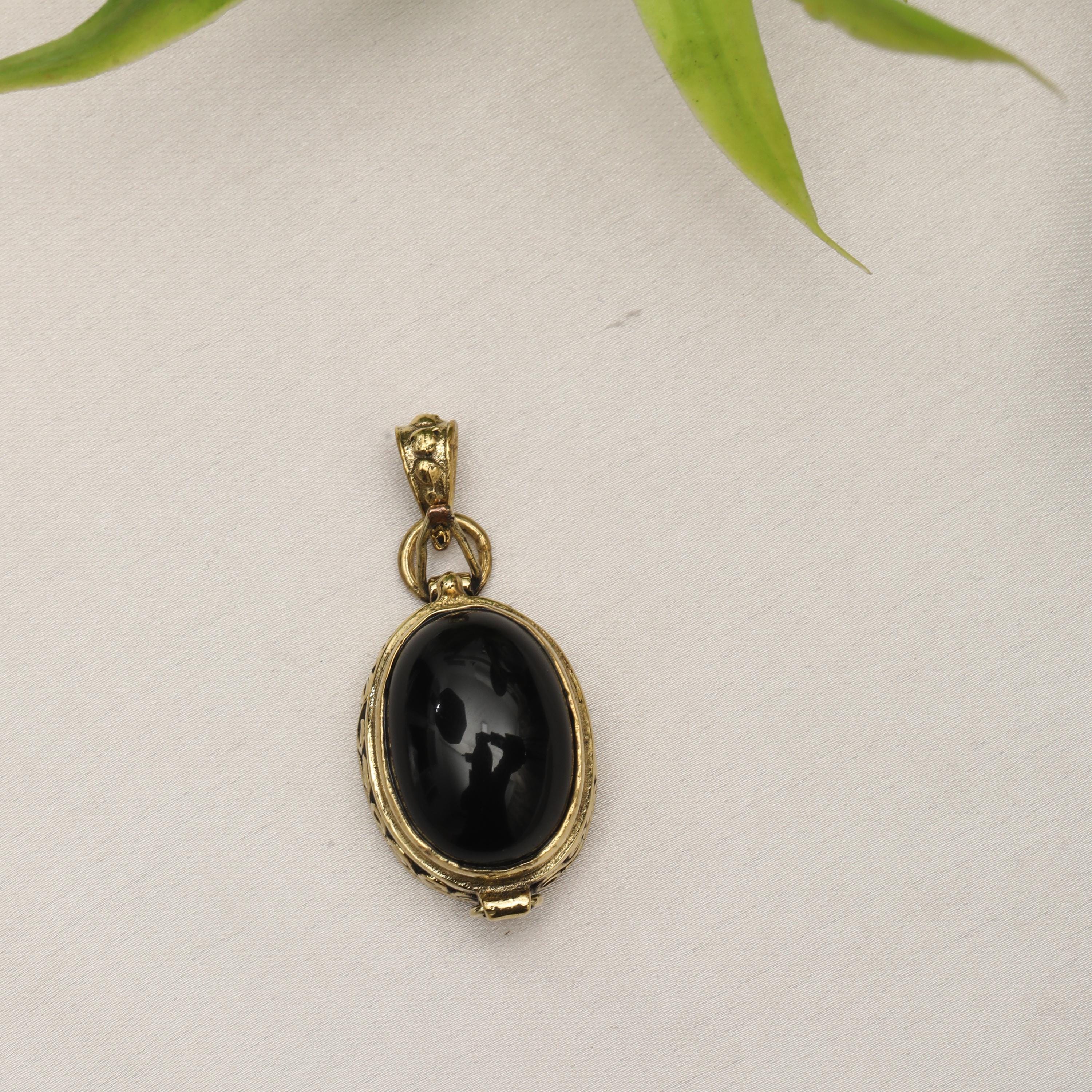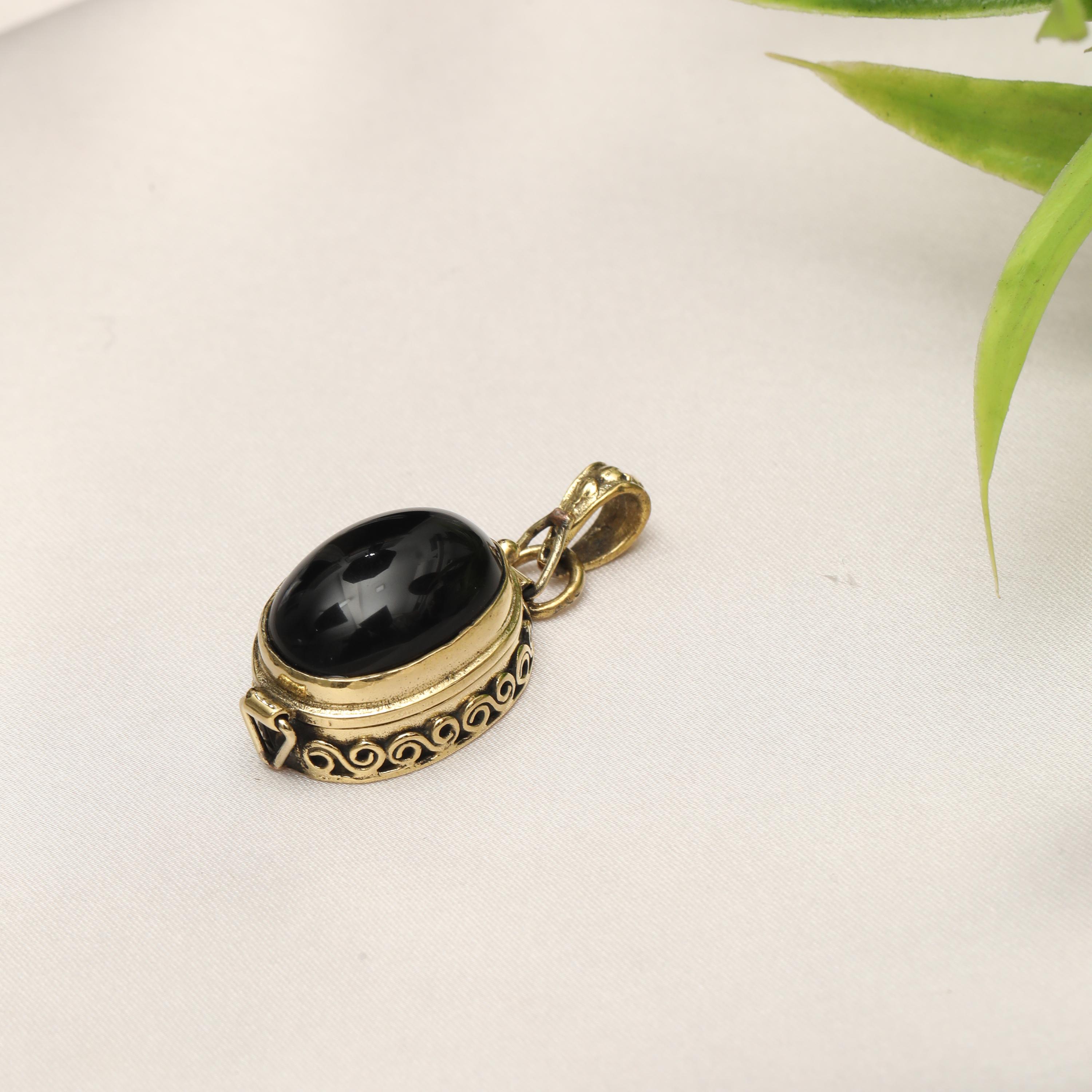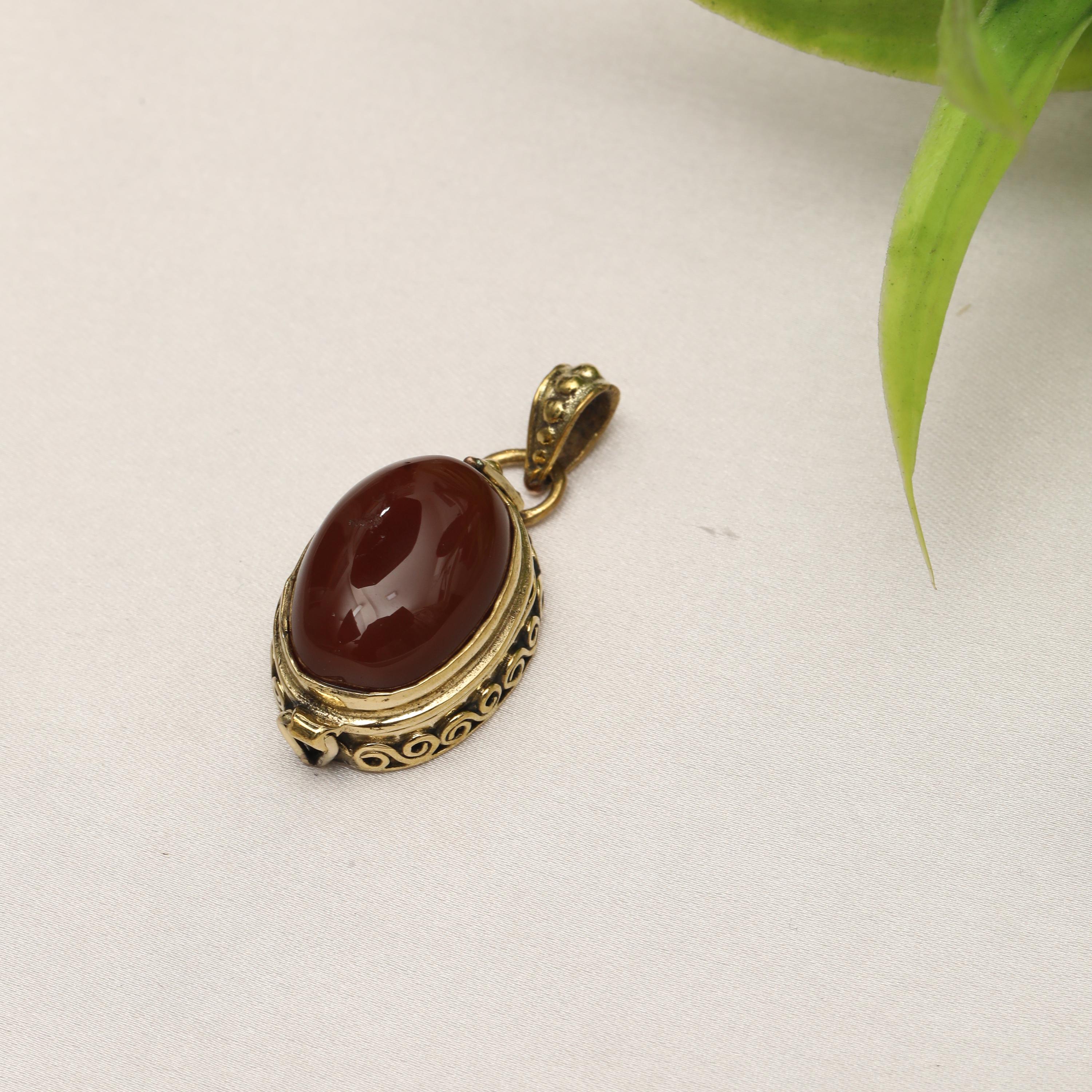 Oval Box Pendant in Bohemian Chic Style. This Magnificent Medallion is Delicately Chiselled with Swirls Patterns and a Pretty Oval Cabochon of Semi Precious Stone is Set in the Center. This Pendant is made of Brass and is a Box Which Opens You Can Insert a Photo, a Talisman, a Prayer or a Small Precious Object.