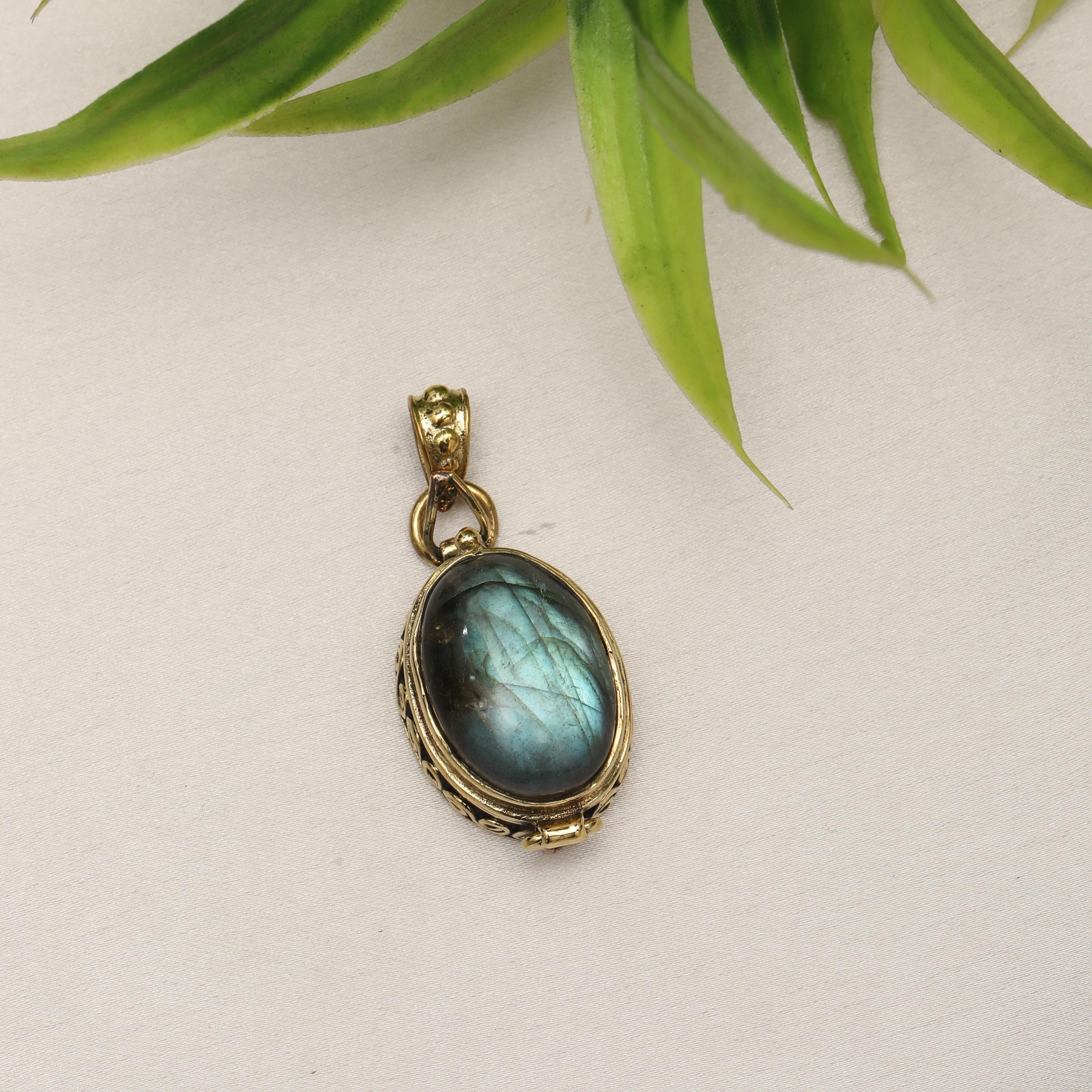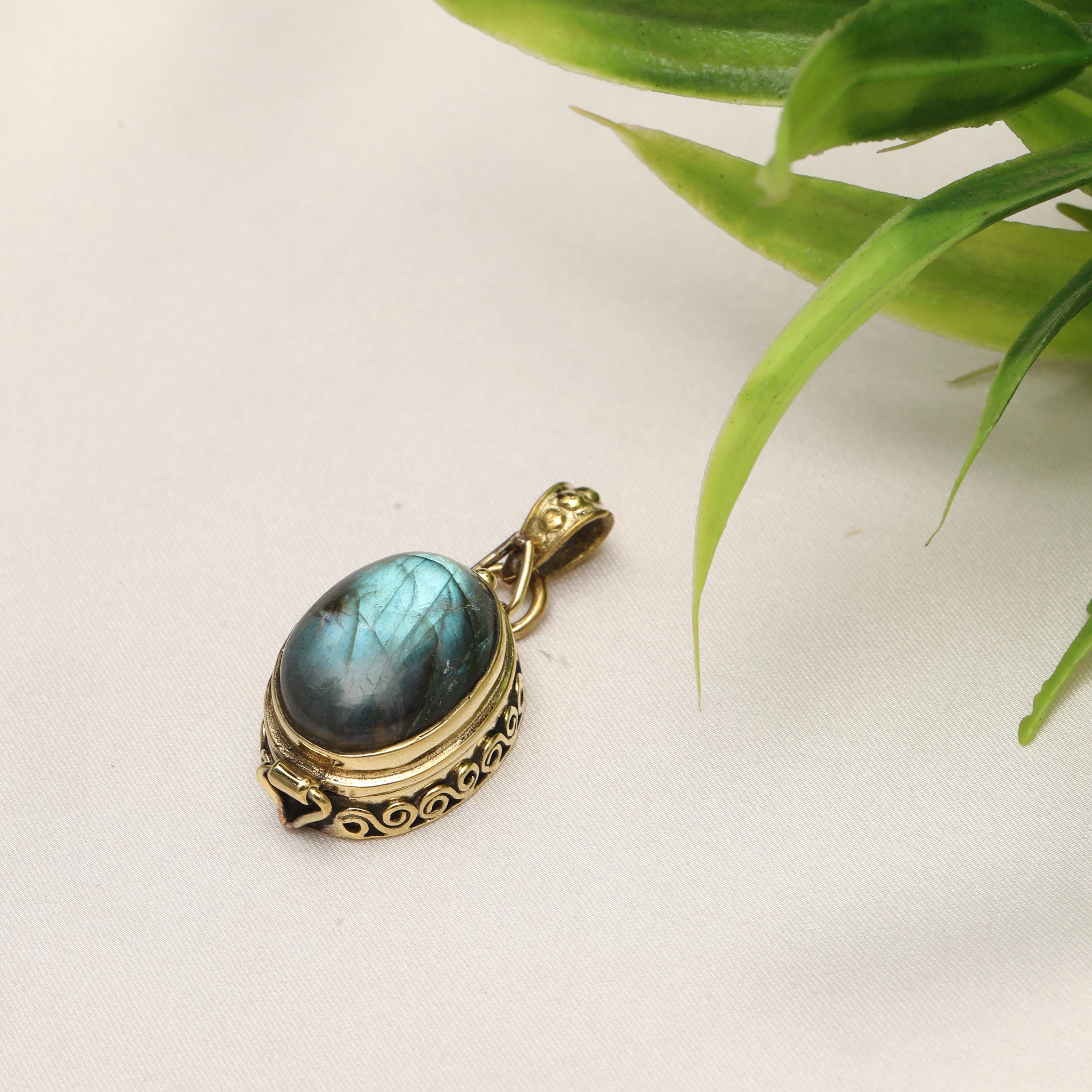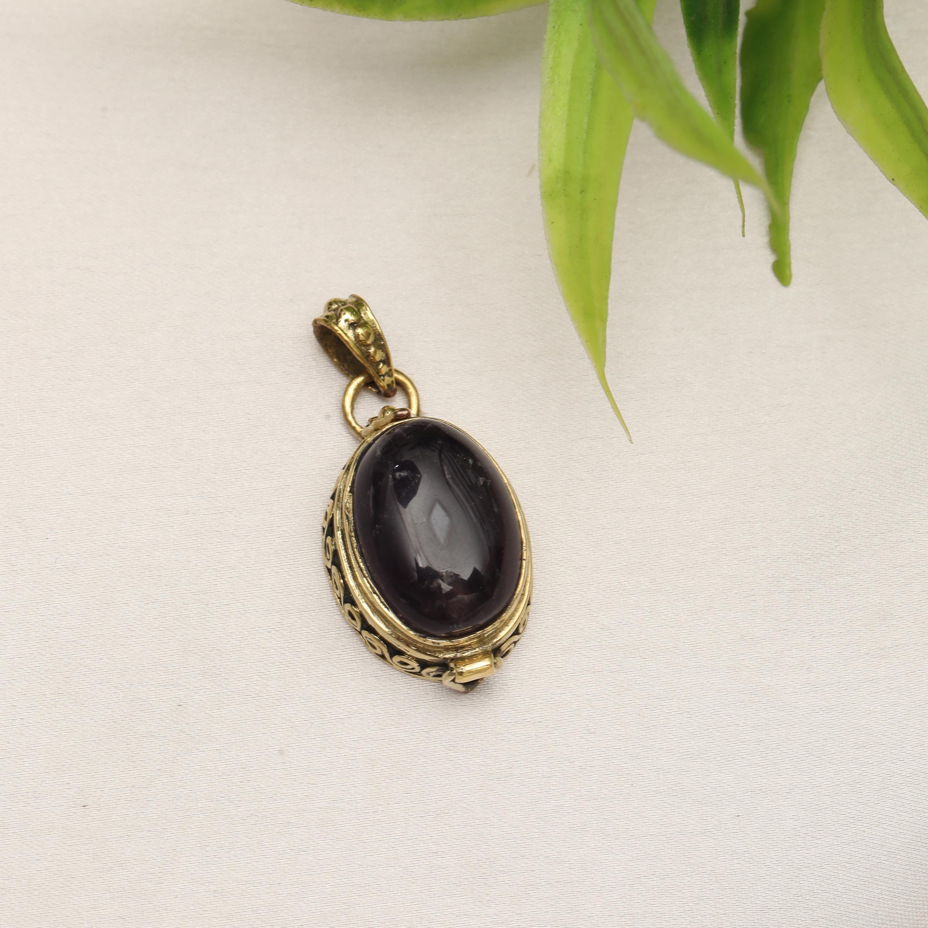 Oval Box Pendant in Bohemian Chic Style. This Magnificent Medallion is Delicately Chiselled with Swirls Patterns and a Pretty Oval Cabochon of Semi Precious Stone is Set in the Center. This Pendant is made of Brass and is a Box Which Opens You Can Insert a Photo, a Talisman, a Prayer or a Small Precious Object.