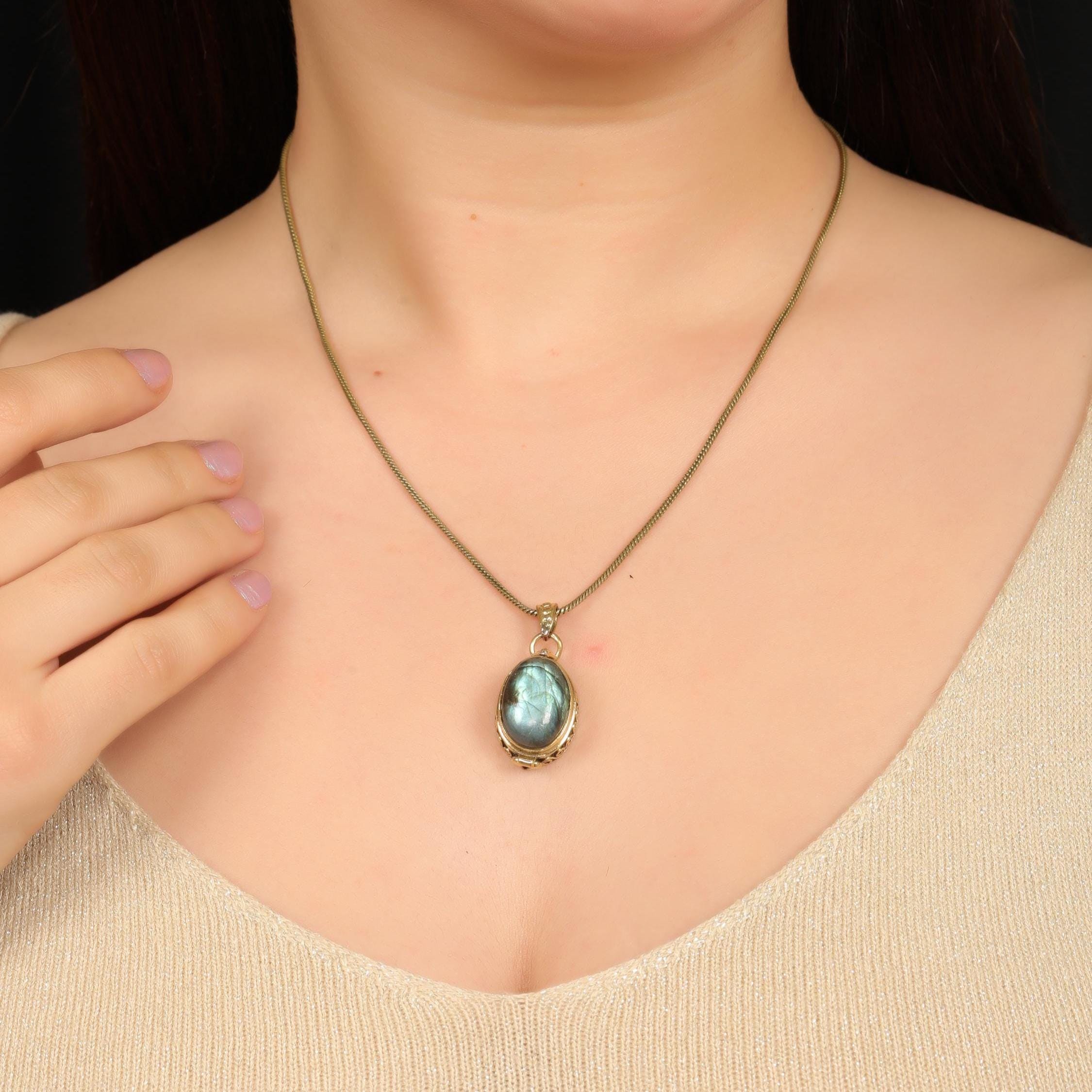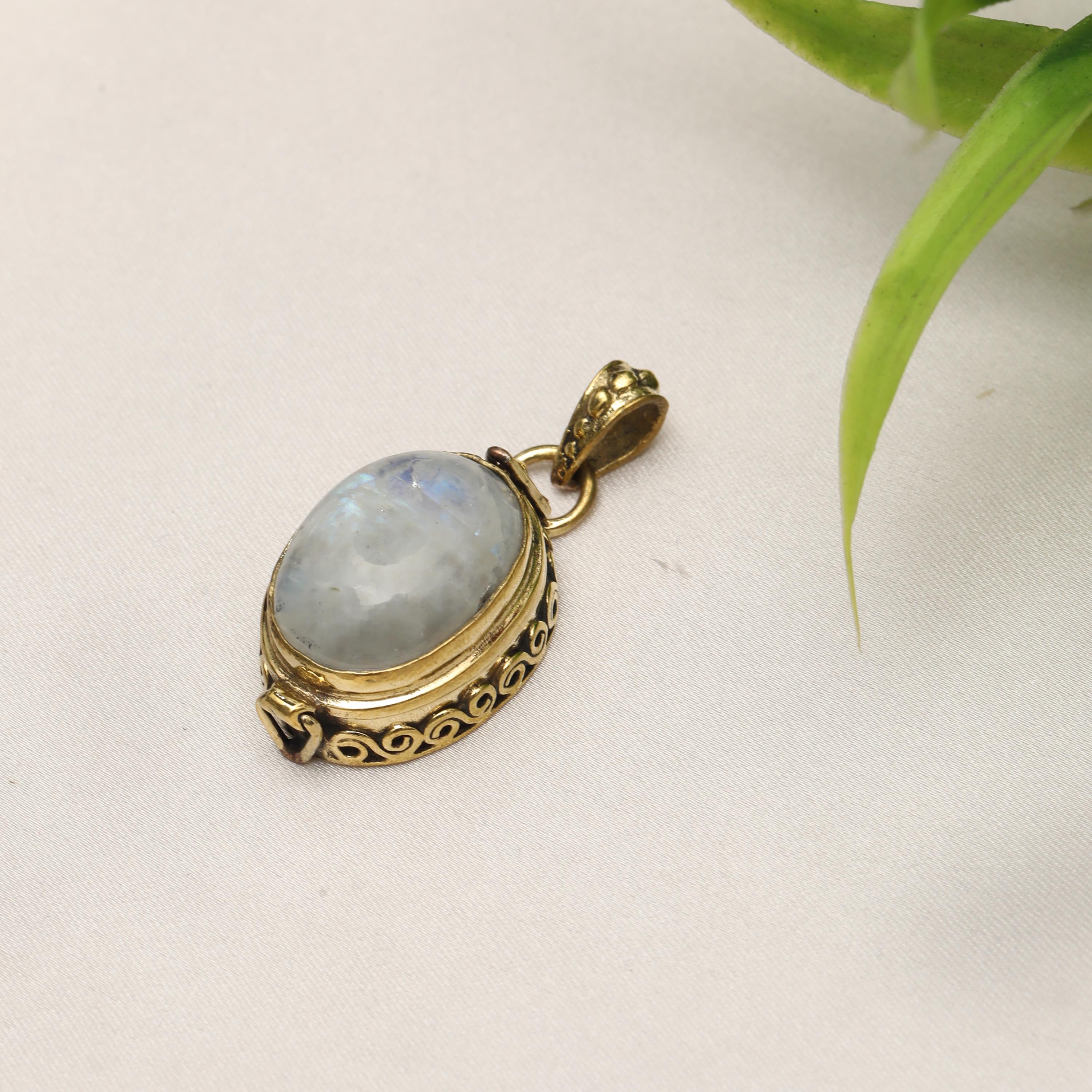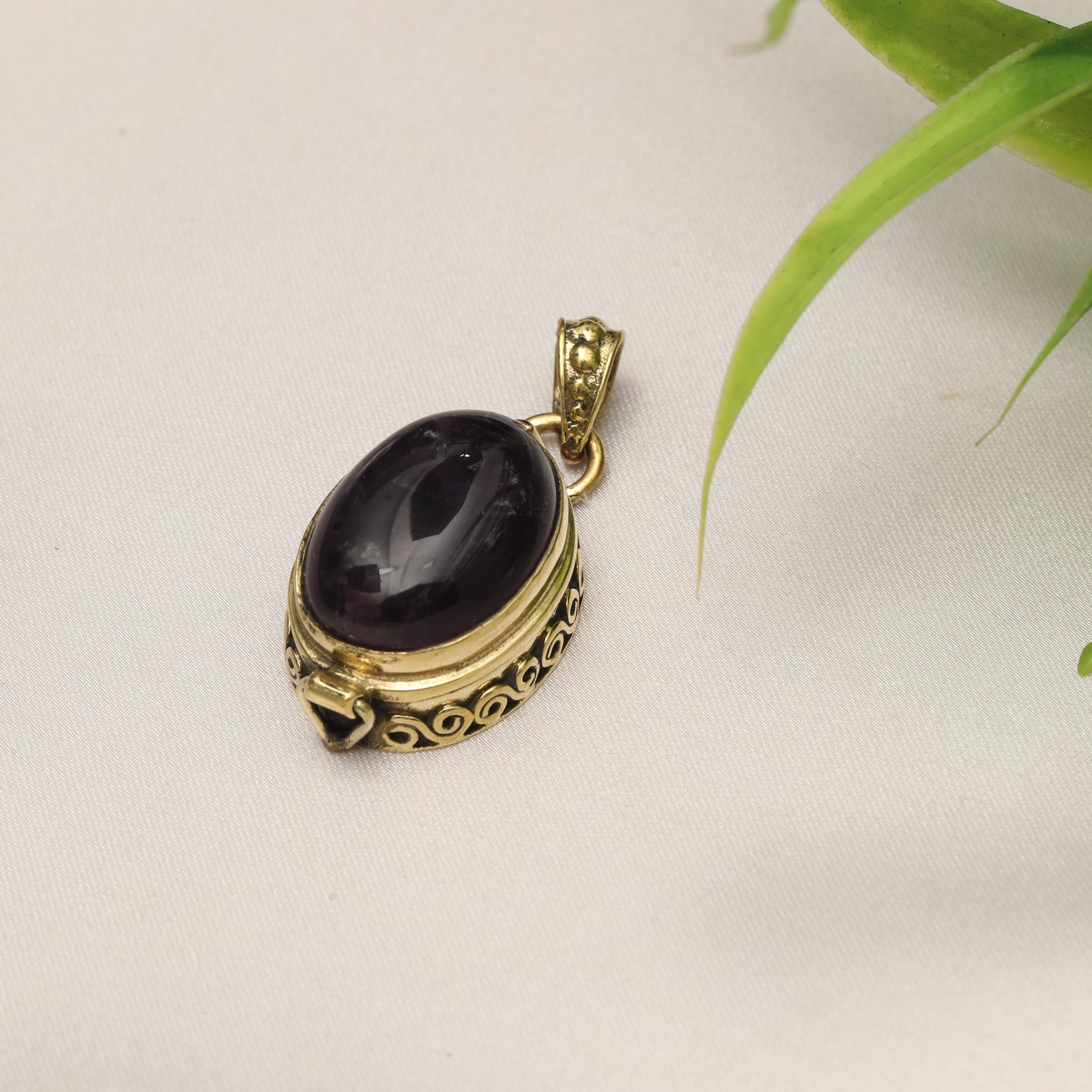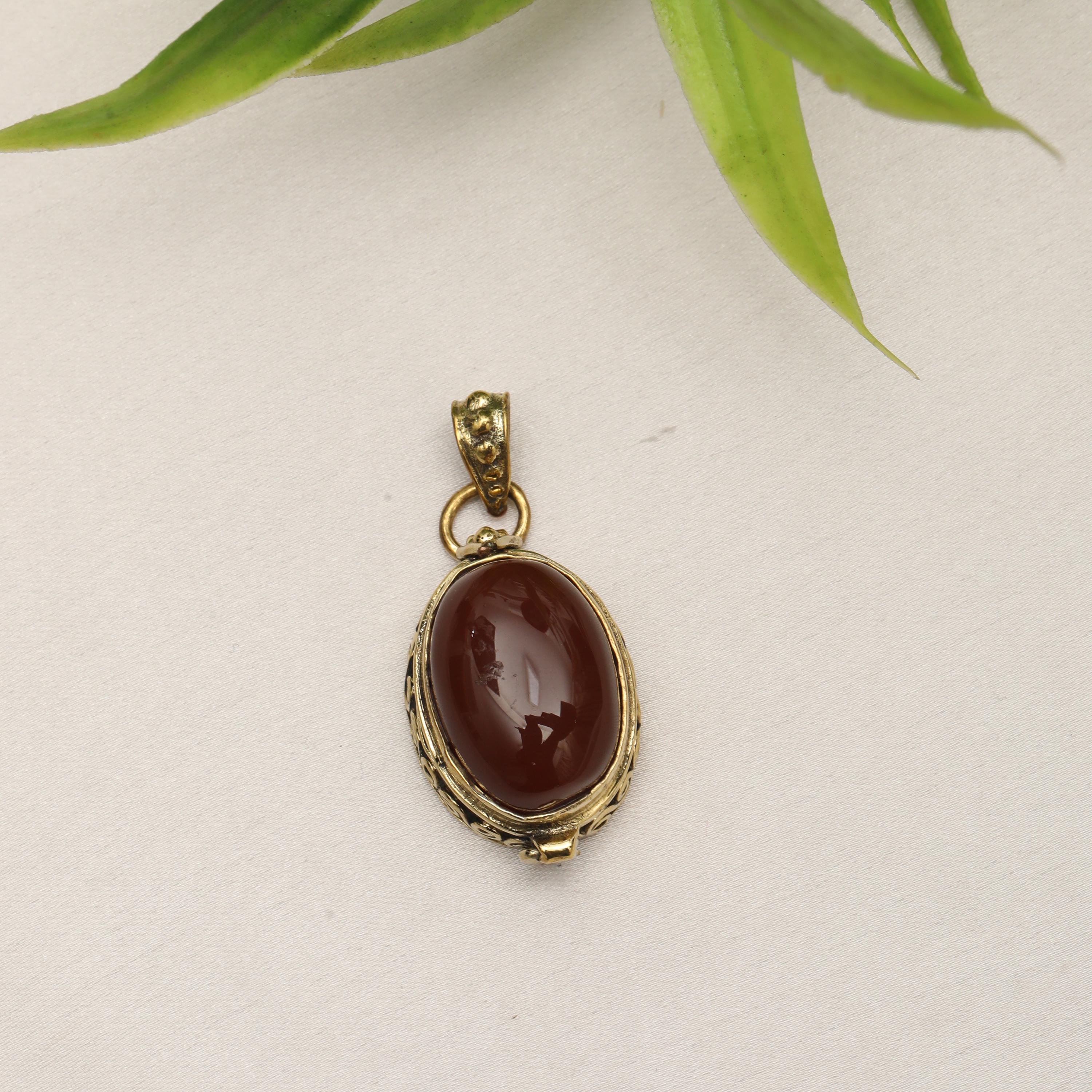 Oval Box Pendant in Bohemian Chic Style. This Magnificent Medallion is Delicately Chiselled with Swirls Patterns and a Pretty Oval Cabochon of Semi Precious Stone is Set in the Center. This Pendant is made of Brass and is a Box Which Opens You Can Insert a Photo, a Talisman, a Prayer or a Small Precious Object.