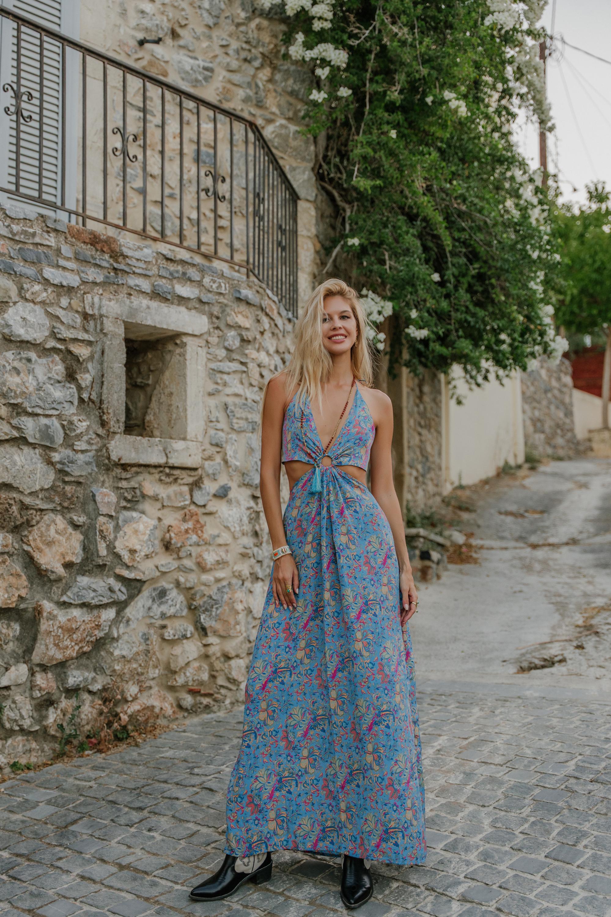 This long, backless dress is crafted from a soft and flowing polyester fabric, adorned with a vibrant floral print. The halter neckline highlights your shoulders, leading to a dramatically open back.