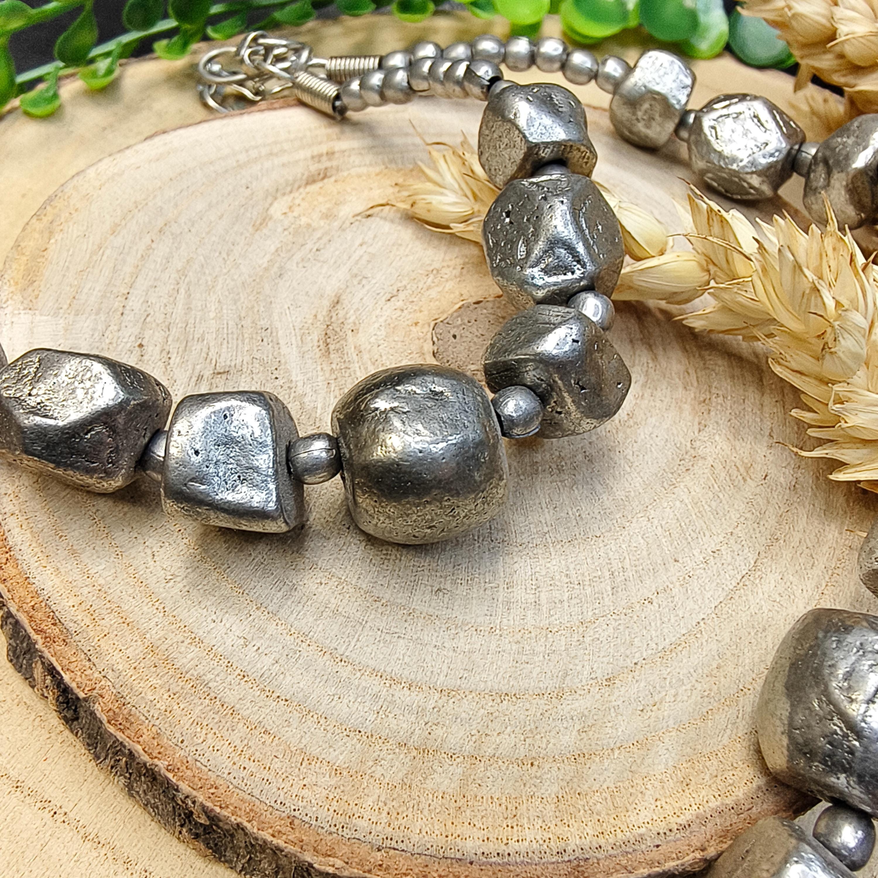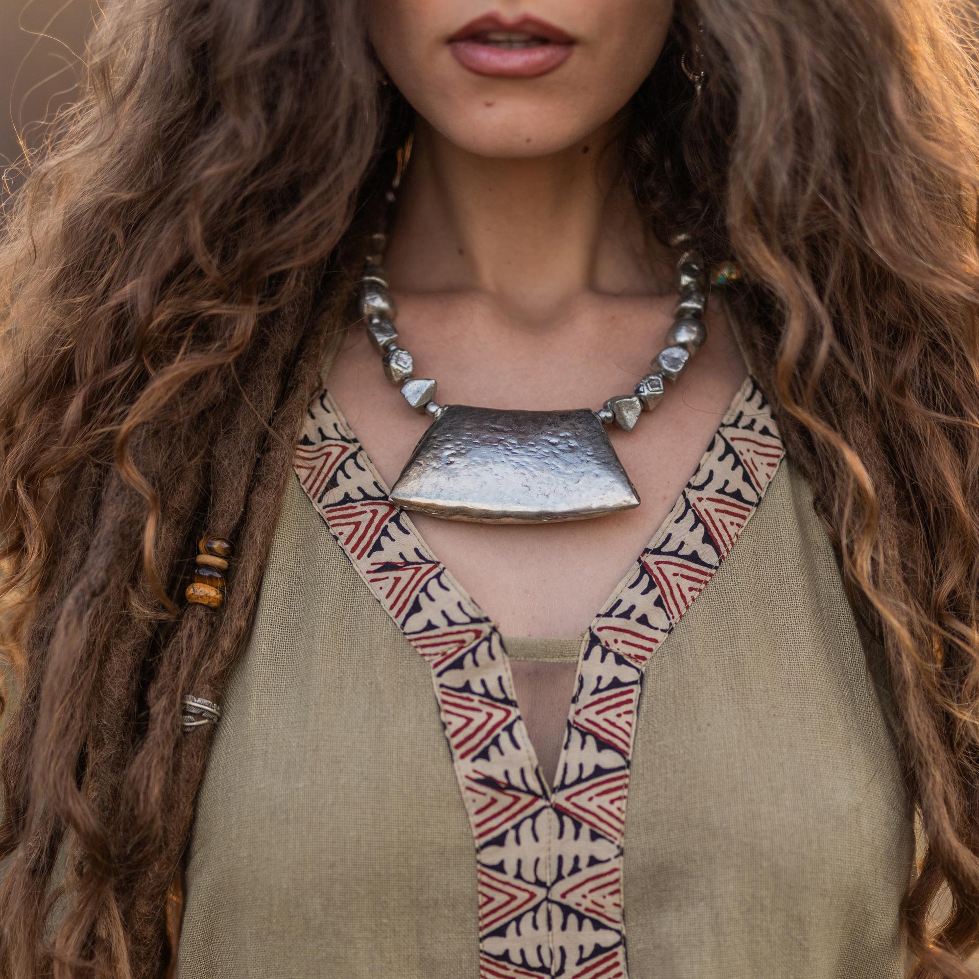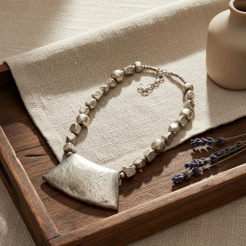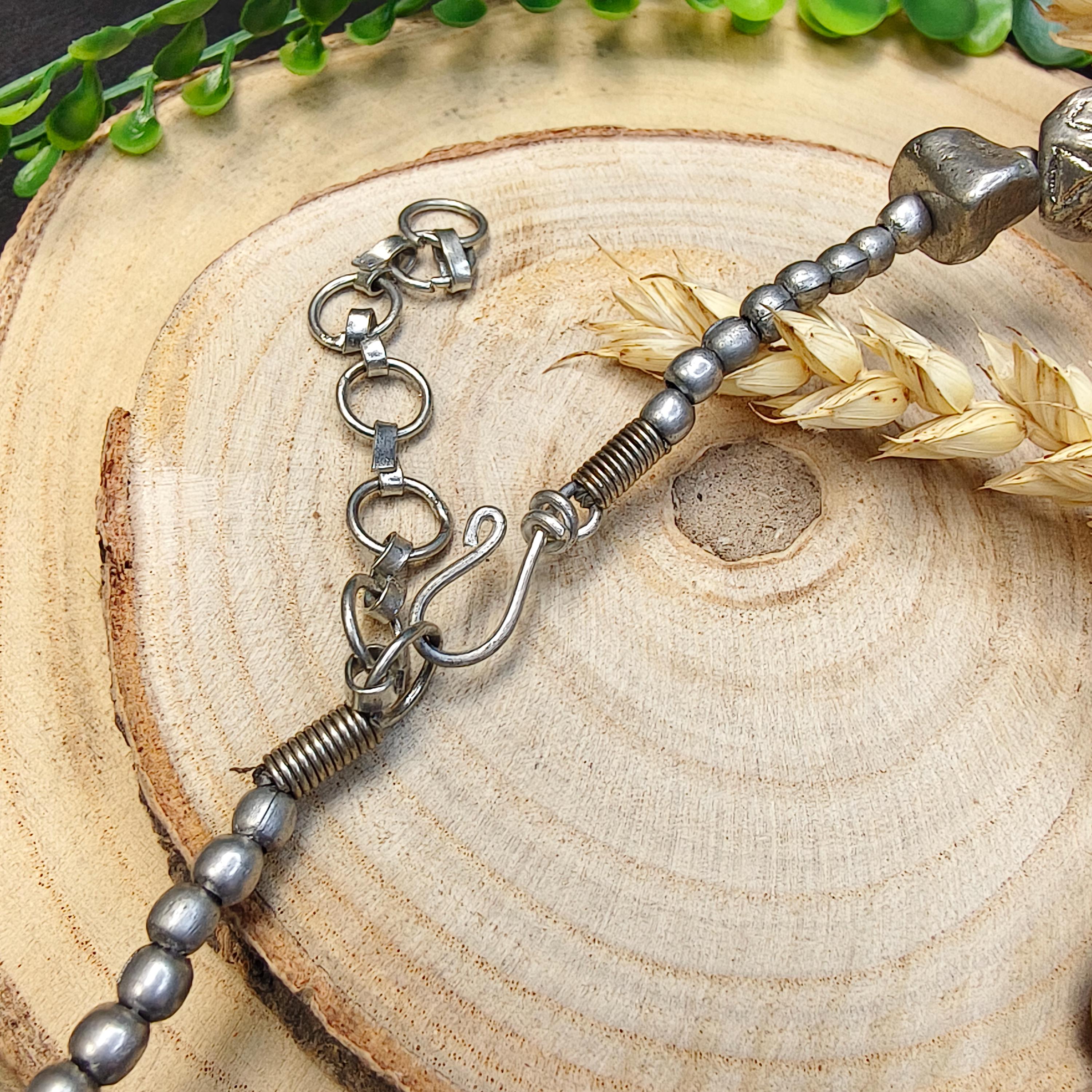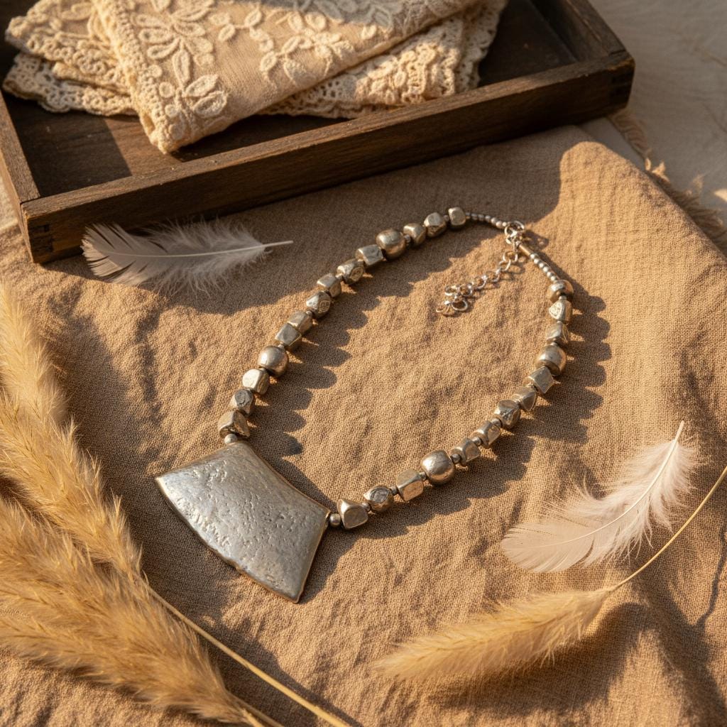 This tribal-inspired silver tone necklace is a bold statement piece blending ethnic craftsmanship with boho elegance. Designed with a mix of organically shaped metal beads and a striking hammered centerpiece, this necklace captures a raw, artisanal spirit.