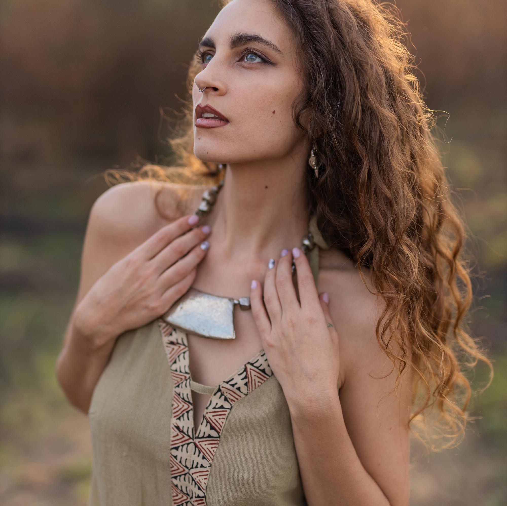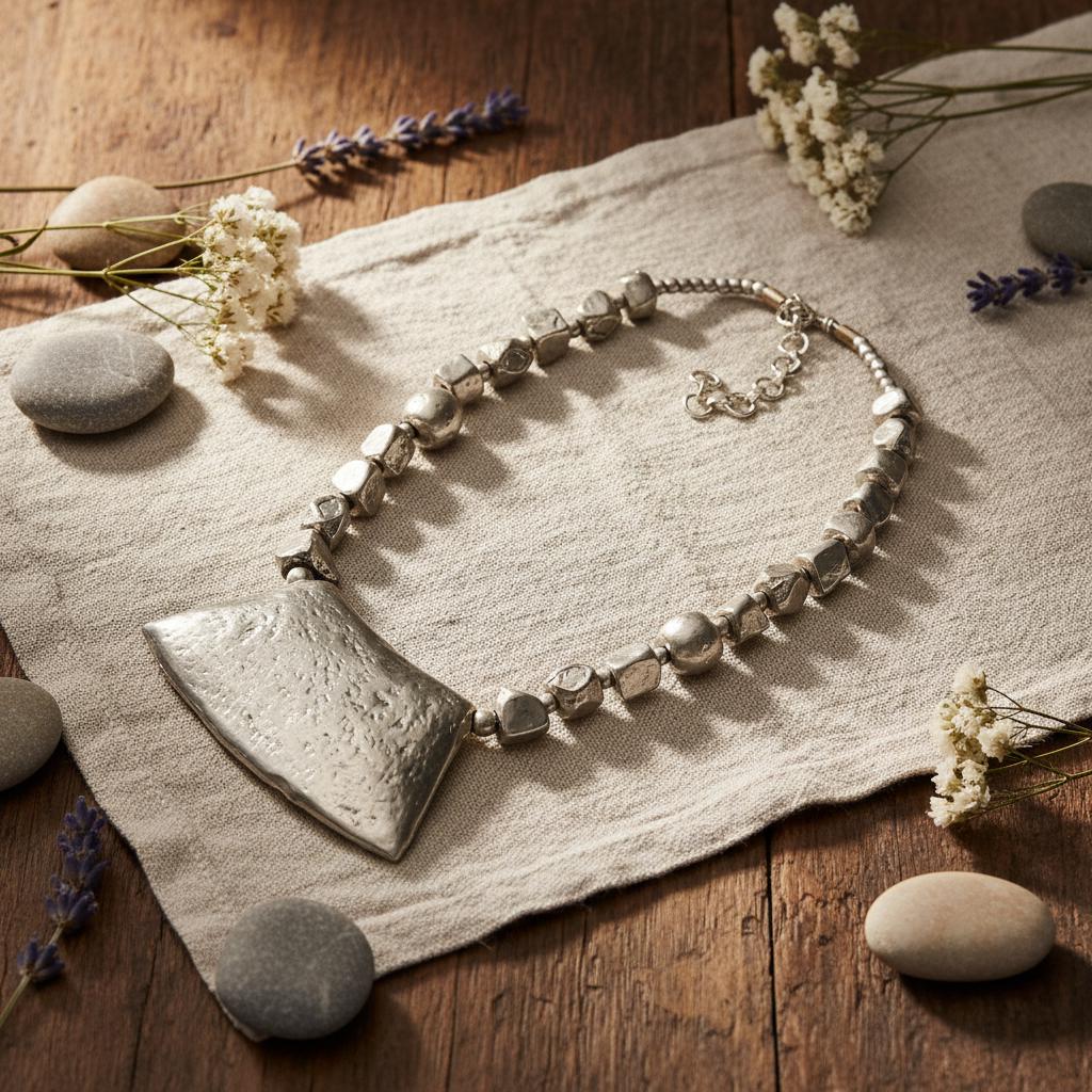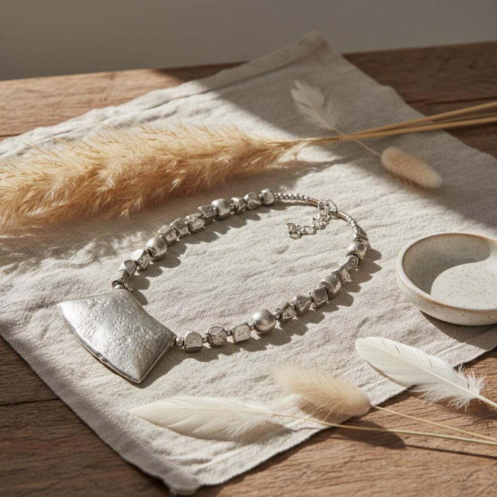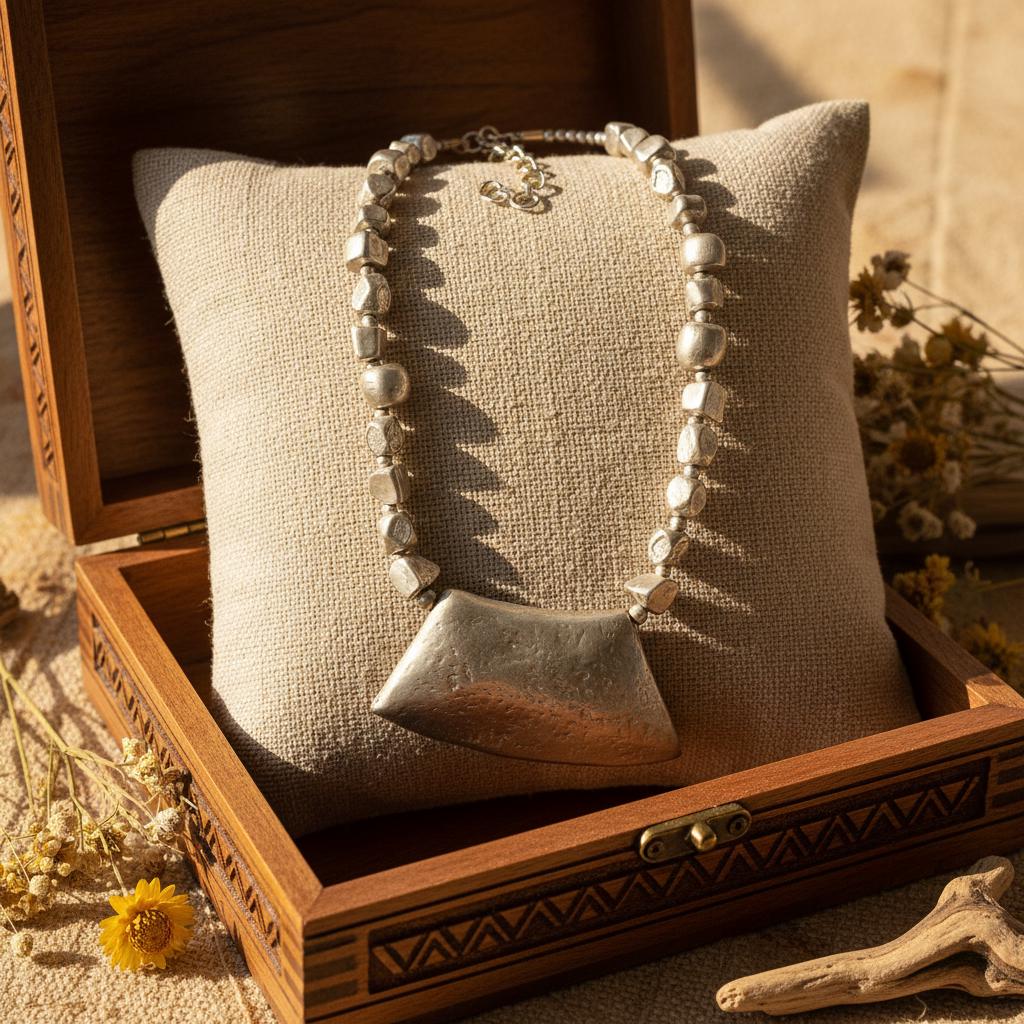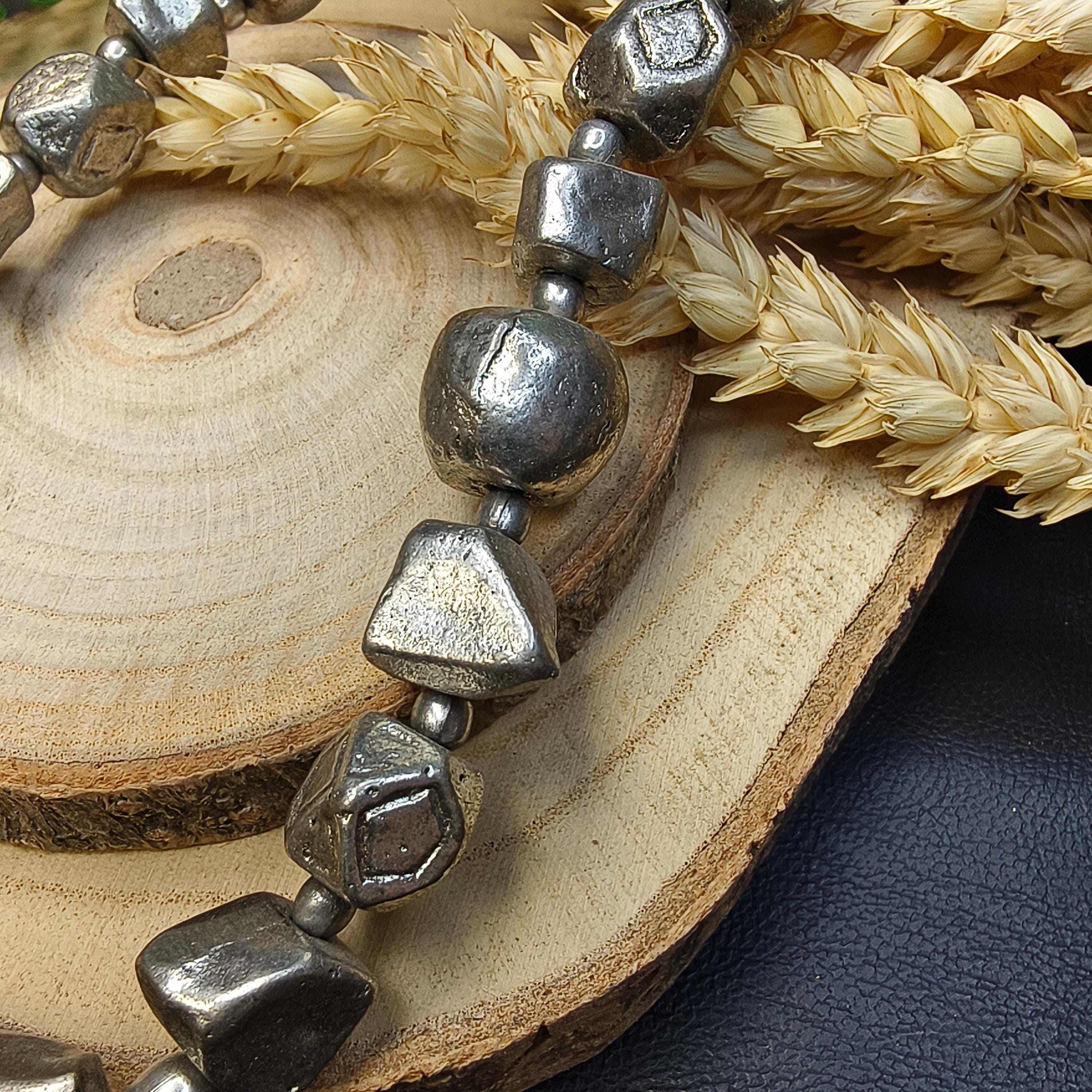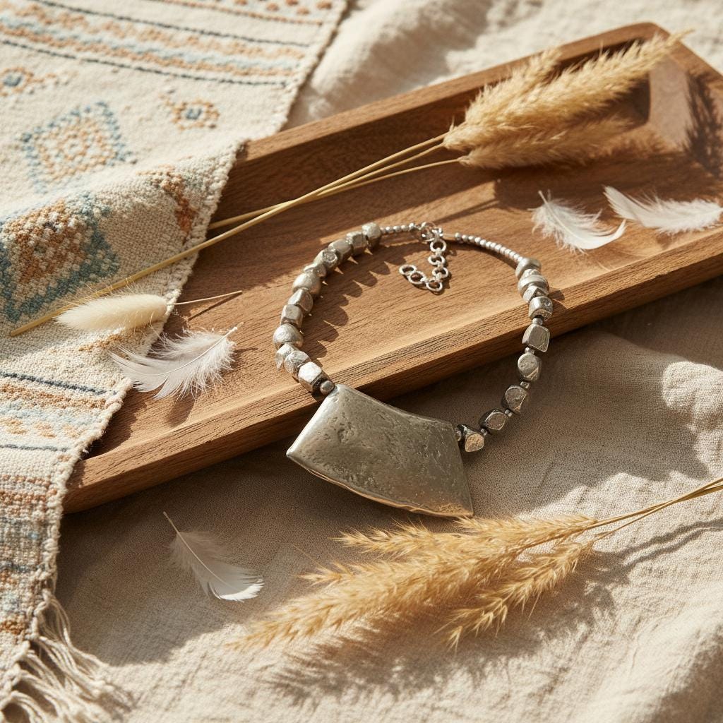 This tribal-inspired silver tone necklace is a bold statement piece blending ethnic craftsmanship with boho elegance. Designed with a mix of organically shaped metal beads and a striking hammered centerpiece, this necklace captures a raw, artisanal spirit.