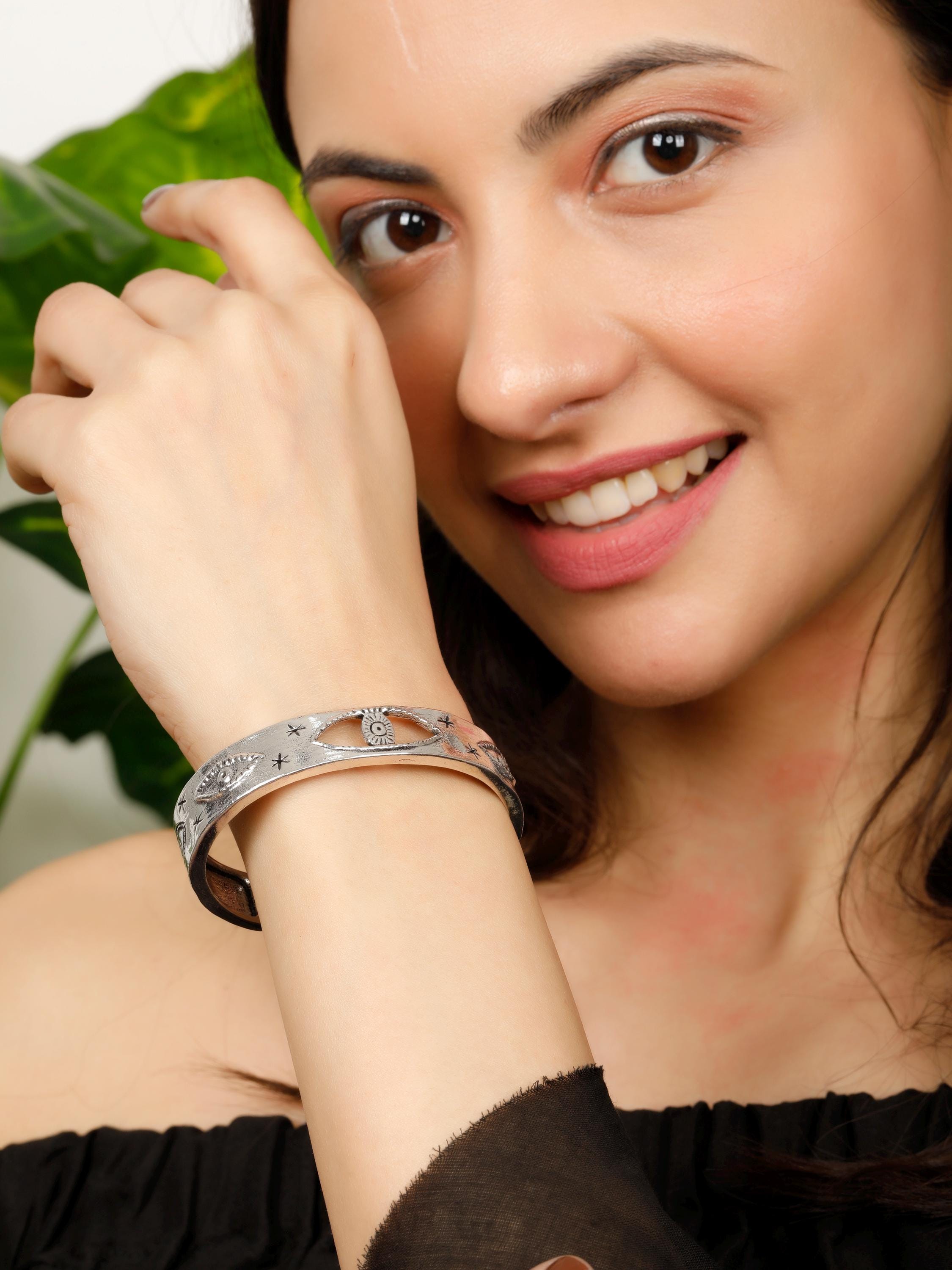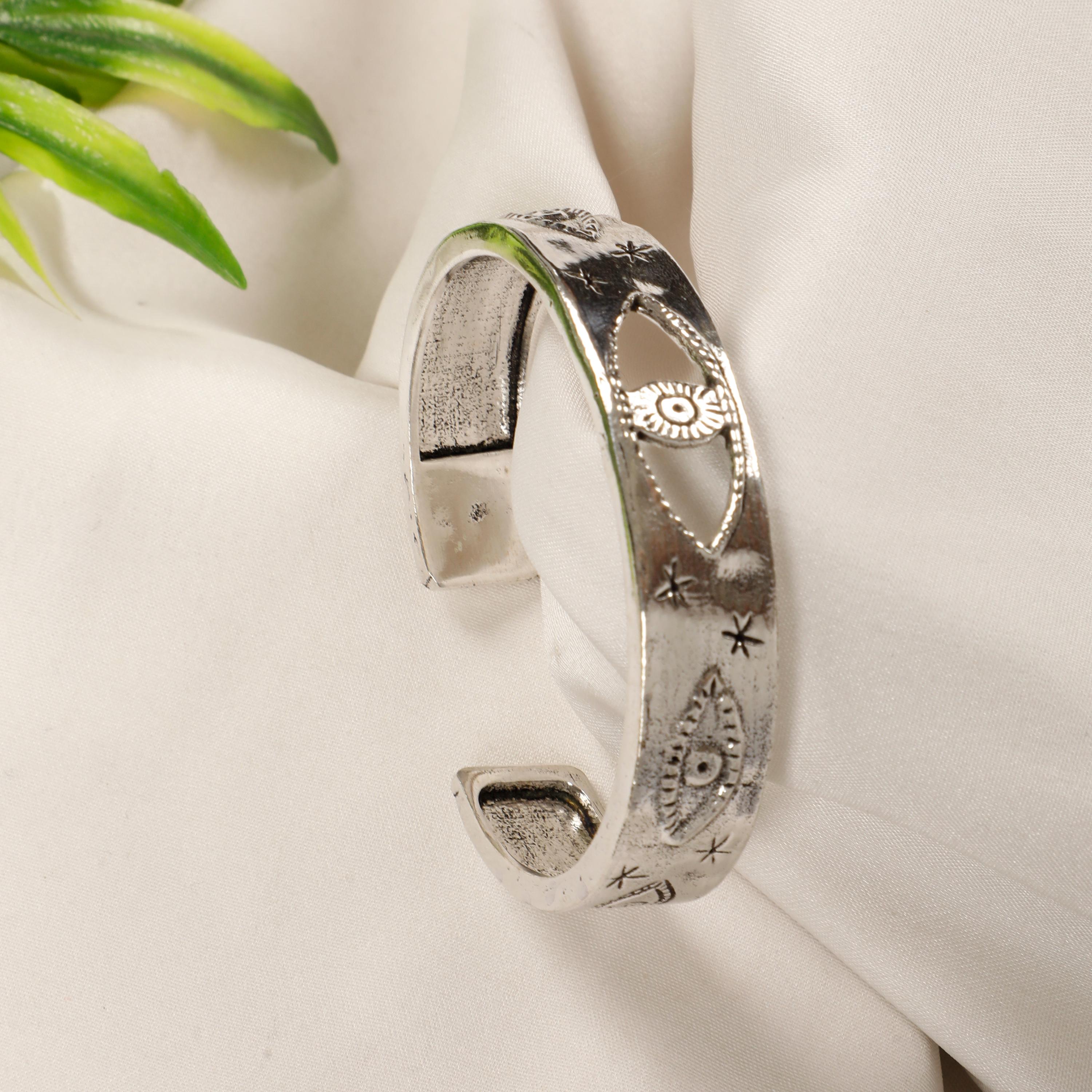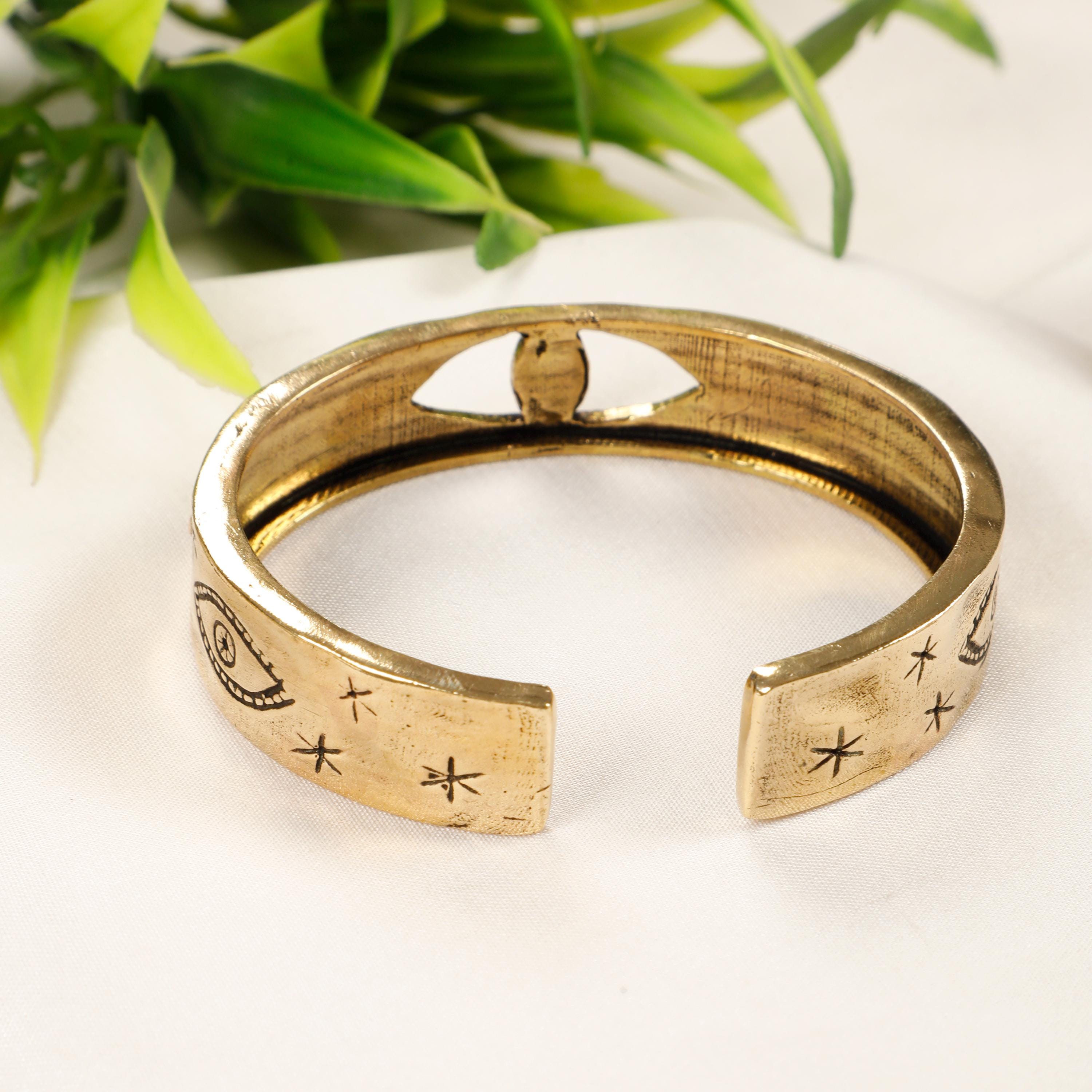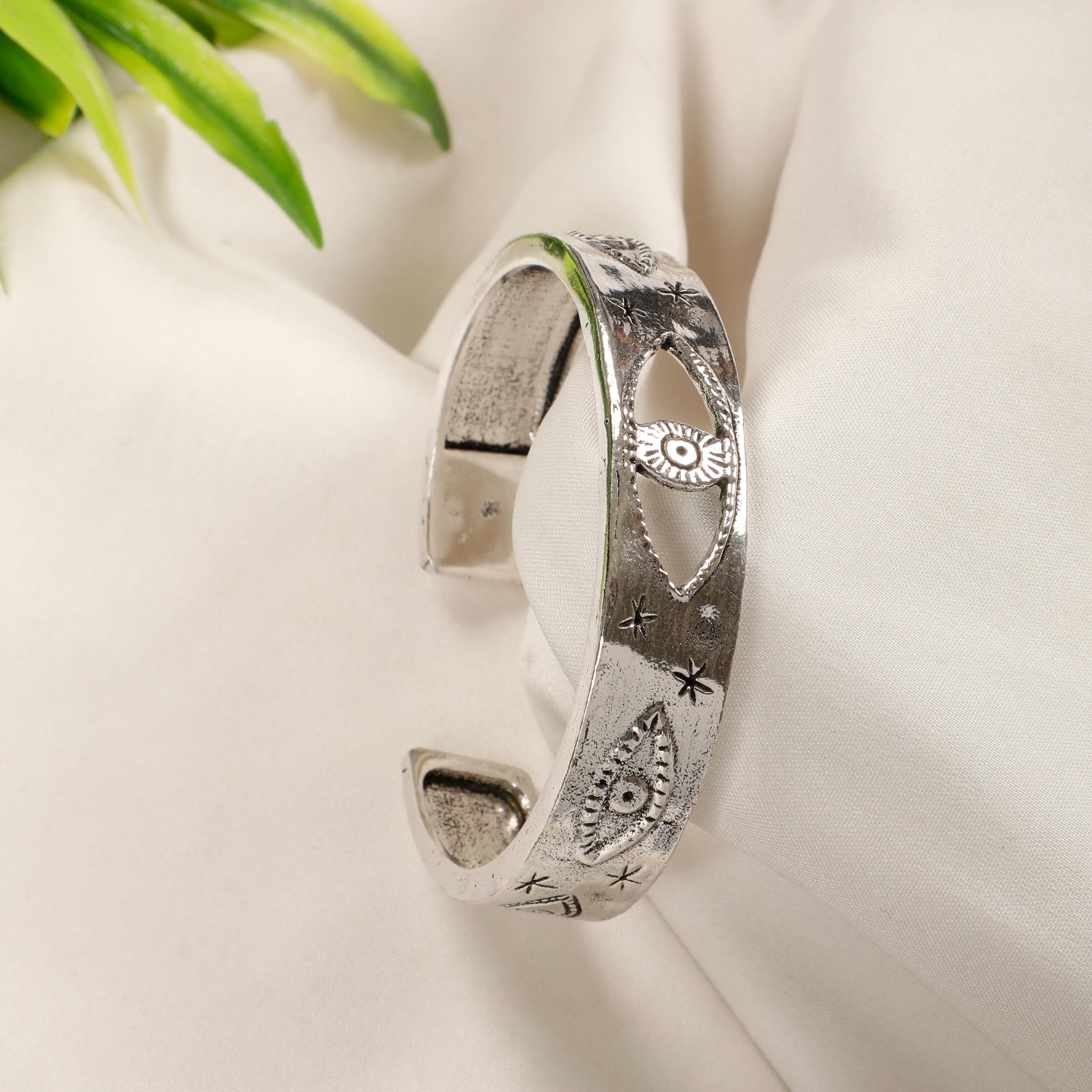 Adorned with an intricate openwork eyes pattern, this bracelet is not only a beautiful accessory but also a symbol of protection and good fortune. This eye-catching cuff is designed to comfortably grace your wrist, adding a touch of mystical charm and free-spirited flair to any outfit.