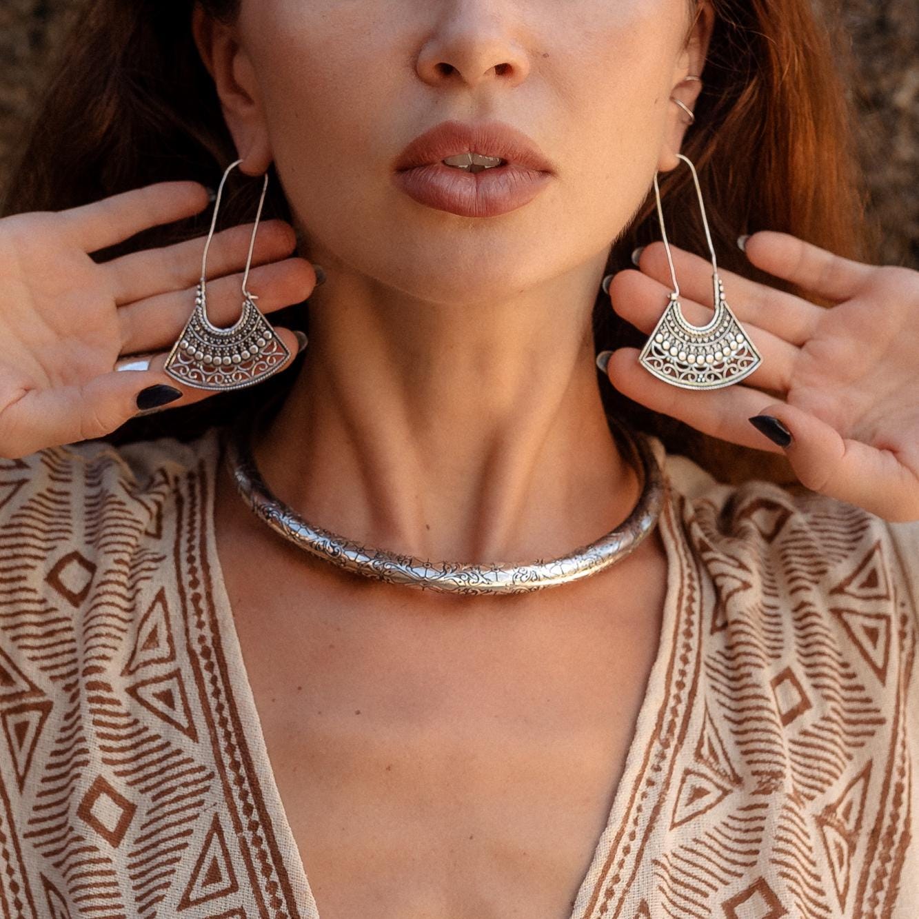 Carefully crafted, these hoop earrings feature a unique design that combines modern geometric shapes with patterns inspired by the Orient, creating a perfect balance between tradition and contemporaneity. Their generous size draws attention and brings a touch of glamor to any outfit, whether it's a night out with friends or a special occasion.
