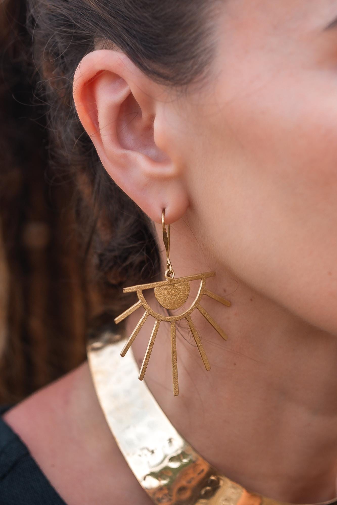 Crafted from brass sheet and shaped into a half-circle reminiscent of a stylized eye, they offer a unique blend of modern and bohemian aesthetics.