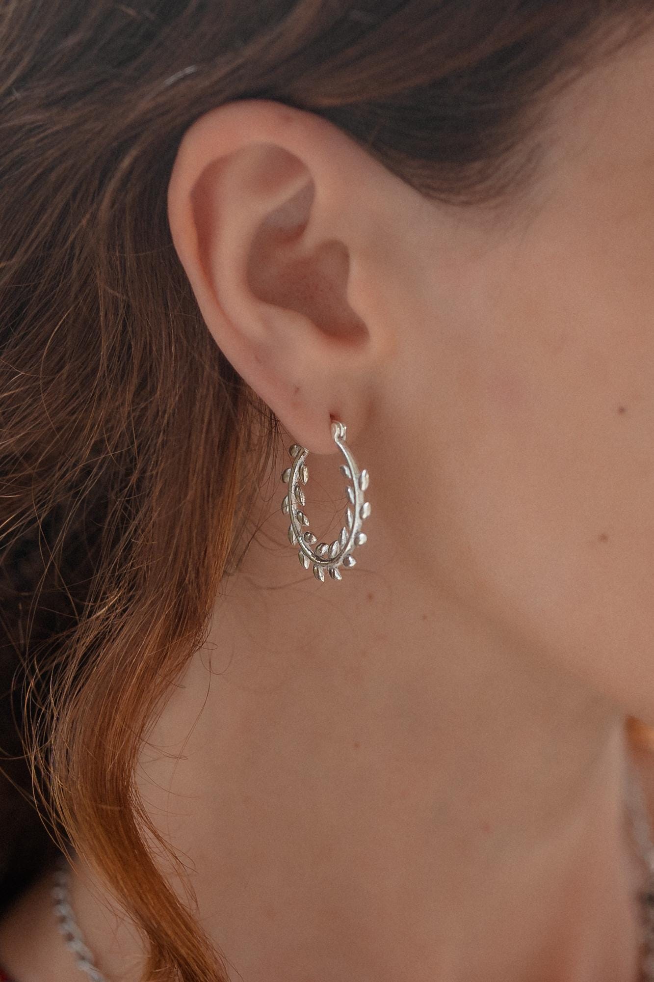 These delicate hoops are crafted from polished brass and feature subtle, stylized leaf motifs that evoke organic charm.