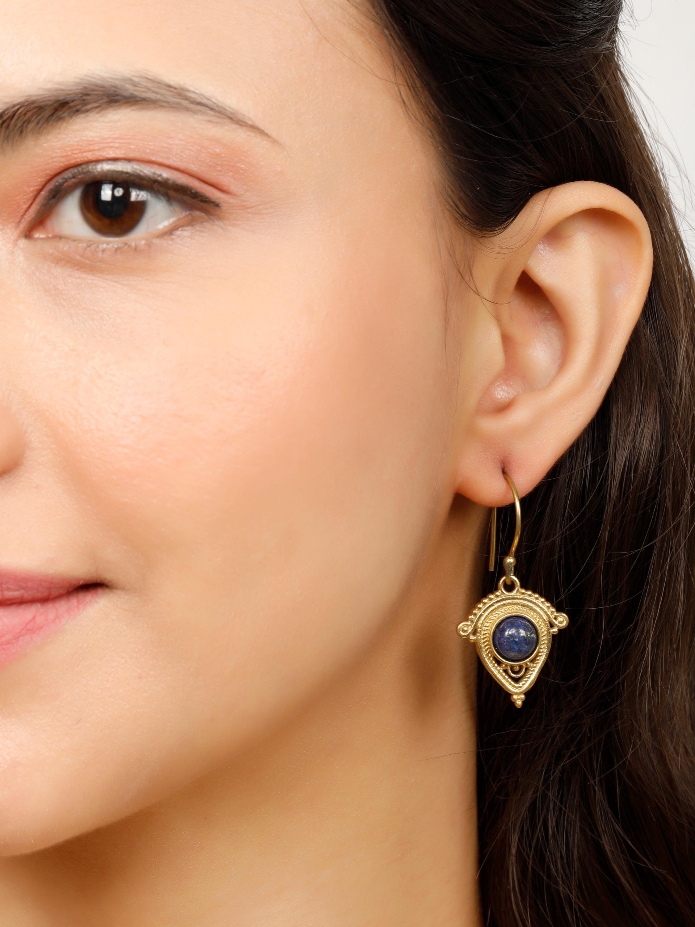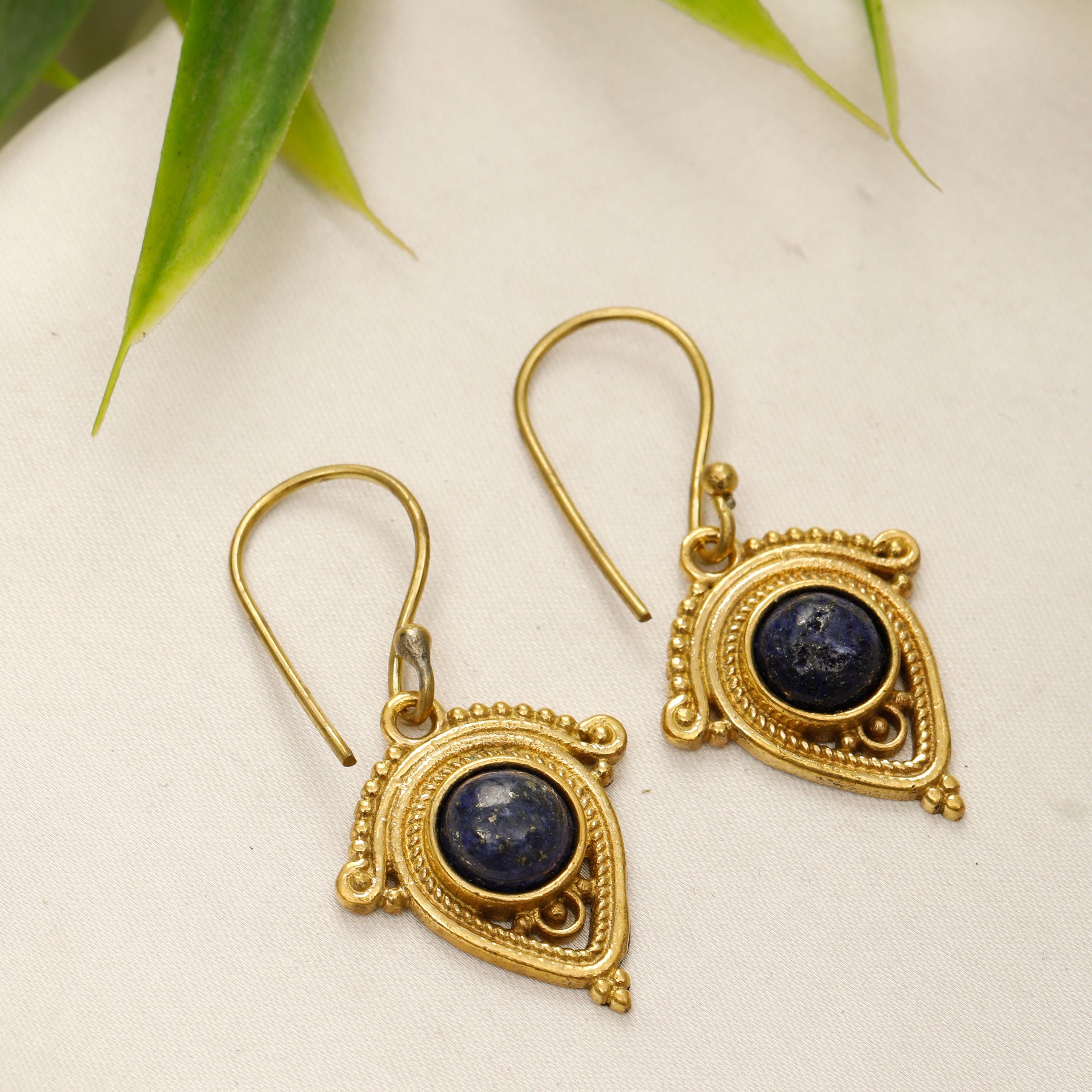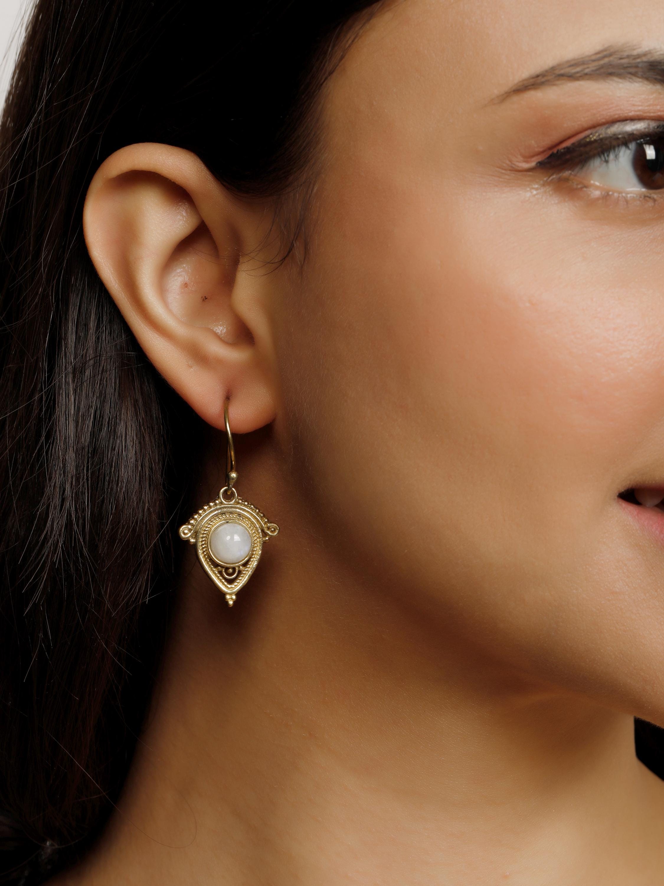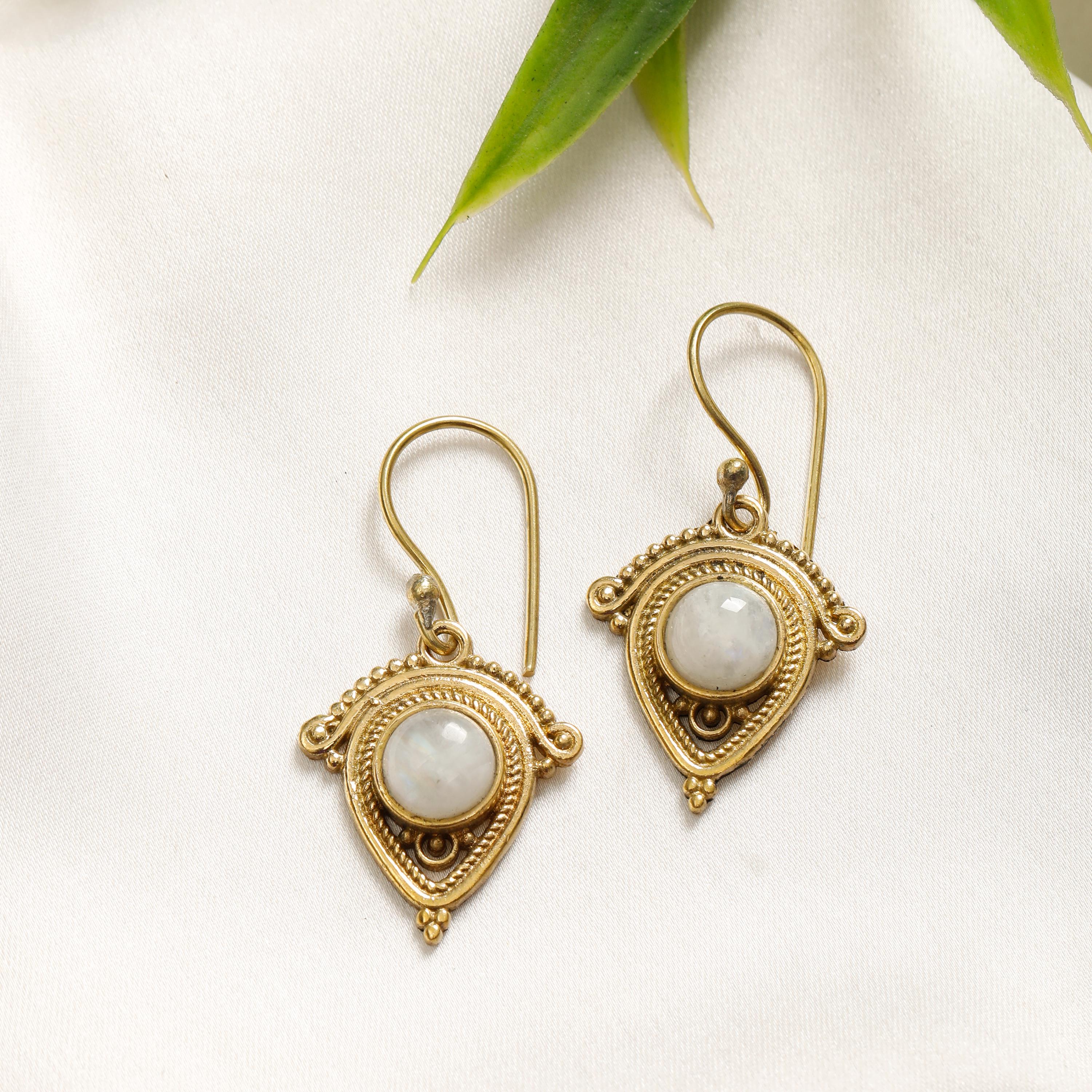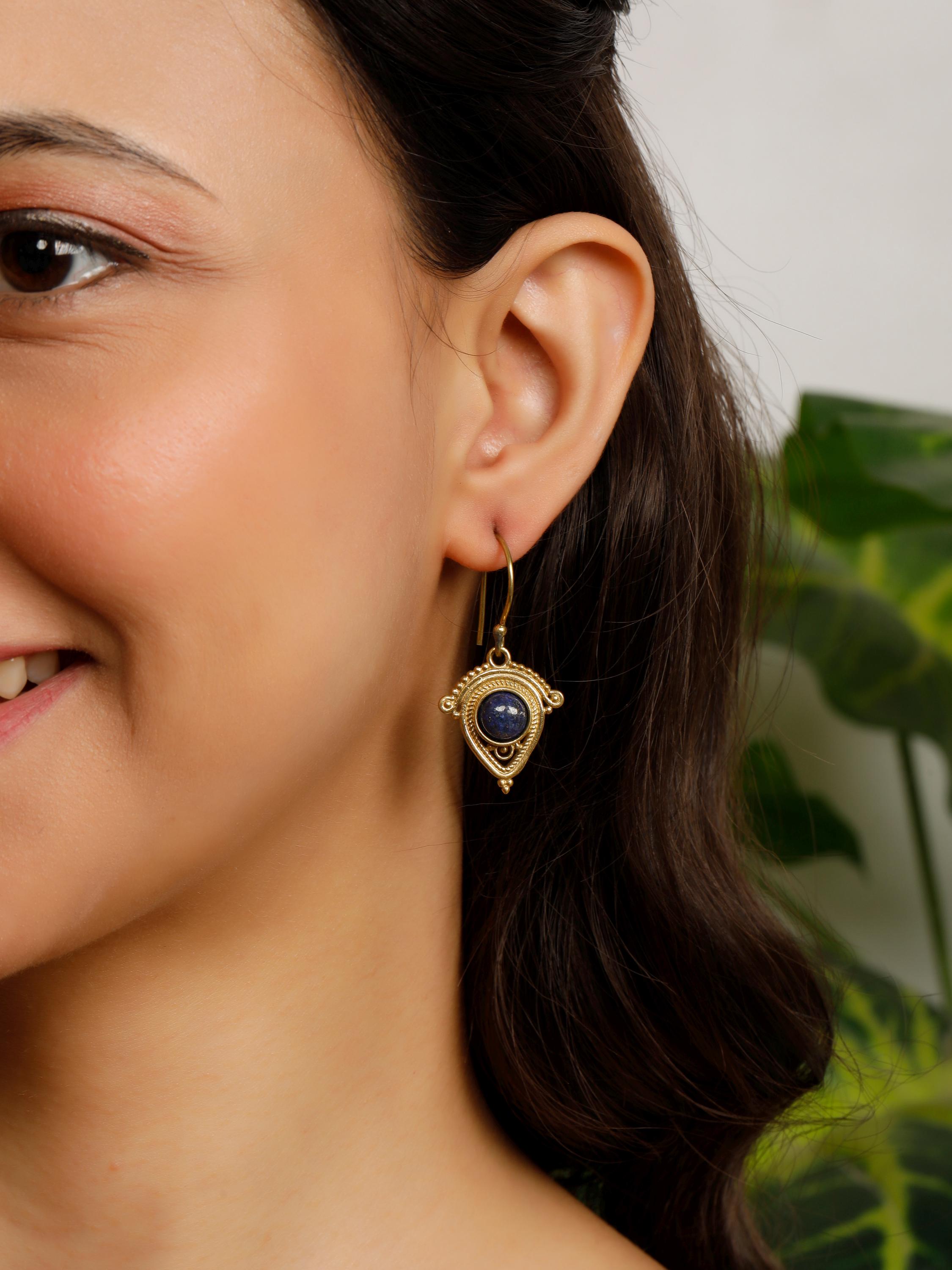 Crafted from brass, these dangling earrings feature beautifully polished round natural stones that capture the essence of nature's beauty. Their flowing design make them the perfect accessory for expressing your free spirit and adding a touch of global flair to any outfit.