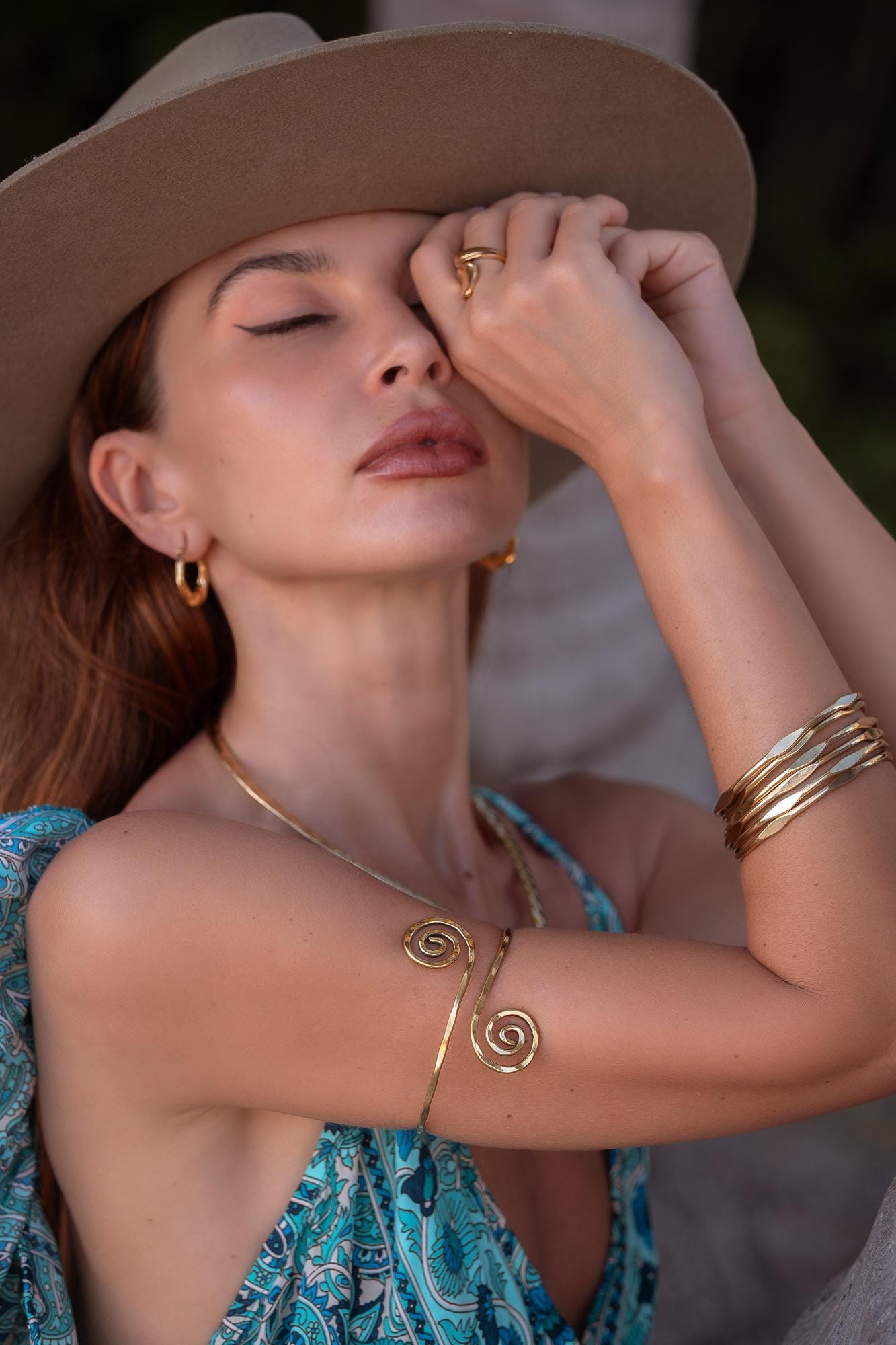 Made from brass, this bracelet is designed to comfortably adorn your upper arm, adding a touch of elegance and bohemian style to any outfit. Whether you're dressing up for a festival, embracing your inner goddess, or simply looking for a striking everyday accessory.