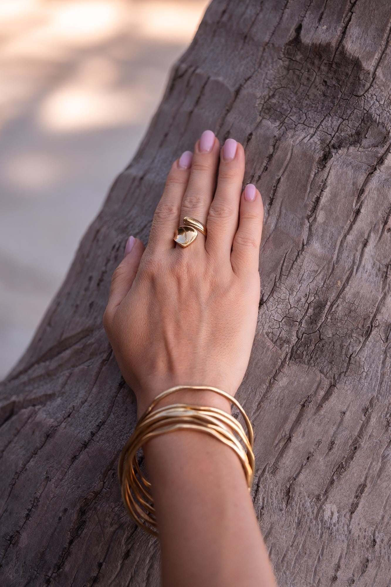 Discover our adjustable brass ring with a curved and coiled design, combining modernity and timelessness. This elegant piece of jewelry is designed to fit your finger perfectly, providing optimal comfort while adding a touch of sophistication to your style.