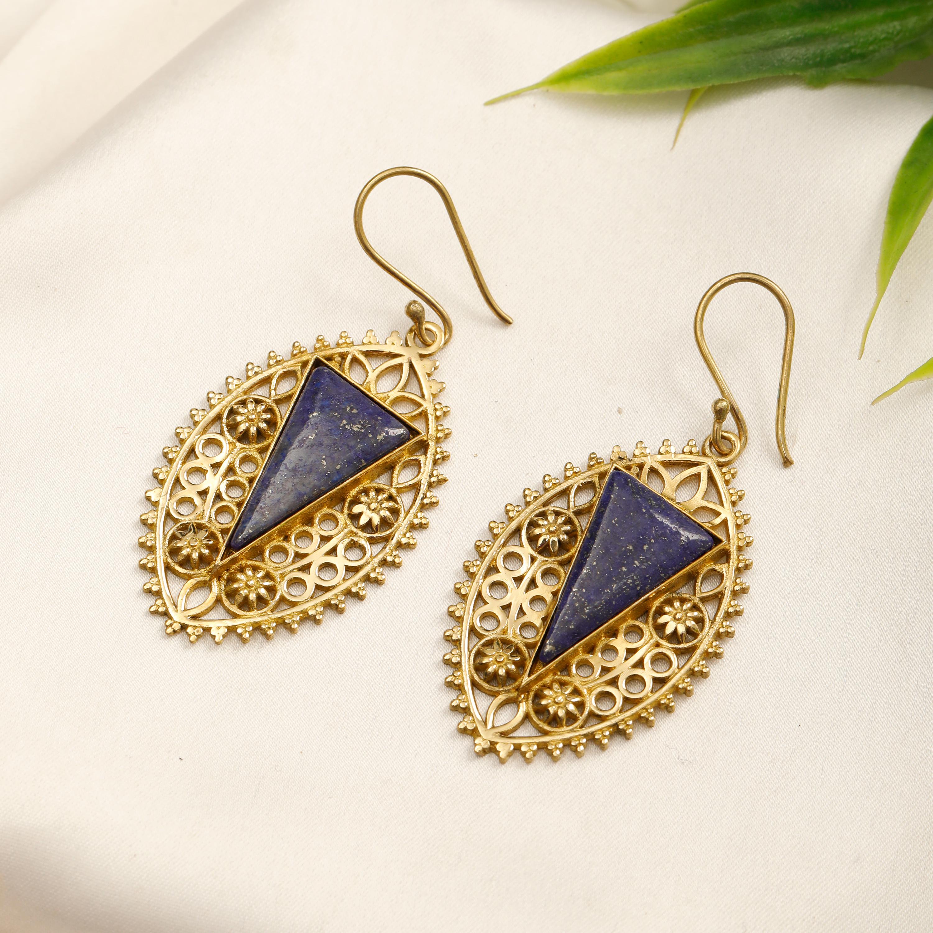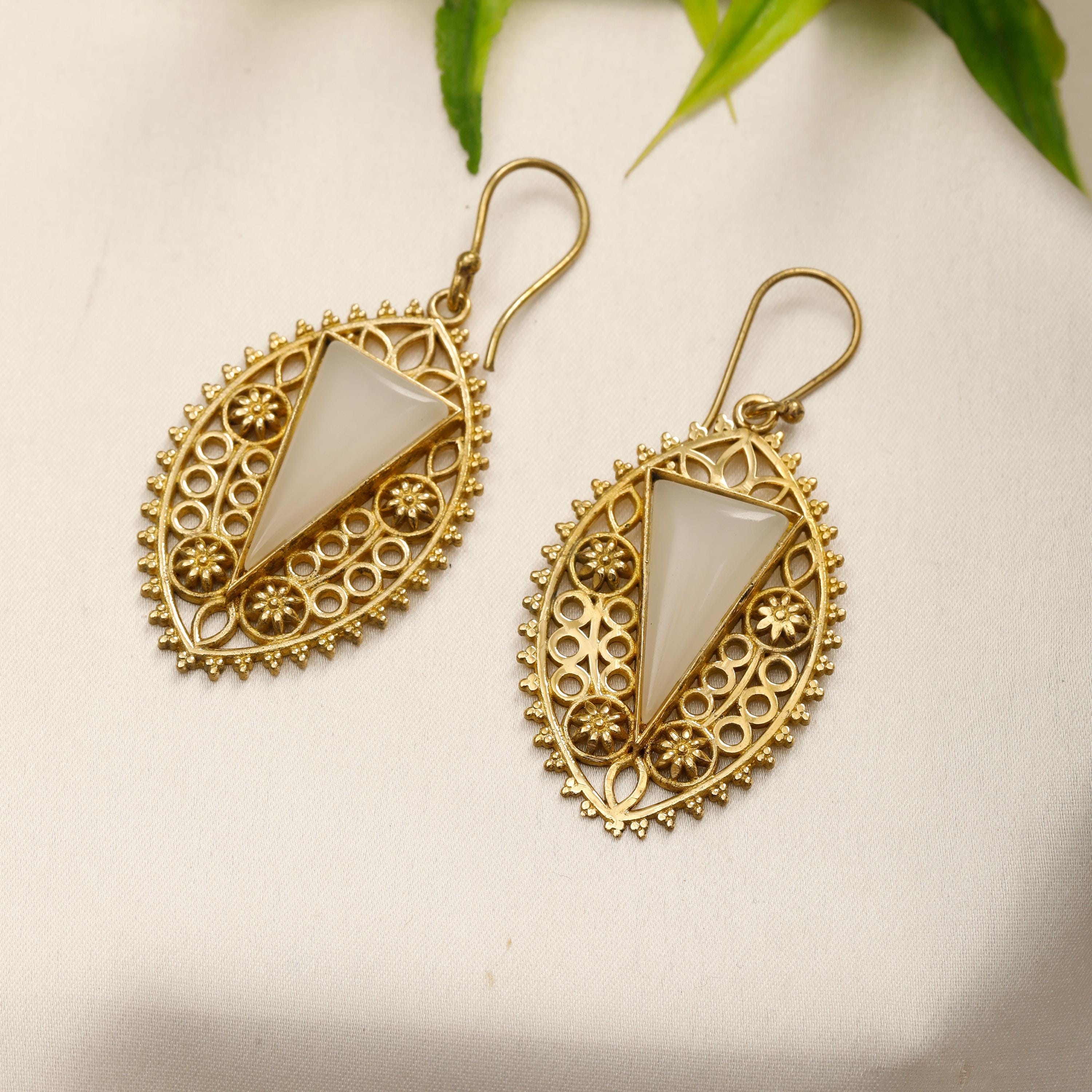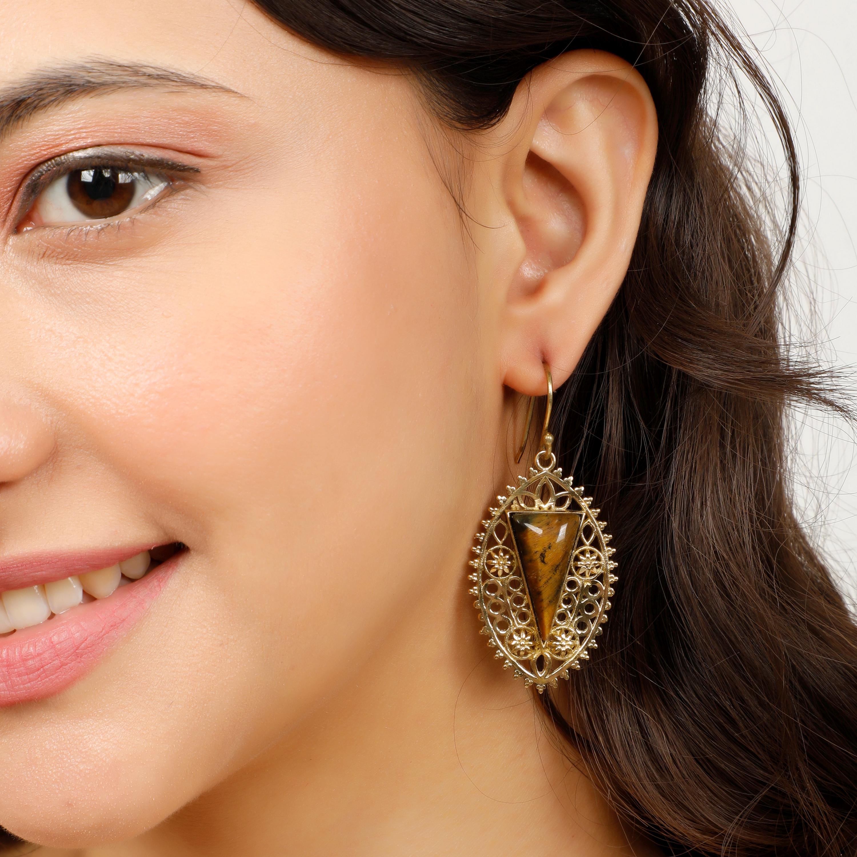 Delicate brass floral designs dangle gracefully, each accented by a striking, triangle-cut semi-precious stone. These earrings capture the romance and refinement of medieval jewelry, making them a perfect statement piece for adding a touch of historical elegance to any outfit.