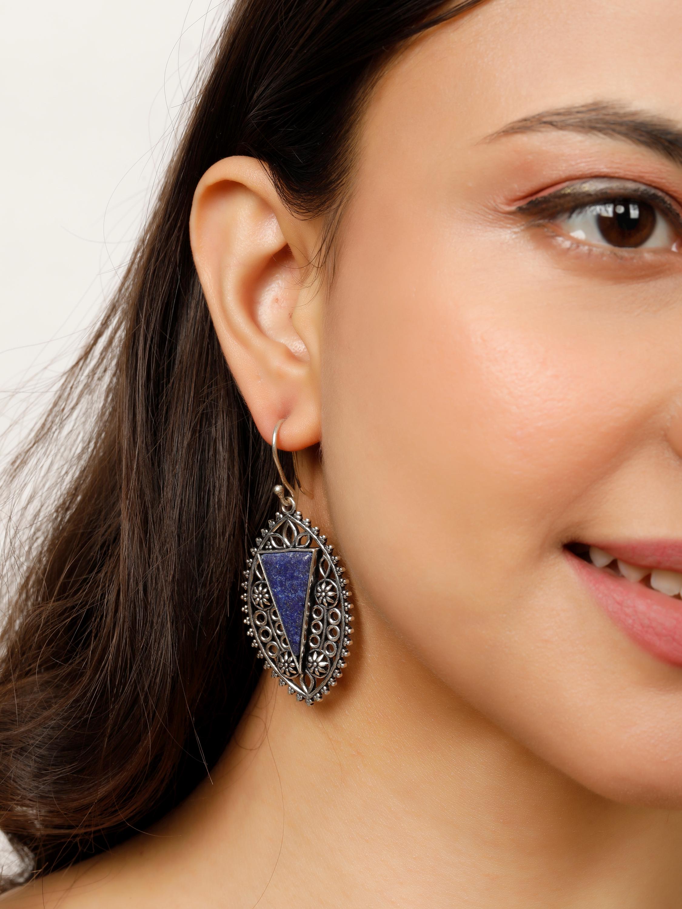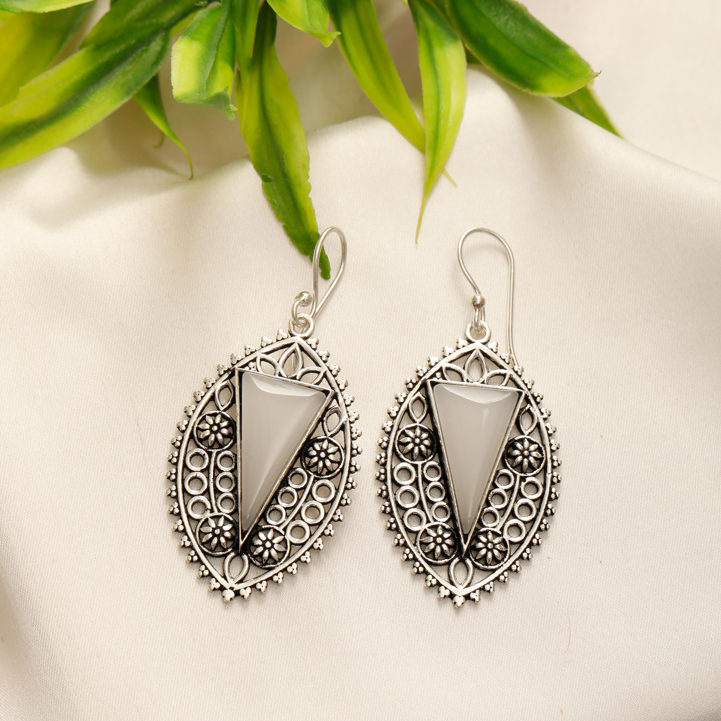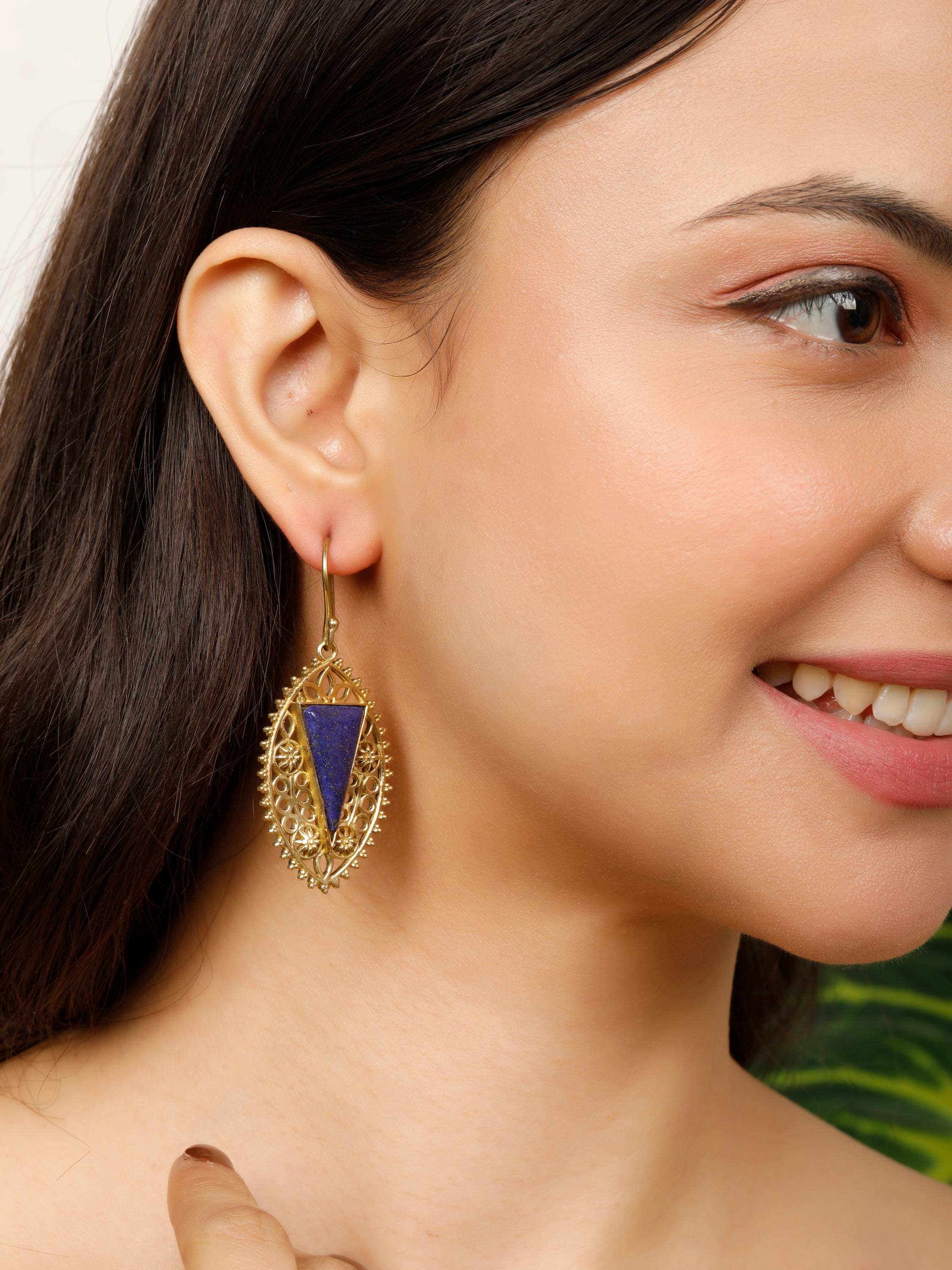 Delicate brass floral designs dangle gracefully, each accented by a striking, triangle-cut semi-precious stone. These earrings capture the romance and refinement of medieval jewelry, making them a perfect statement piece for adding a touch of historical elegance to any outfit.