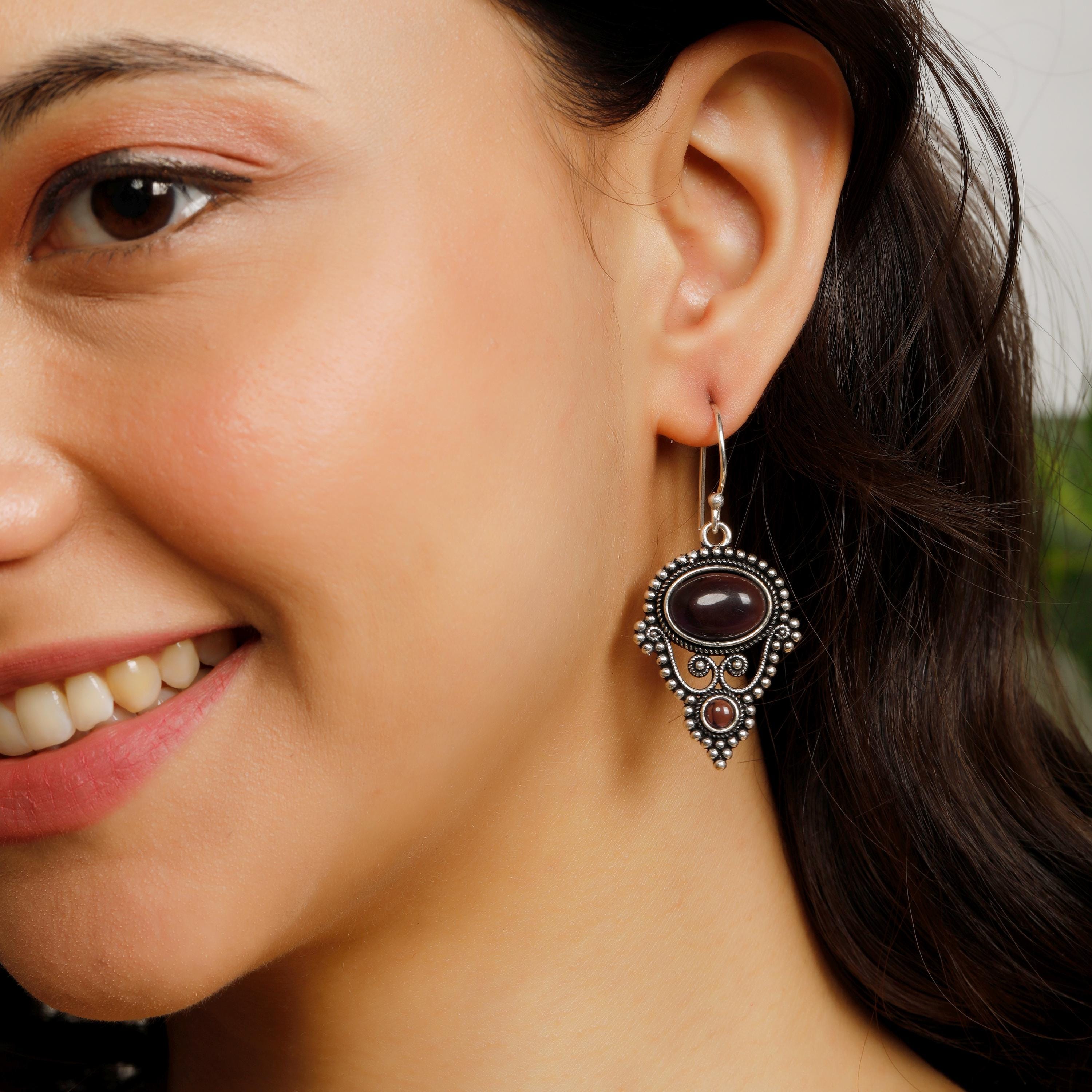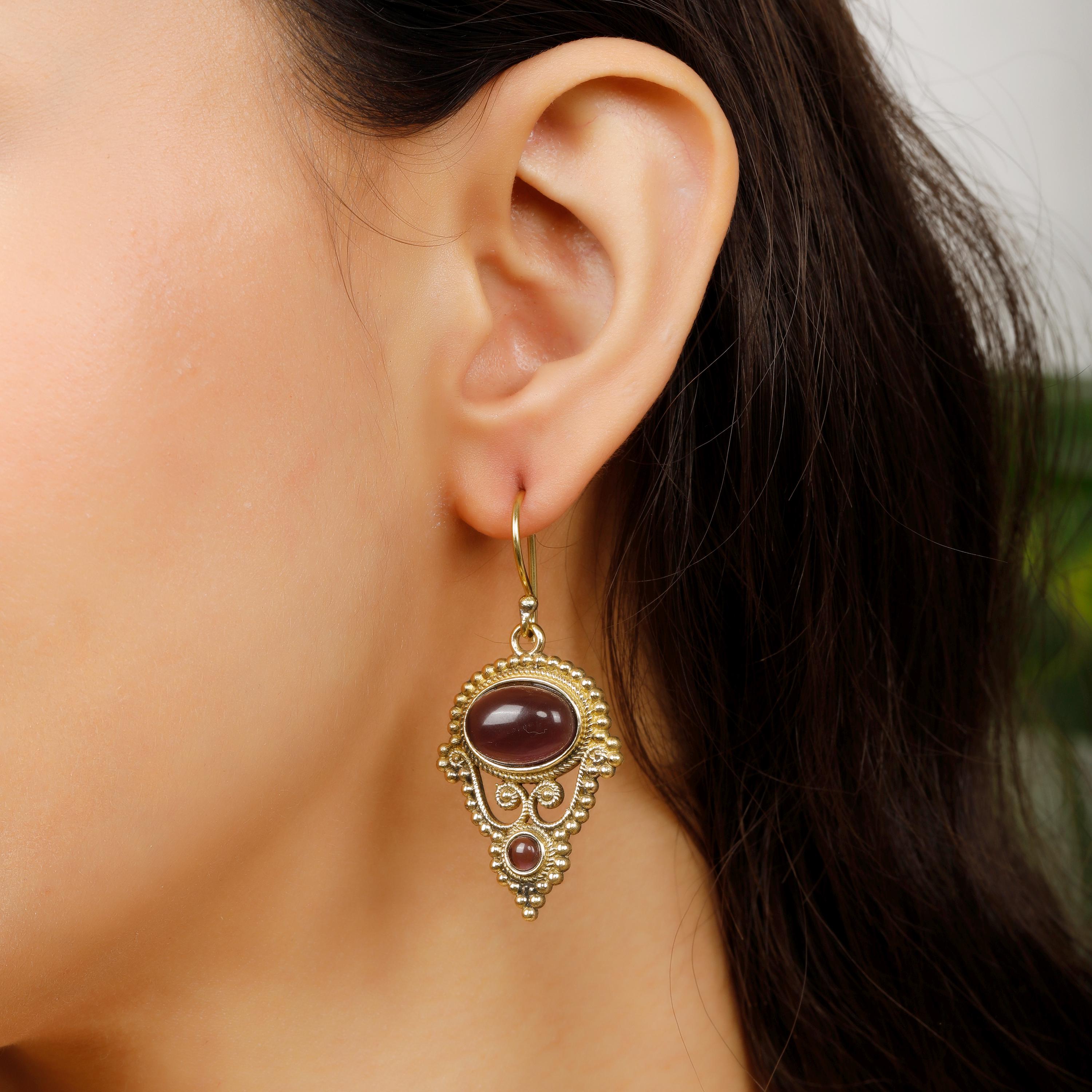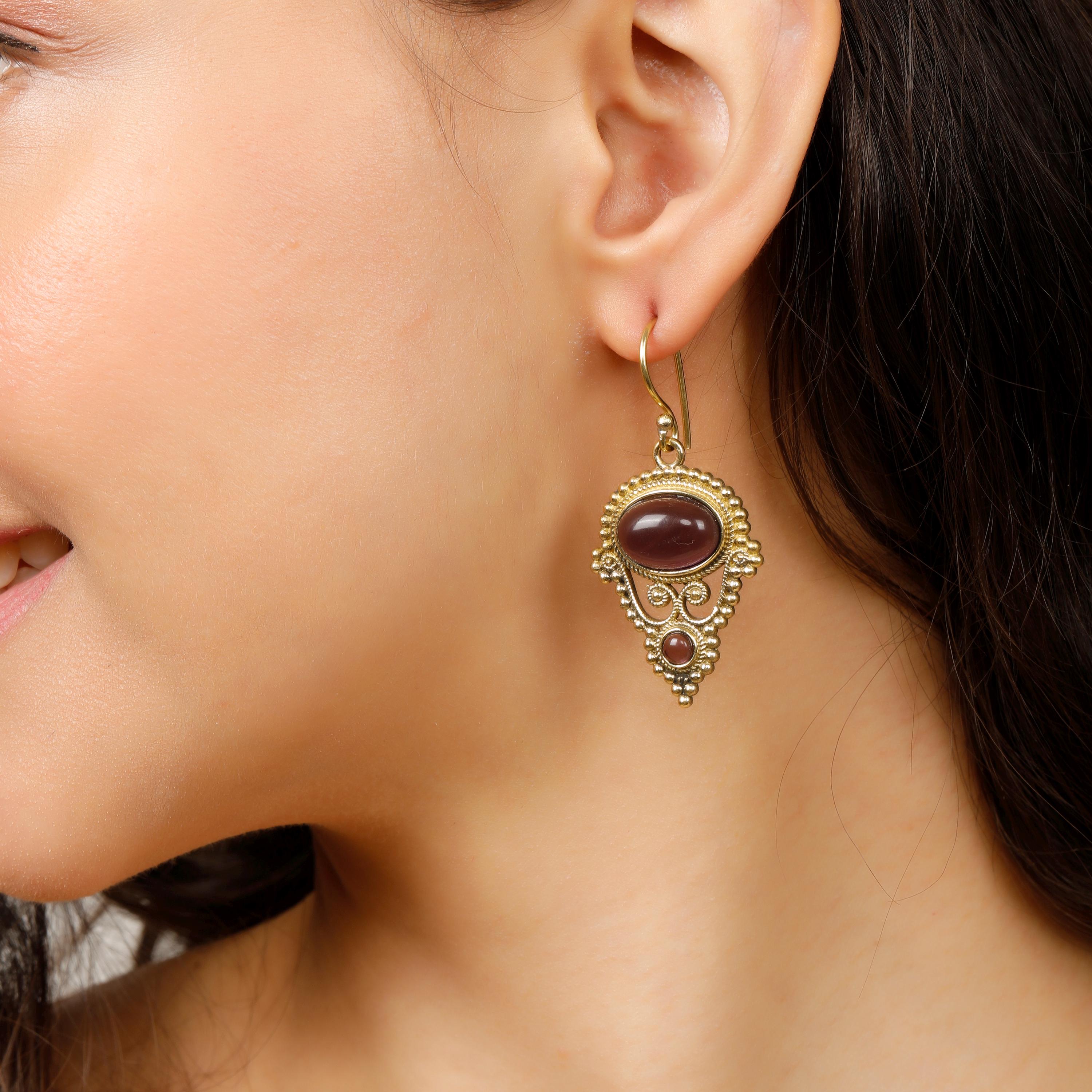 Expertly crafted with a delicate and intricate design, these drop earrings feature not one, but two semi-precious stones per earring. The stones add a touch of elegance, and their natural variations ensure that no two pairs are exactly the same.