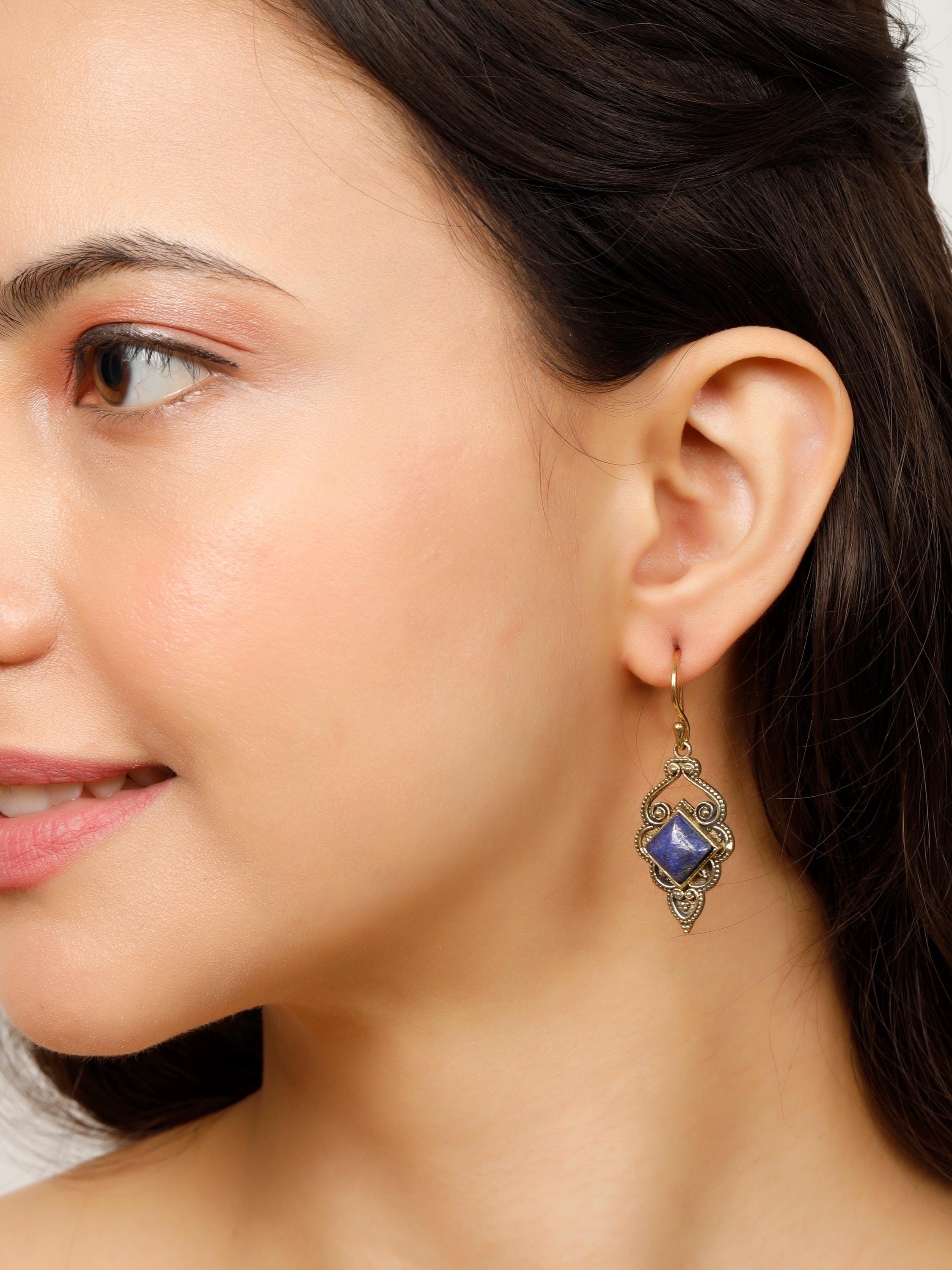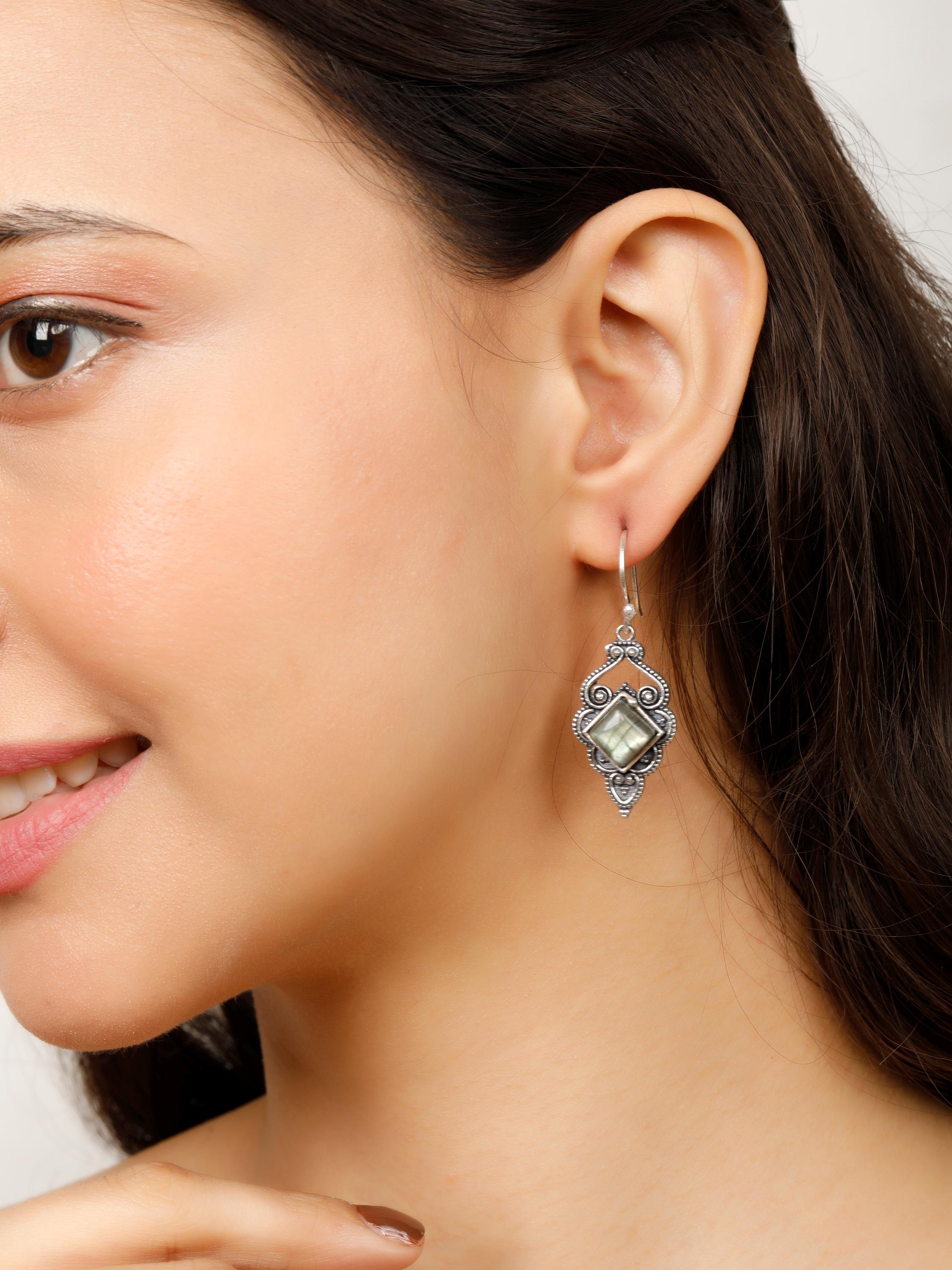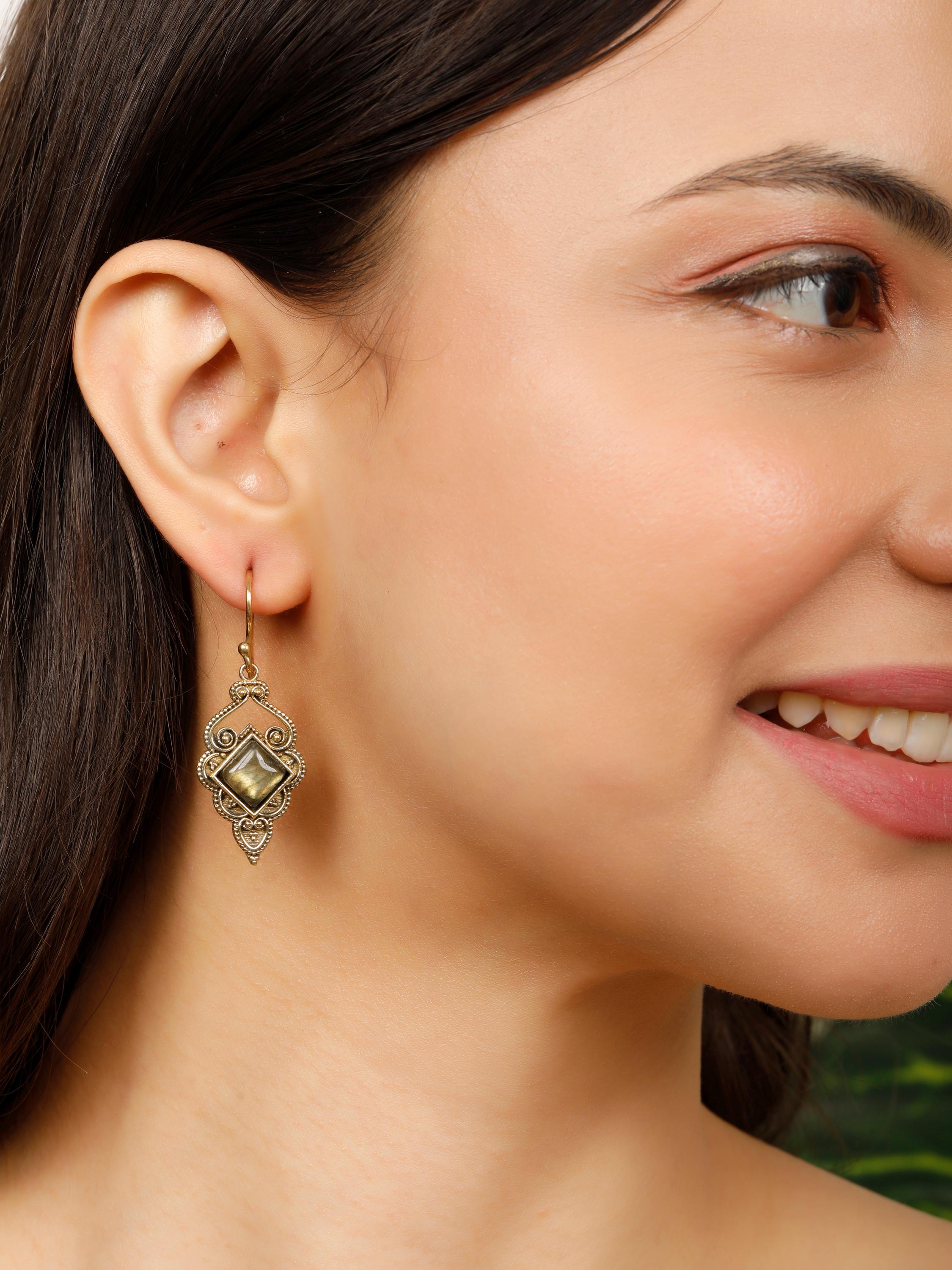 The openwork design showcases fascinating ethnic swirls, while a square semi-precious stone adds a pop of color and texture.