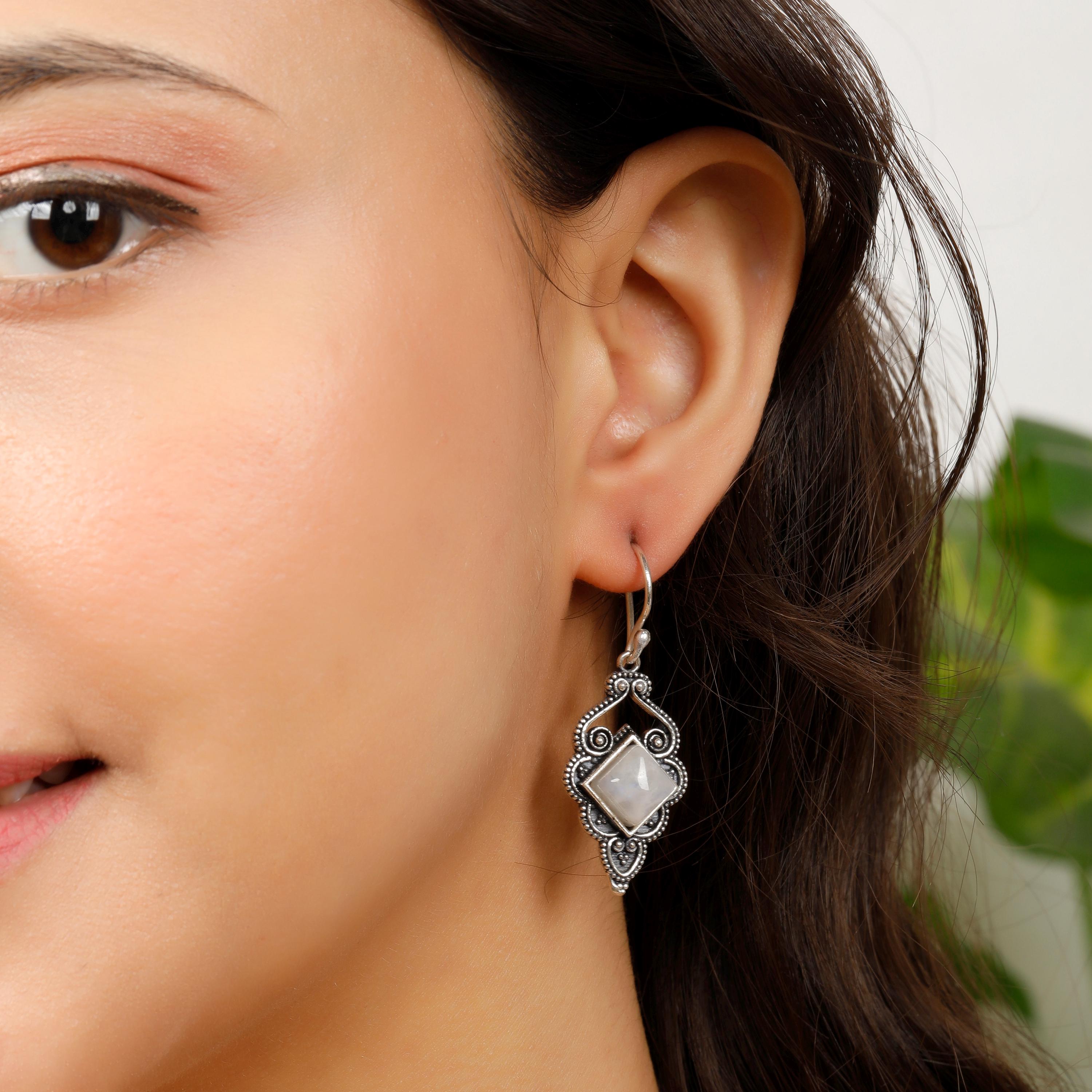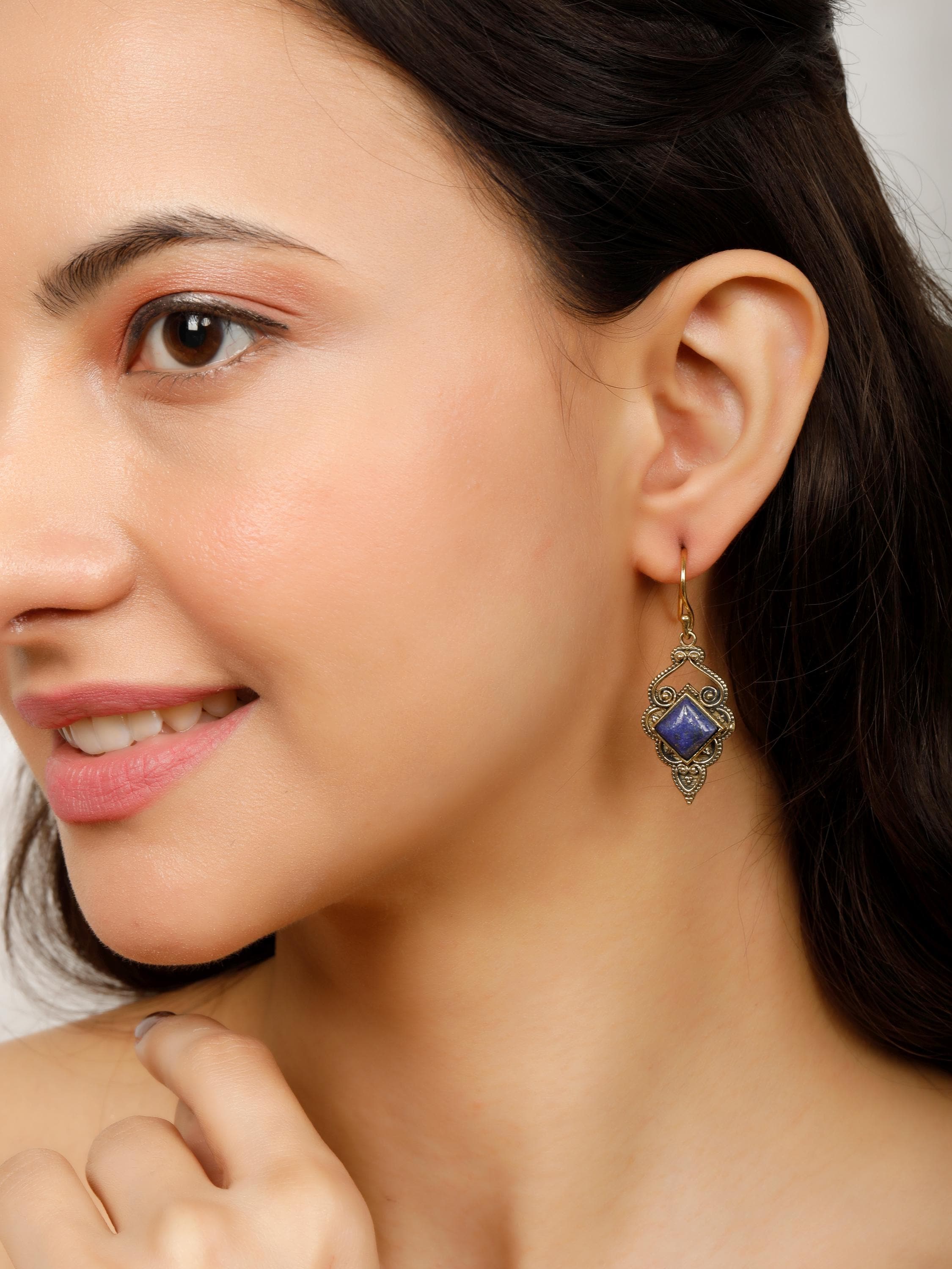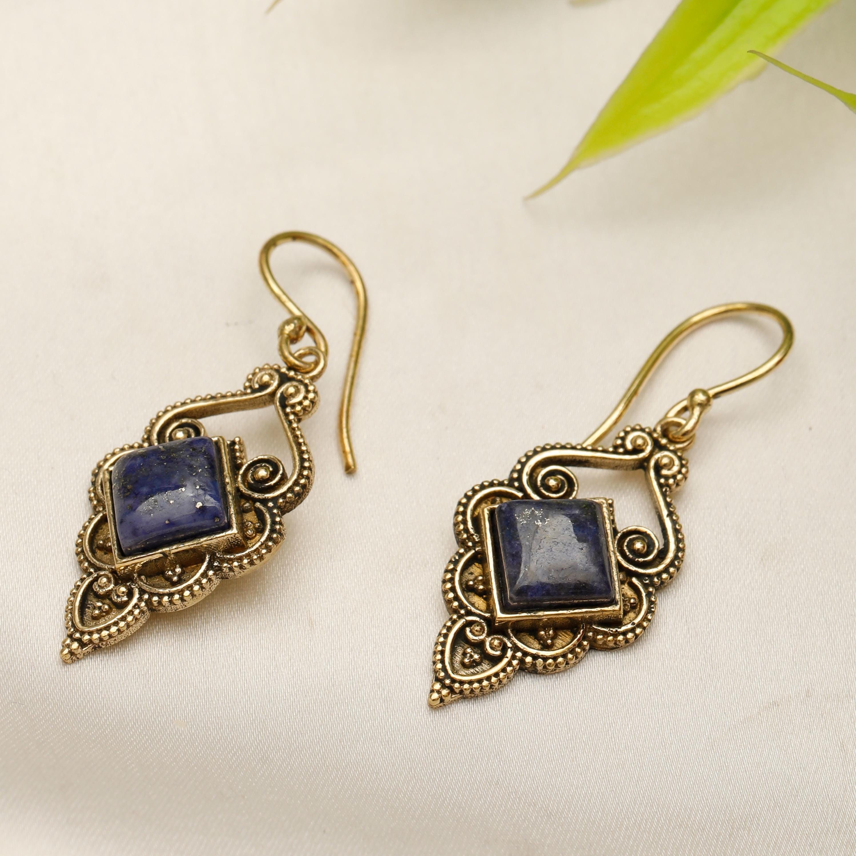The openwork design showcases fascinating ethnic swirls, while a square semi-precious stone adds a pop of color and texture.