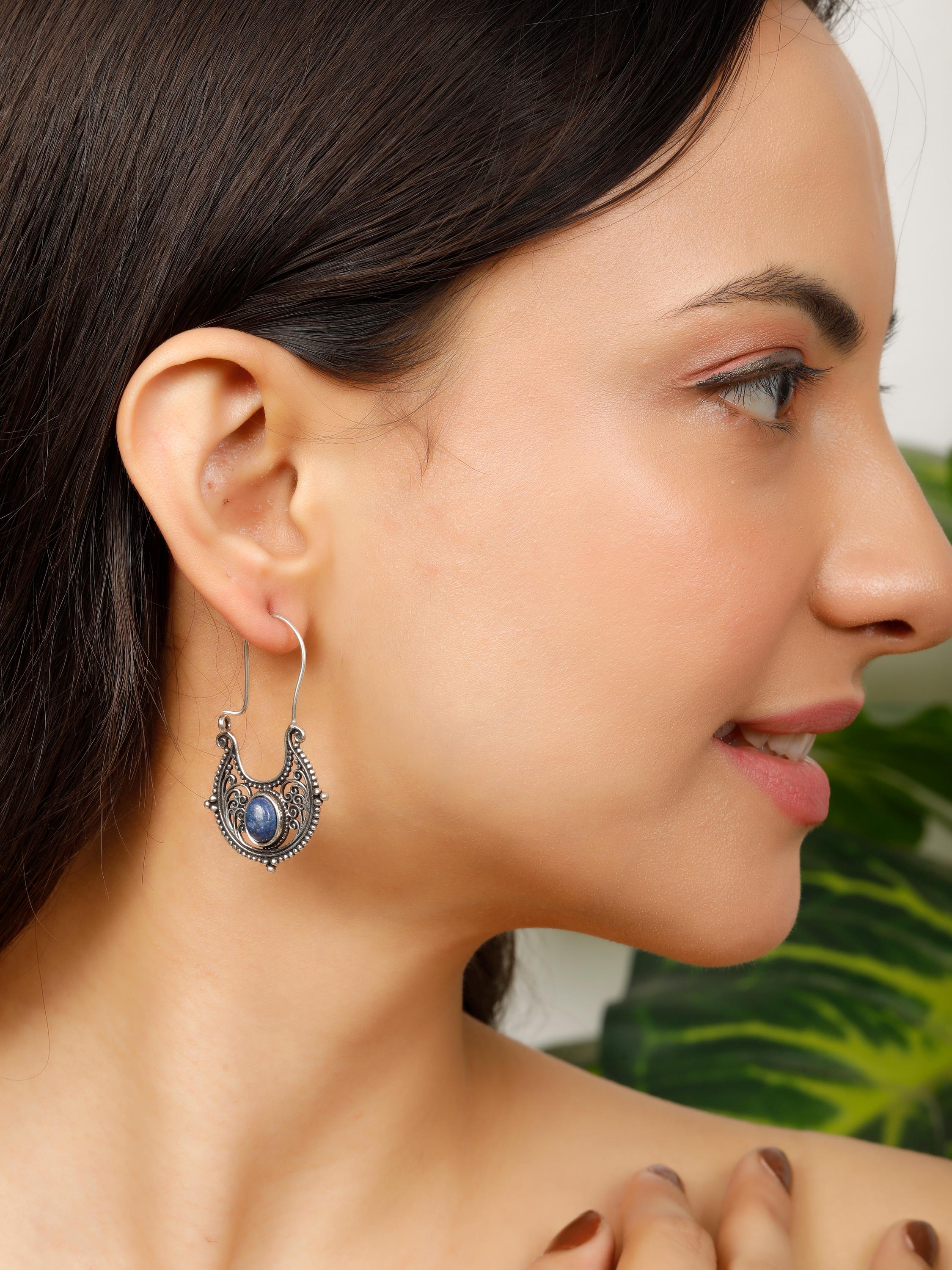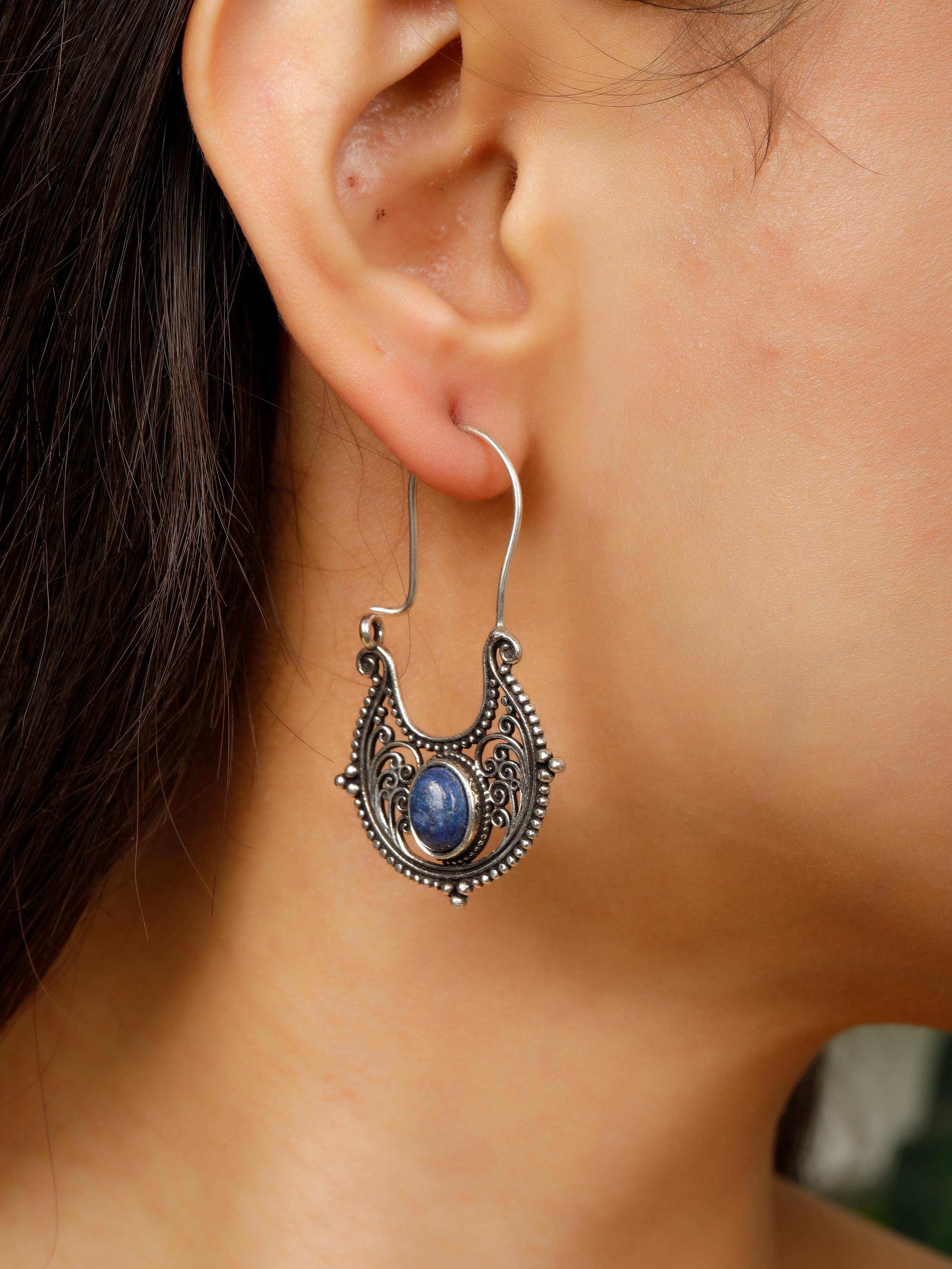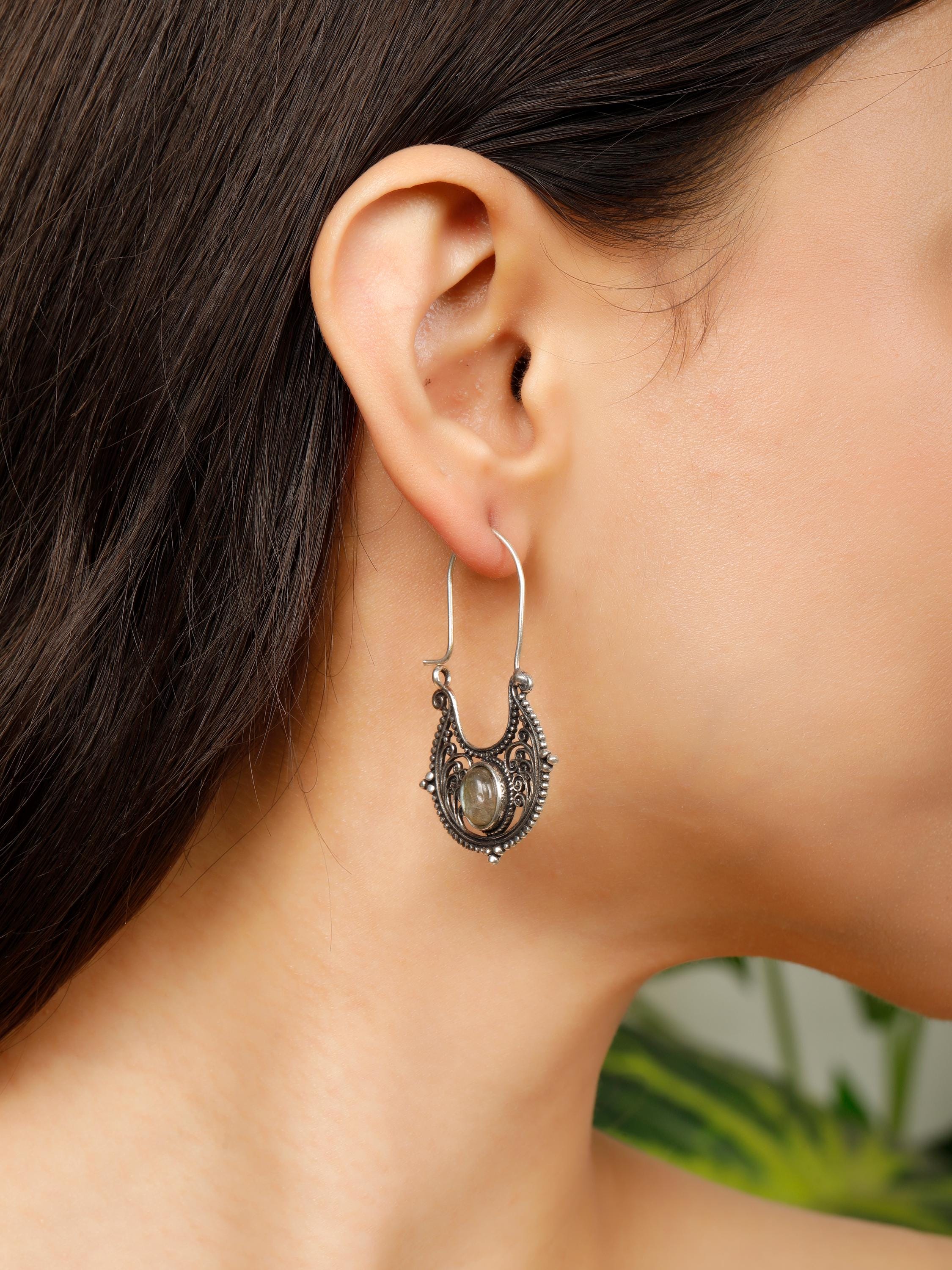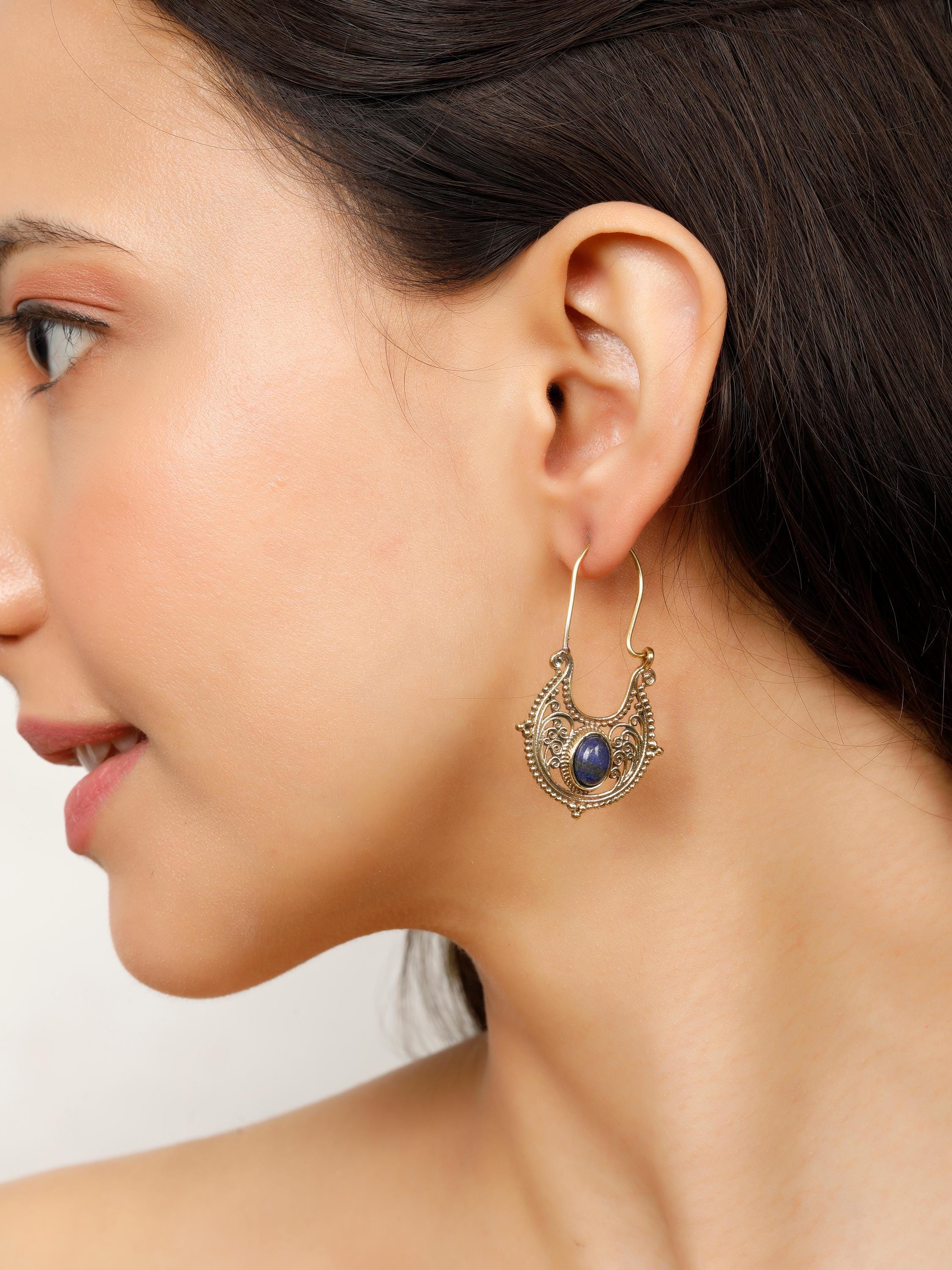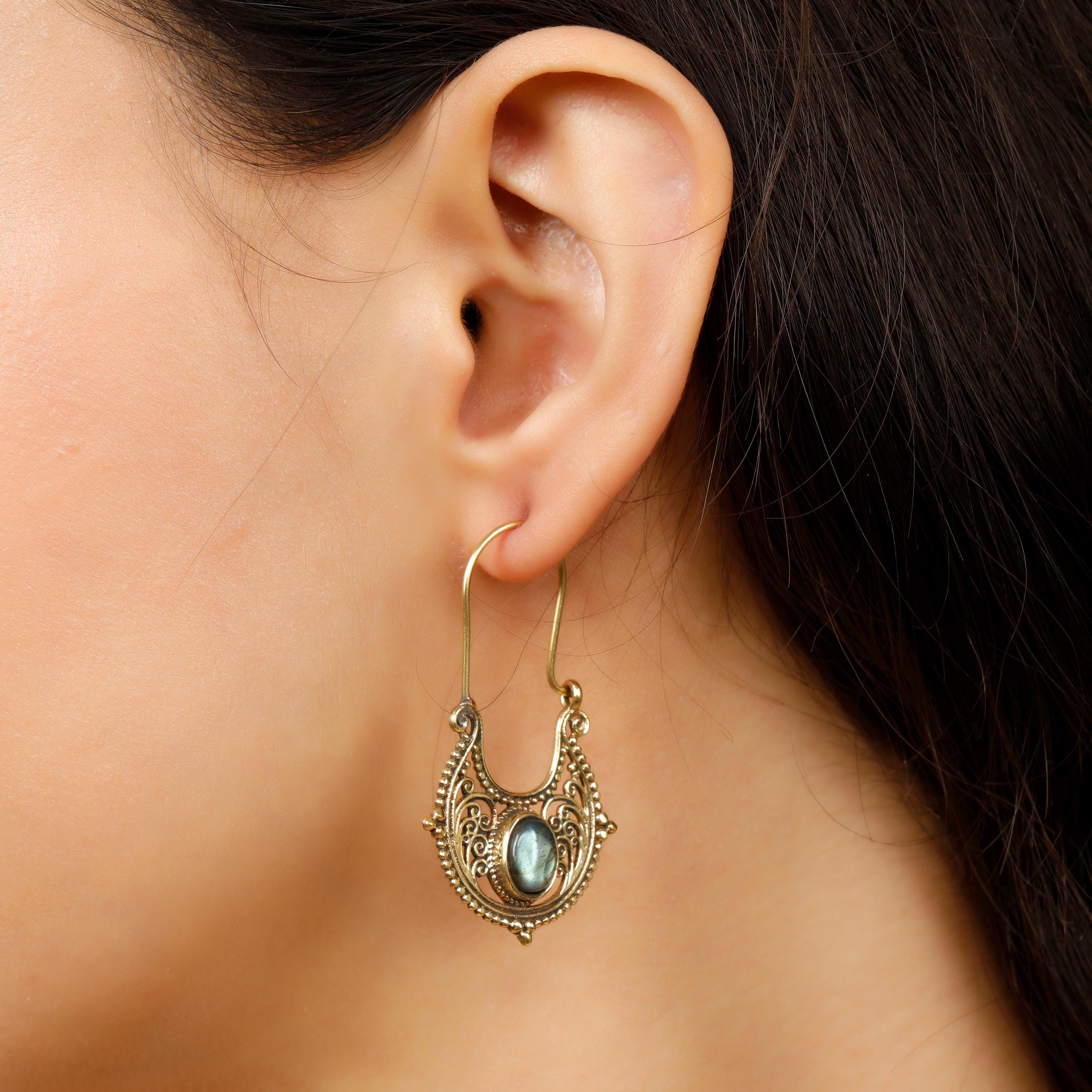 Discover our ethnic hoop earrings, decorated with coiled patterns and an oval semi-precious stone.