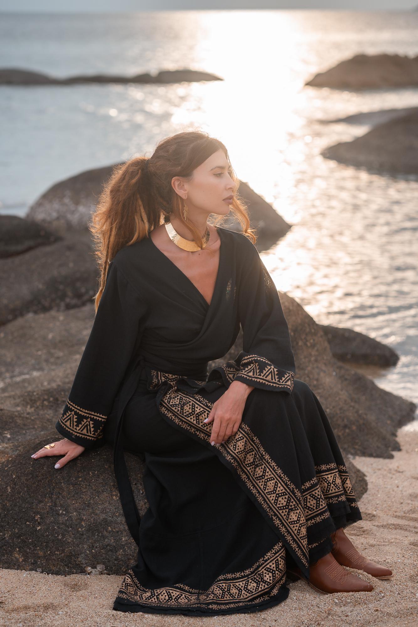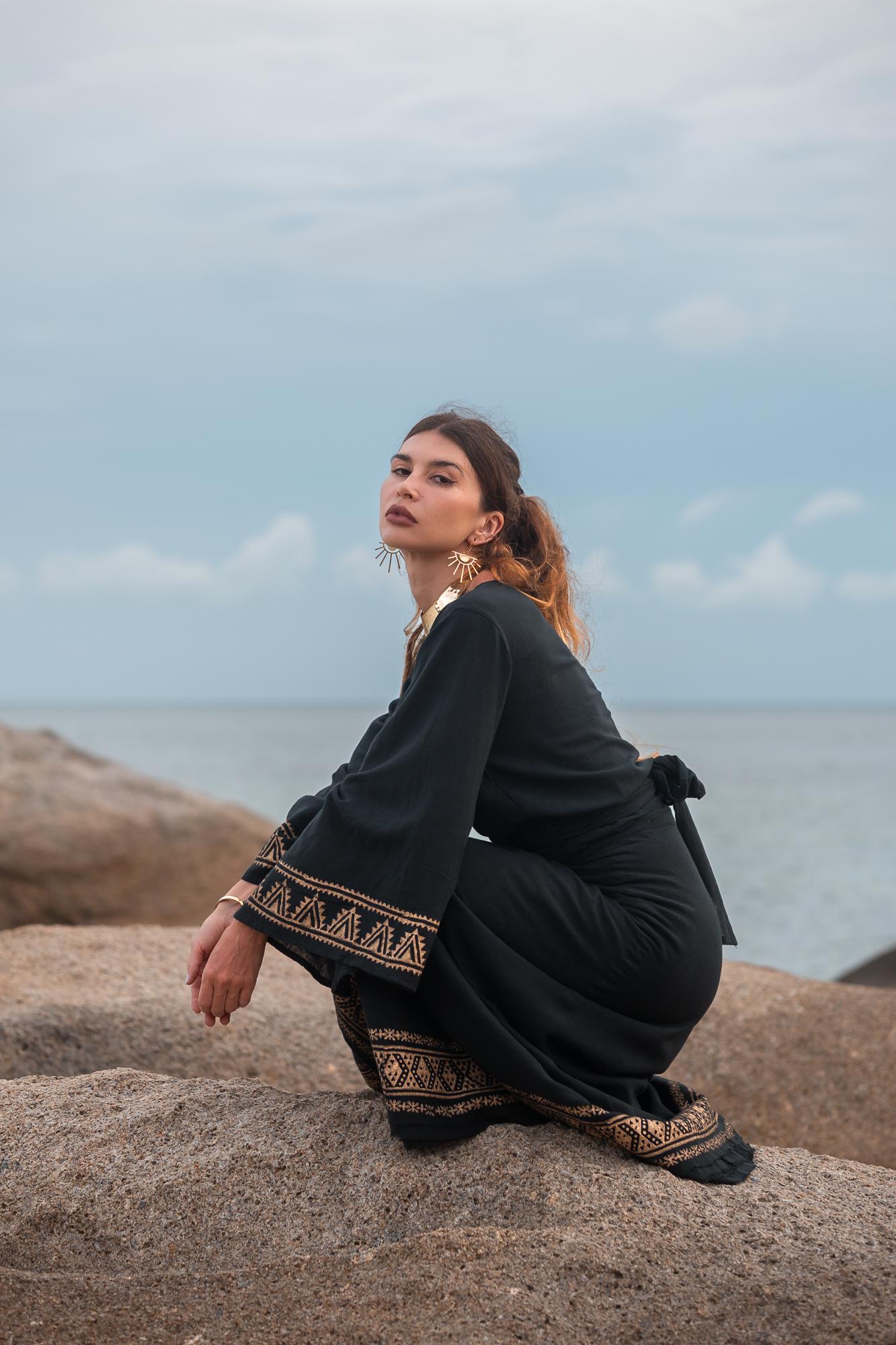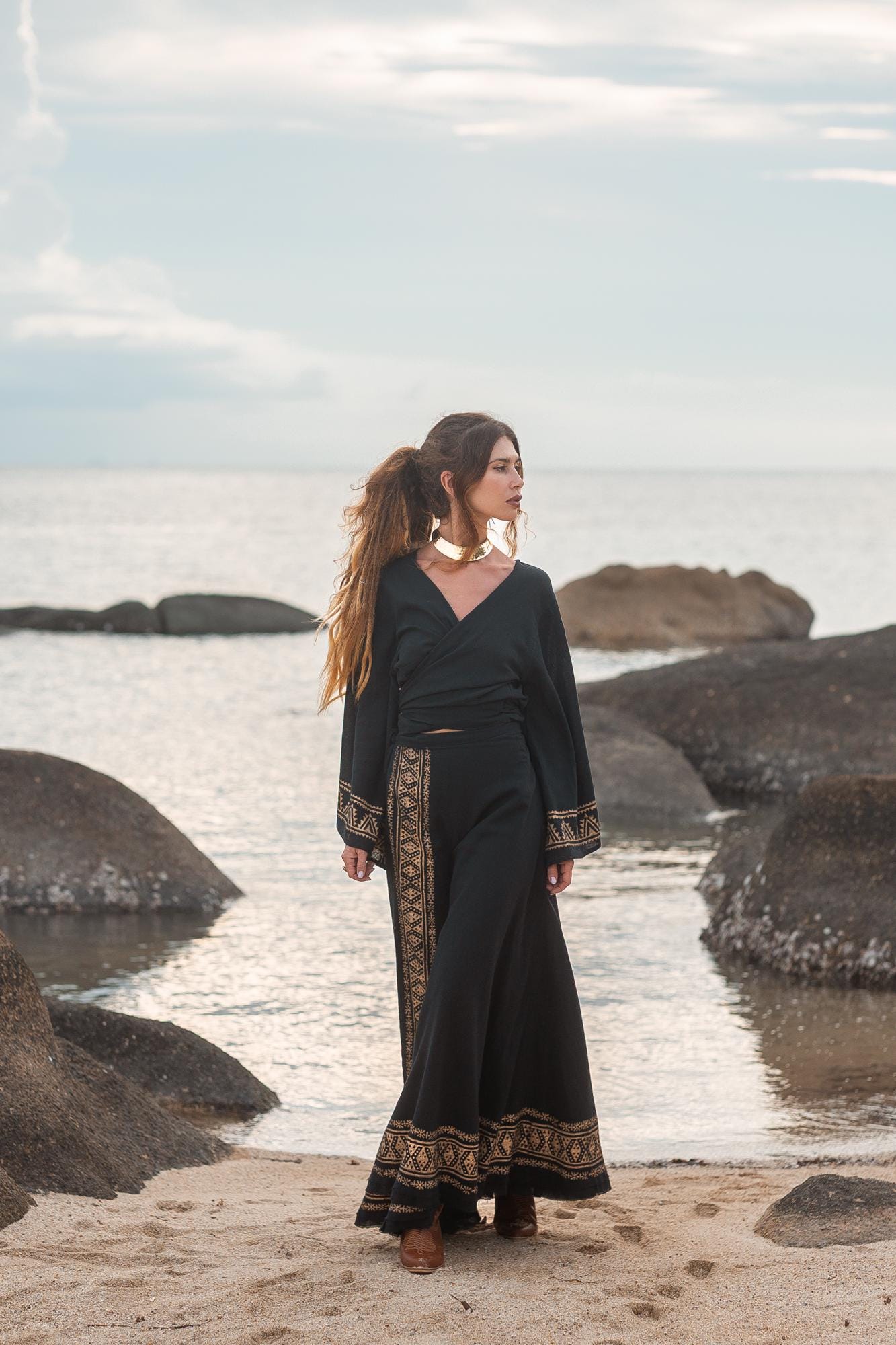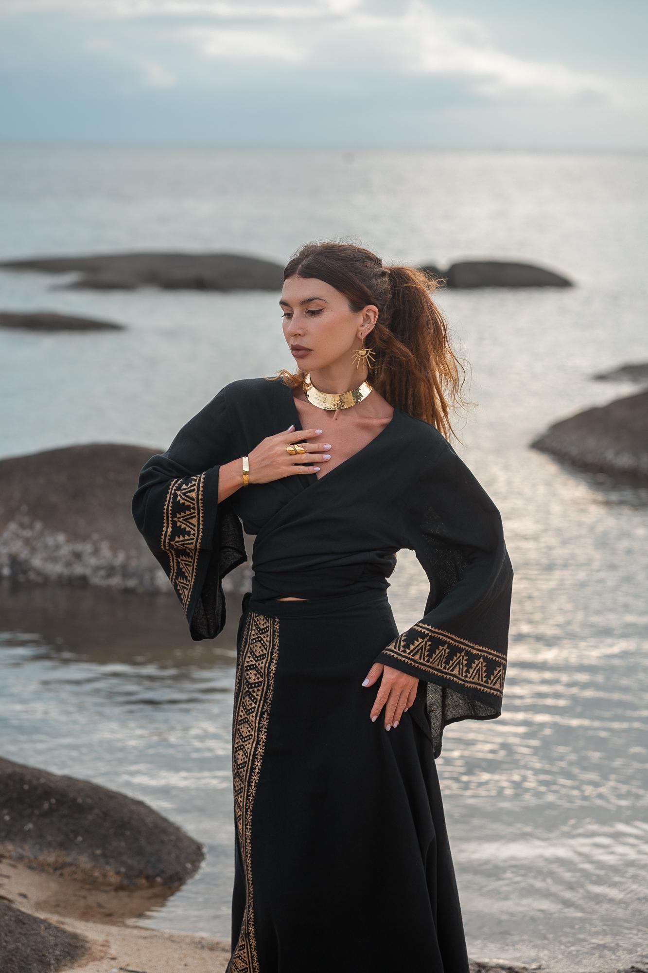 Let yourself be swept away by a fluid style with our bohemian wrap skirt in black vegetable-dyed raw cotton. More than just a piece of clothing, it's a statement. Crafted from luxuriously soft raw cotton and dyed with a sustainable black vegetable dye, this skirt embodies responsible fashion.
