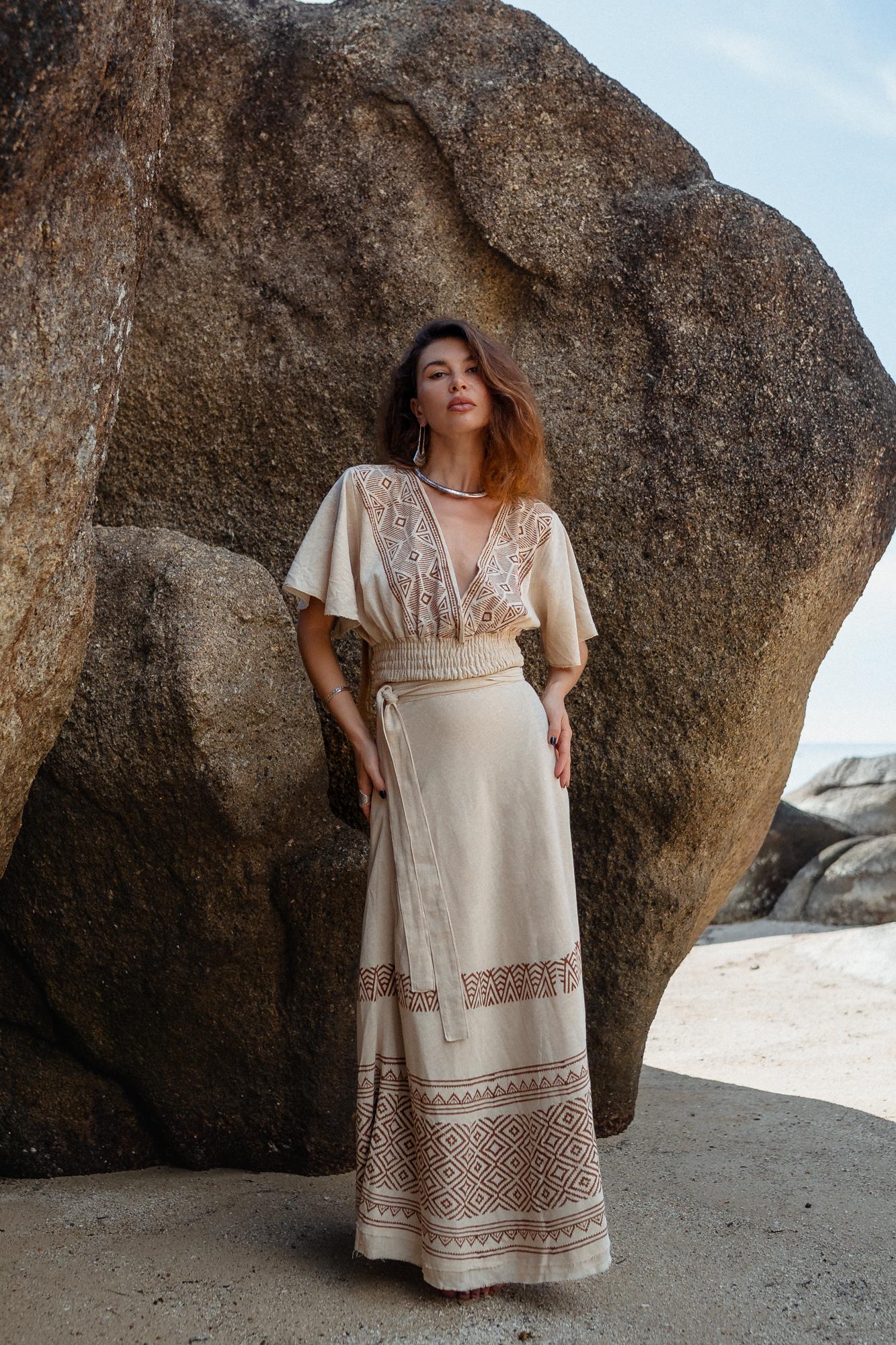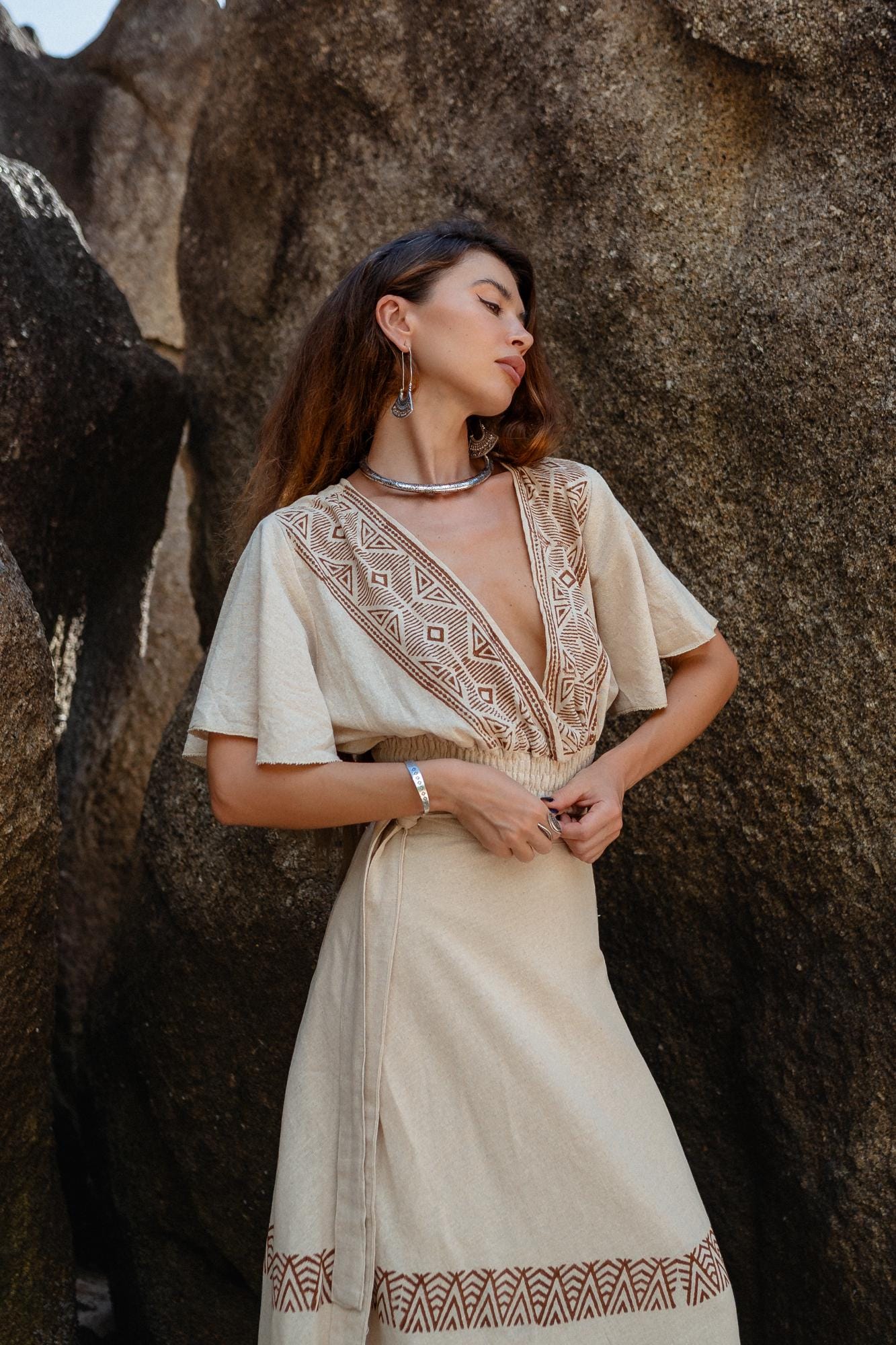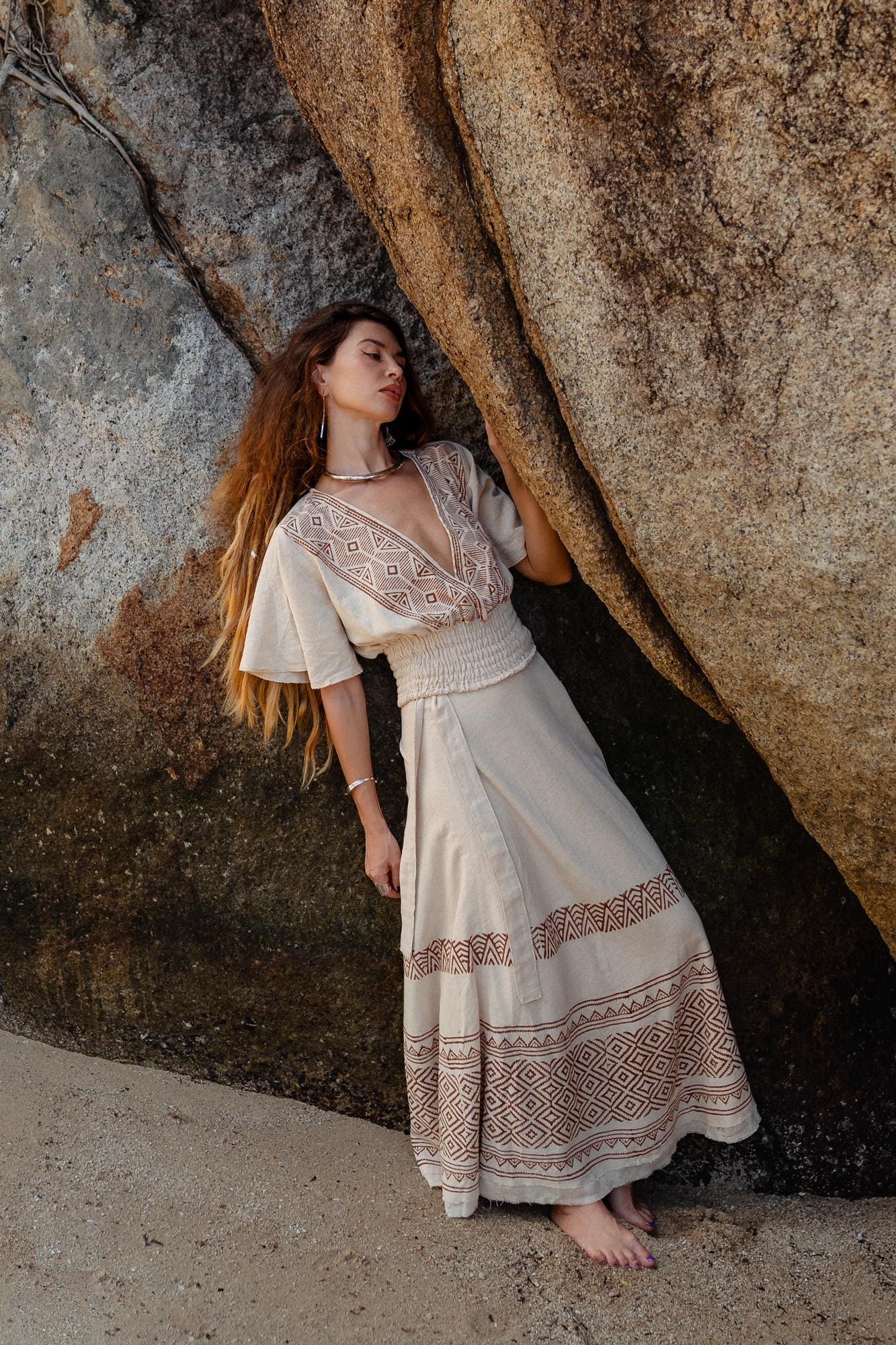 Drift into a world of free-flowing style with our Vegetable Dye Raw Cotton Bohemian Wrap Skirt. This isn't just clothing; it's a statement. Crafted from luxuriously soft raw cotton, and dyed using a sustainable vegetable dye, this skirt embodies conscious fashion.