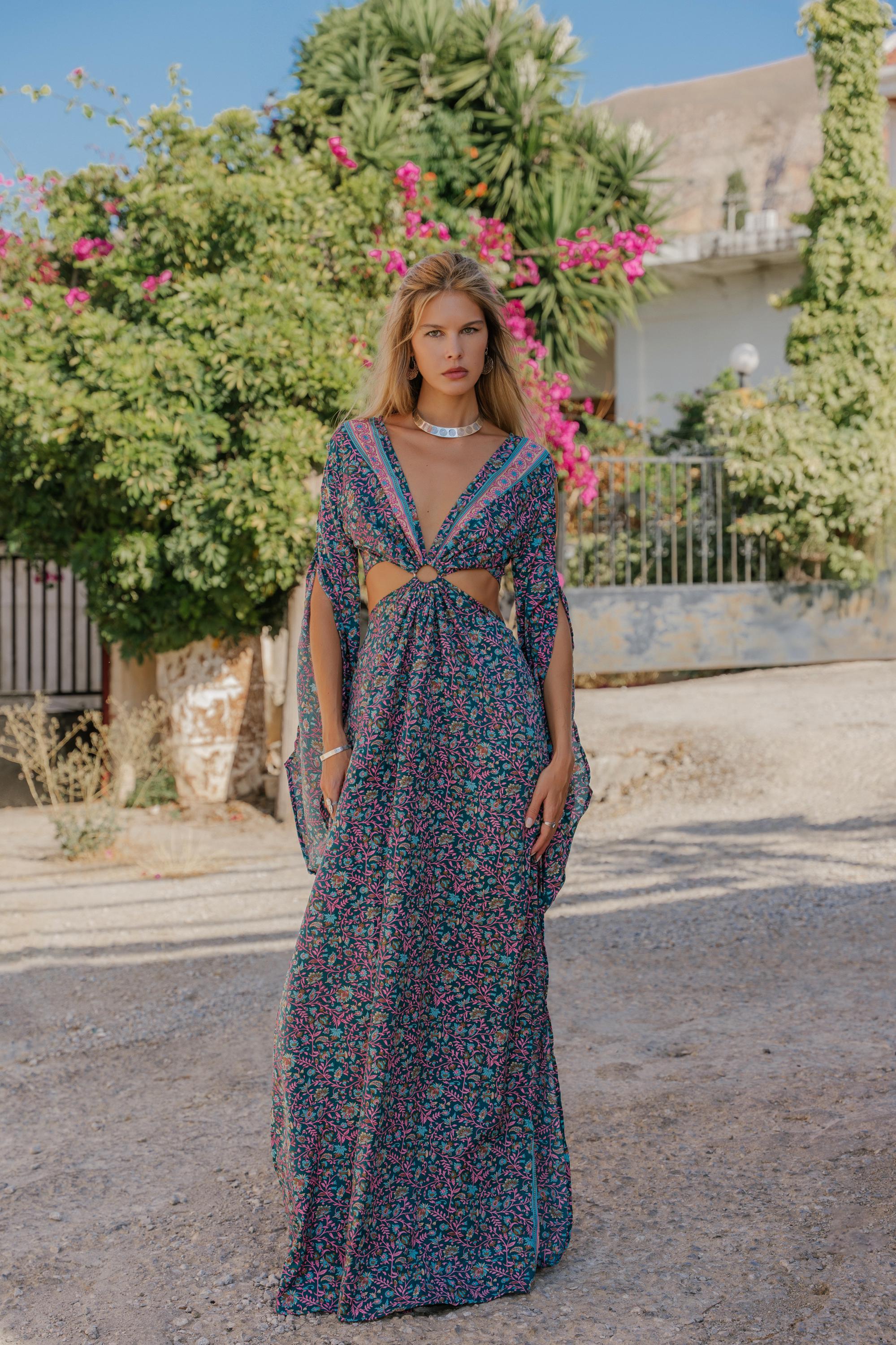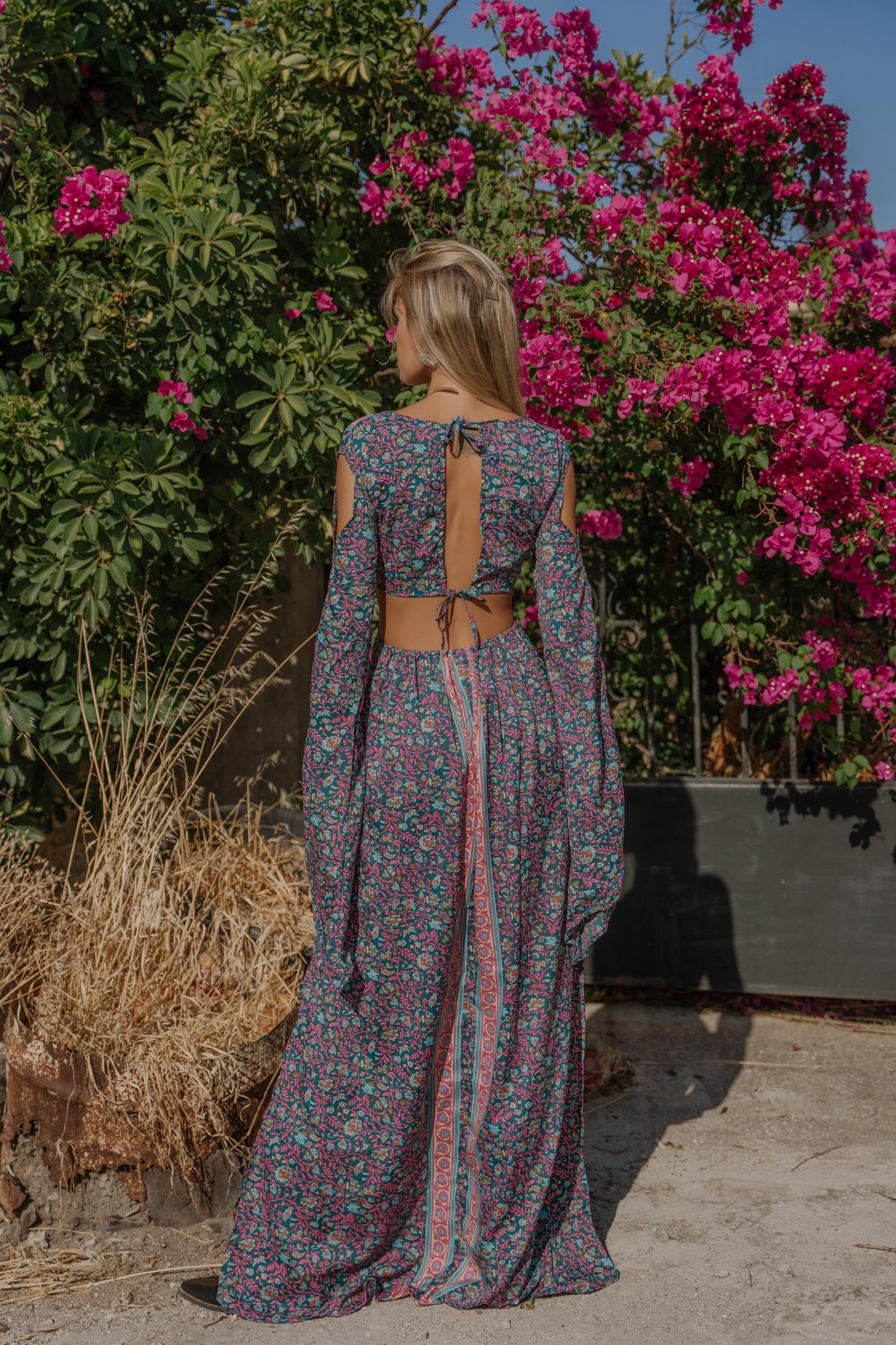 The daring side slits add a touch of drama, while the sophisticated ring detail at the front draws the eye. An alluring opening above the hips creates a subtle glimpse of skin, and the unique tie-back design allows for a customized and secure fit.