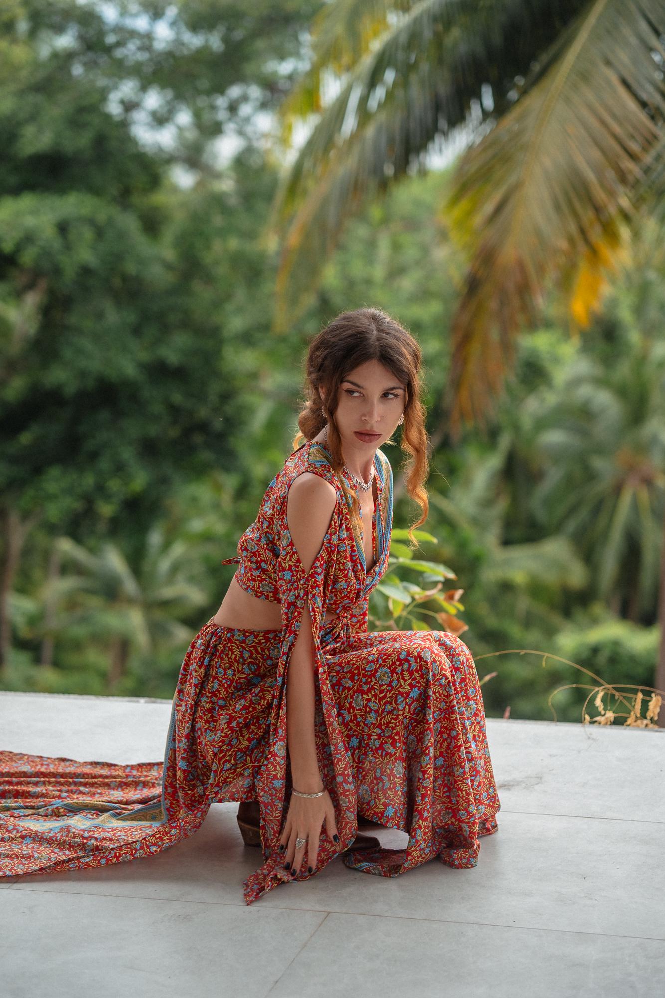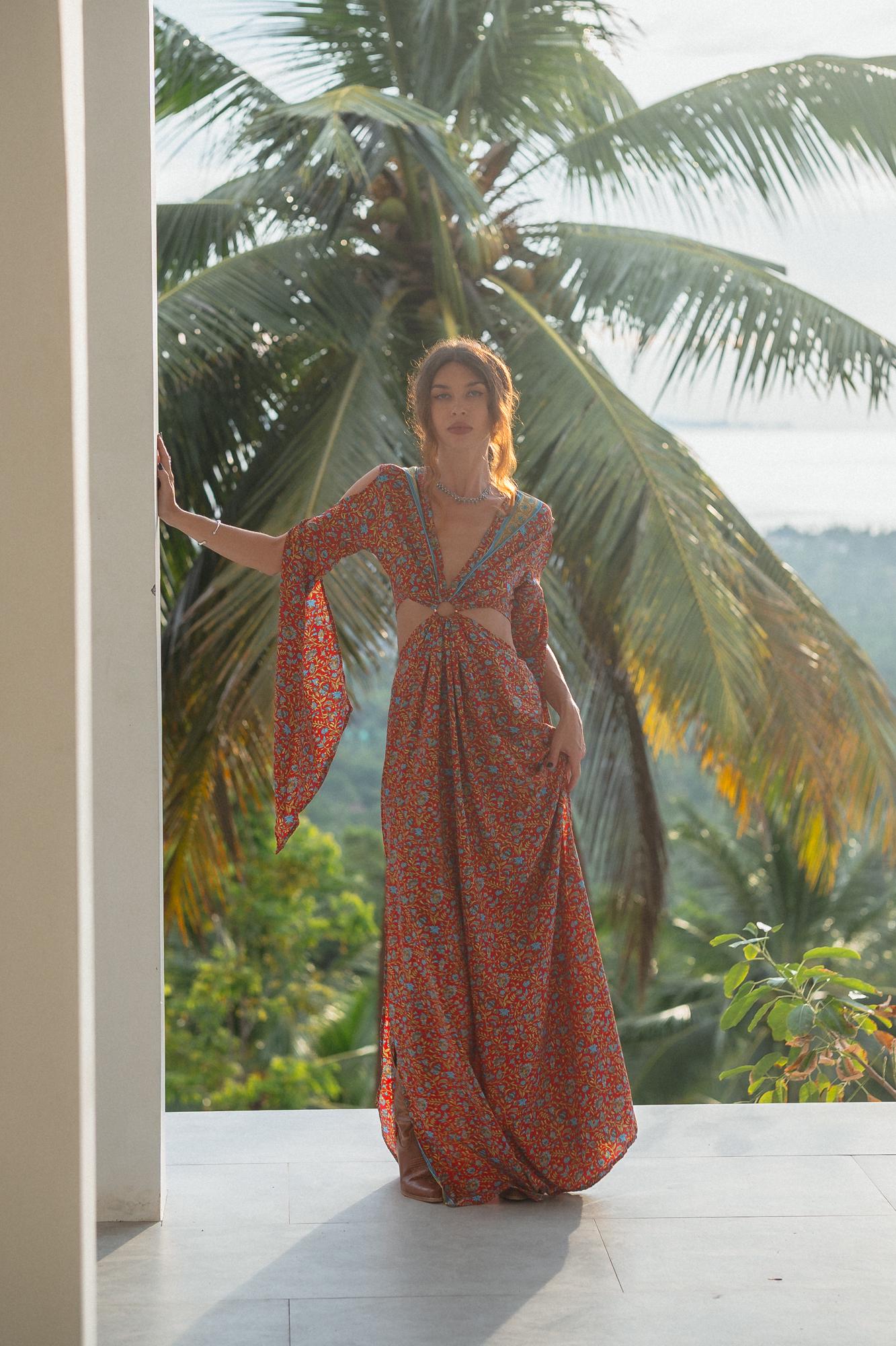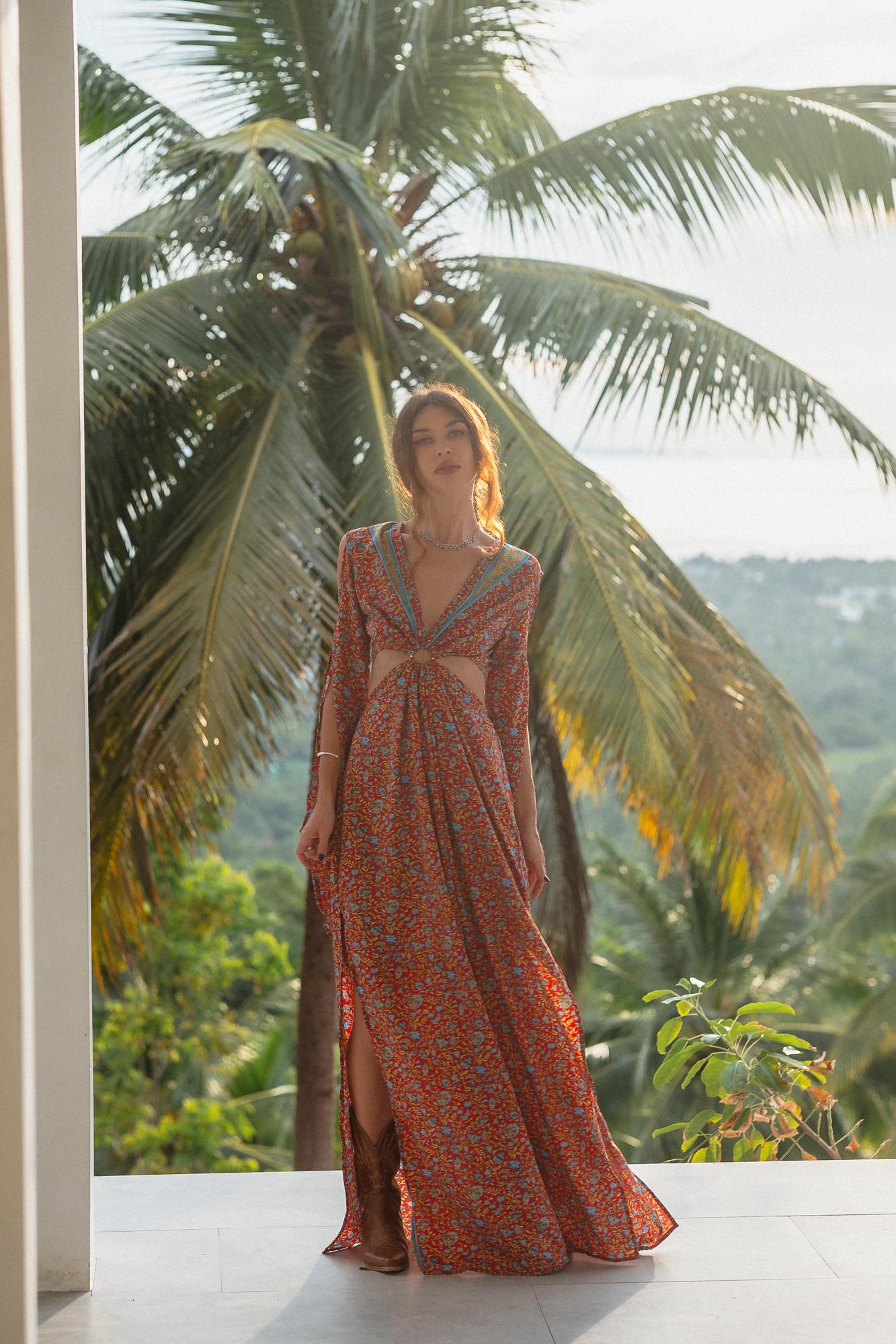 The daring side slits add a touch of drama, while the sophisticated ring detail at the front draws the eye. An alluring opening above the hips creates a subtle glimpse of skin, and the unique tie-back design allows for a customized and secure fit.