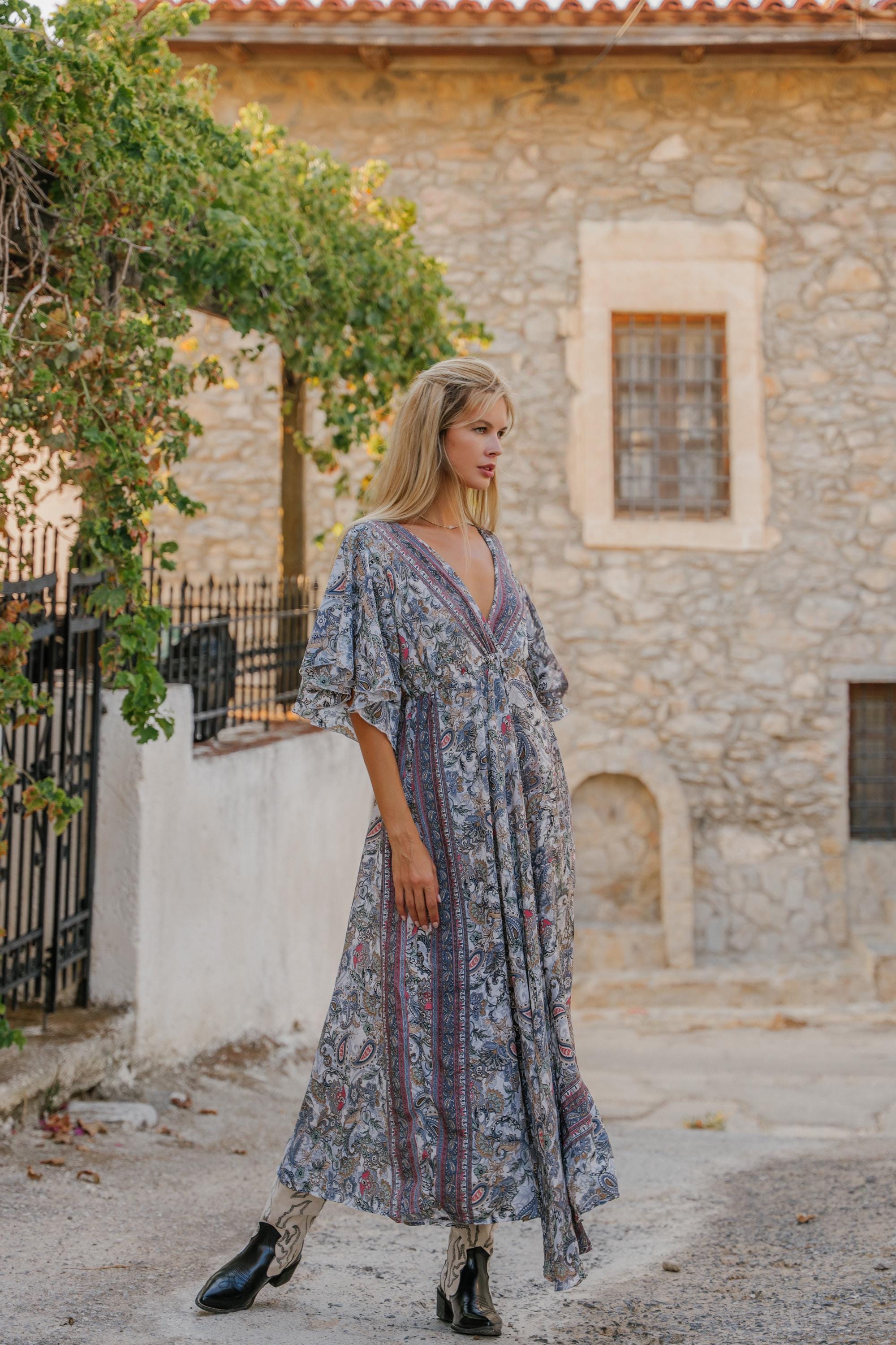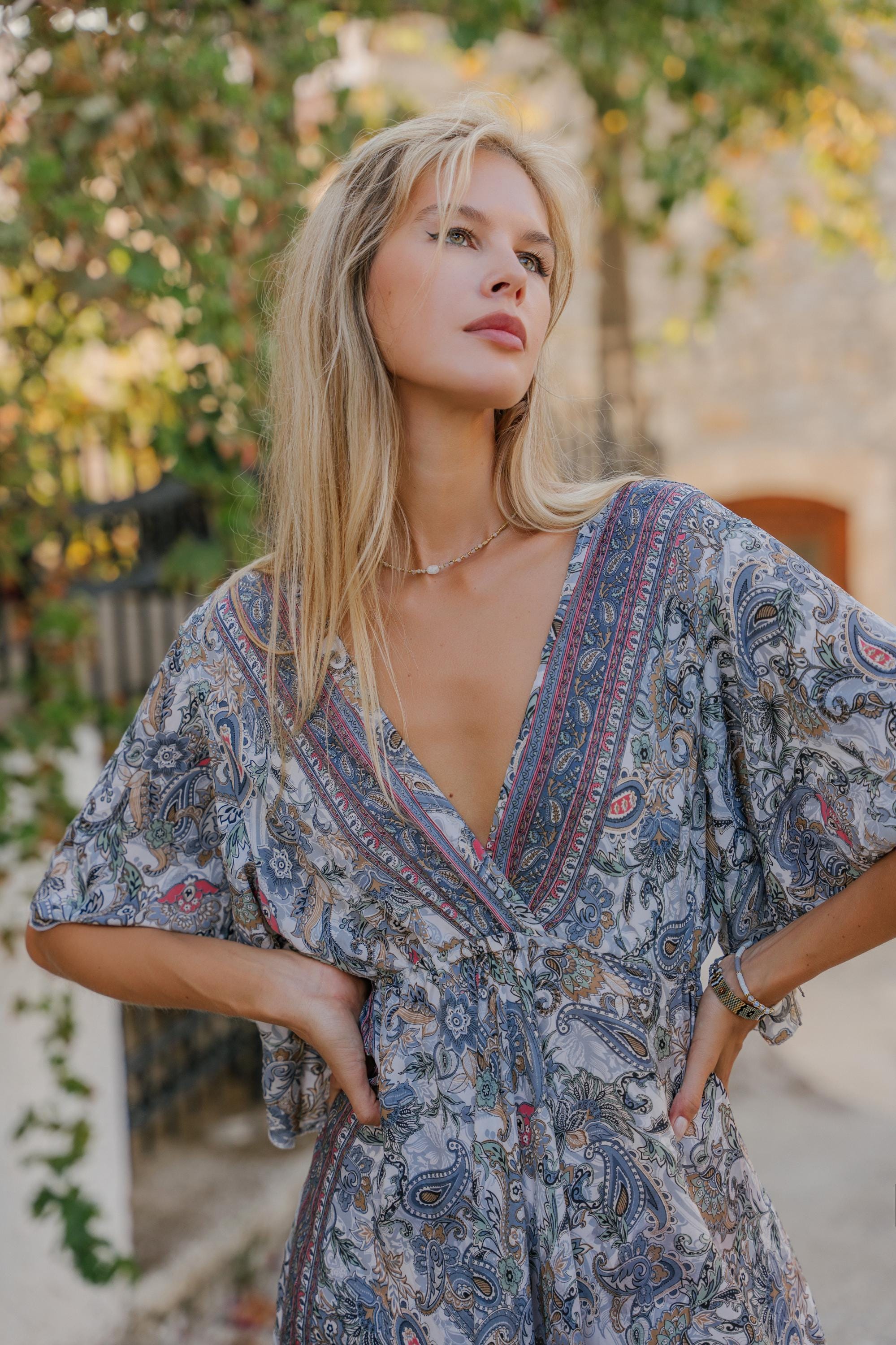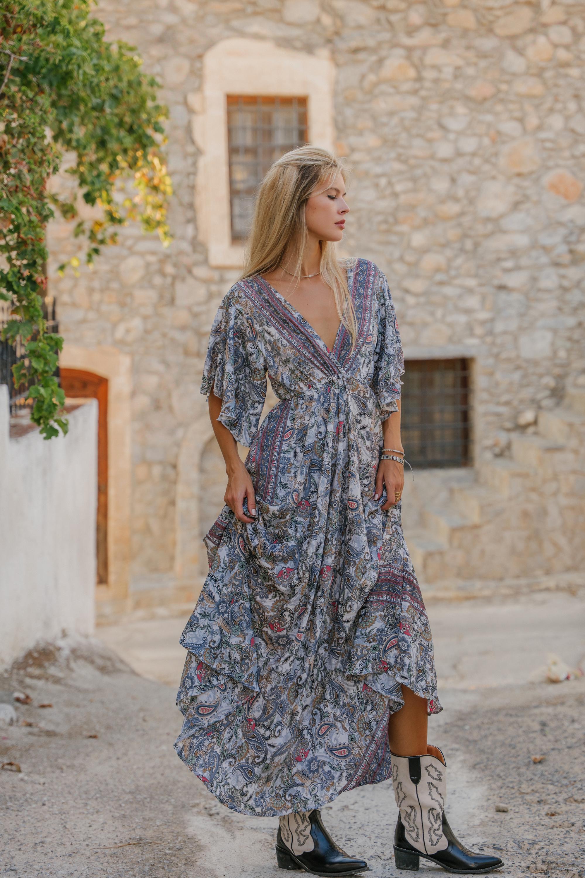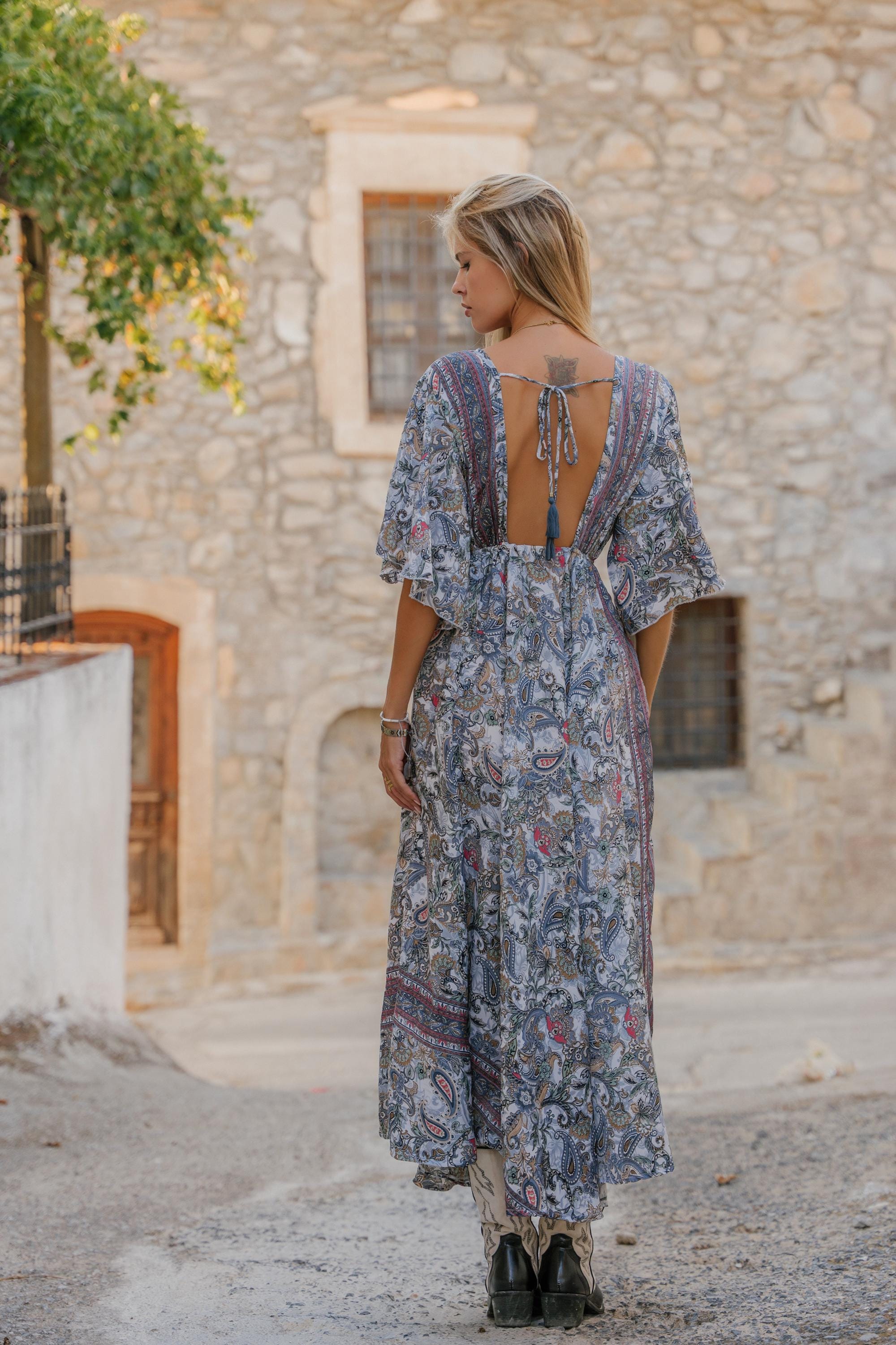This dress features a bold paisley print, designed to capture the free-spirited essence of bohemian style. The dramatic butterfly sleeves add a touch of whimsy and elegance, while the open back design creates a captivating and alluring silhouette.