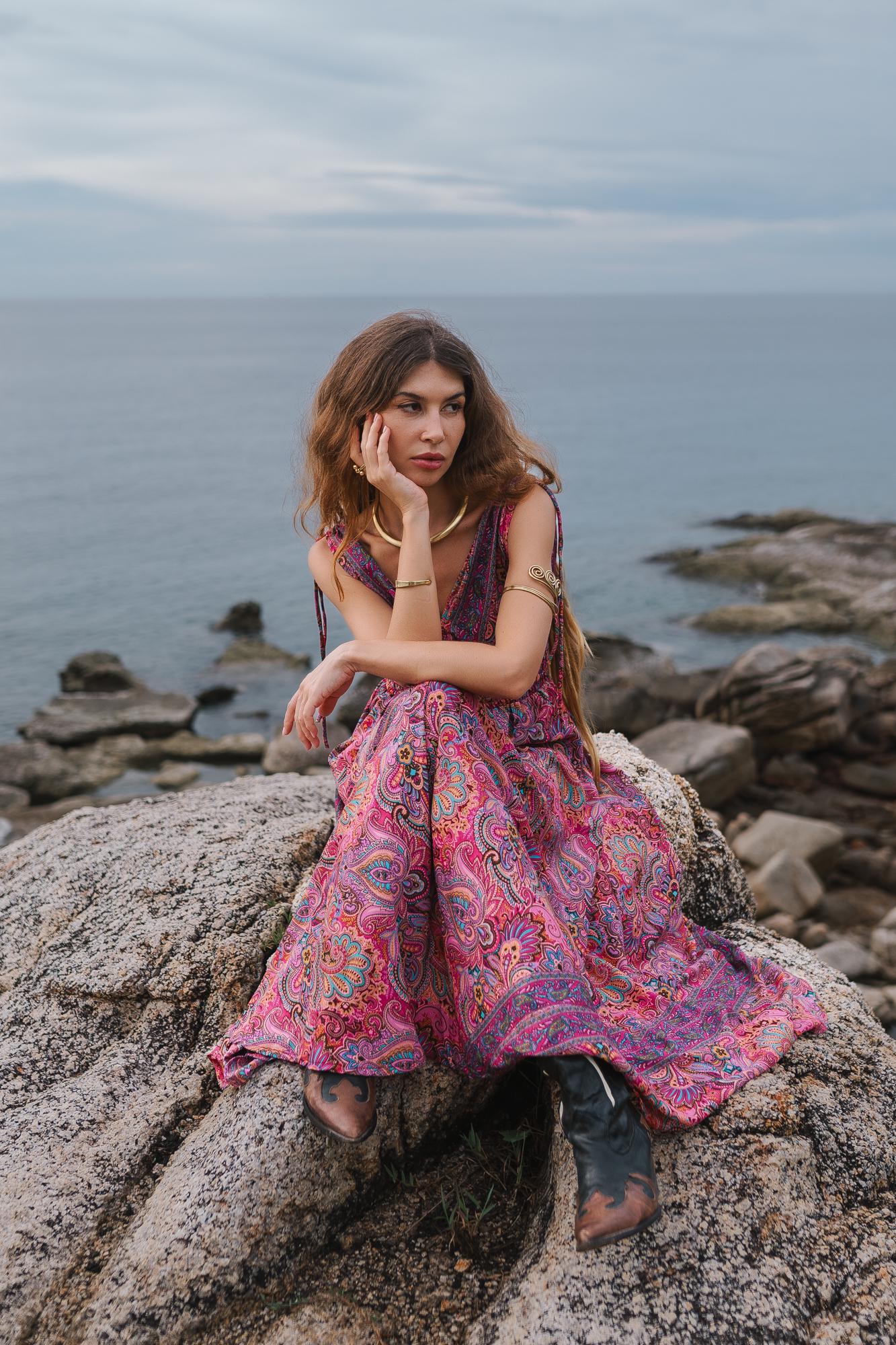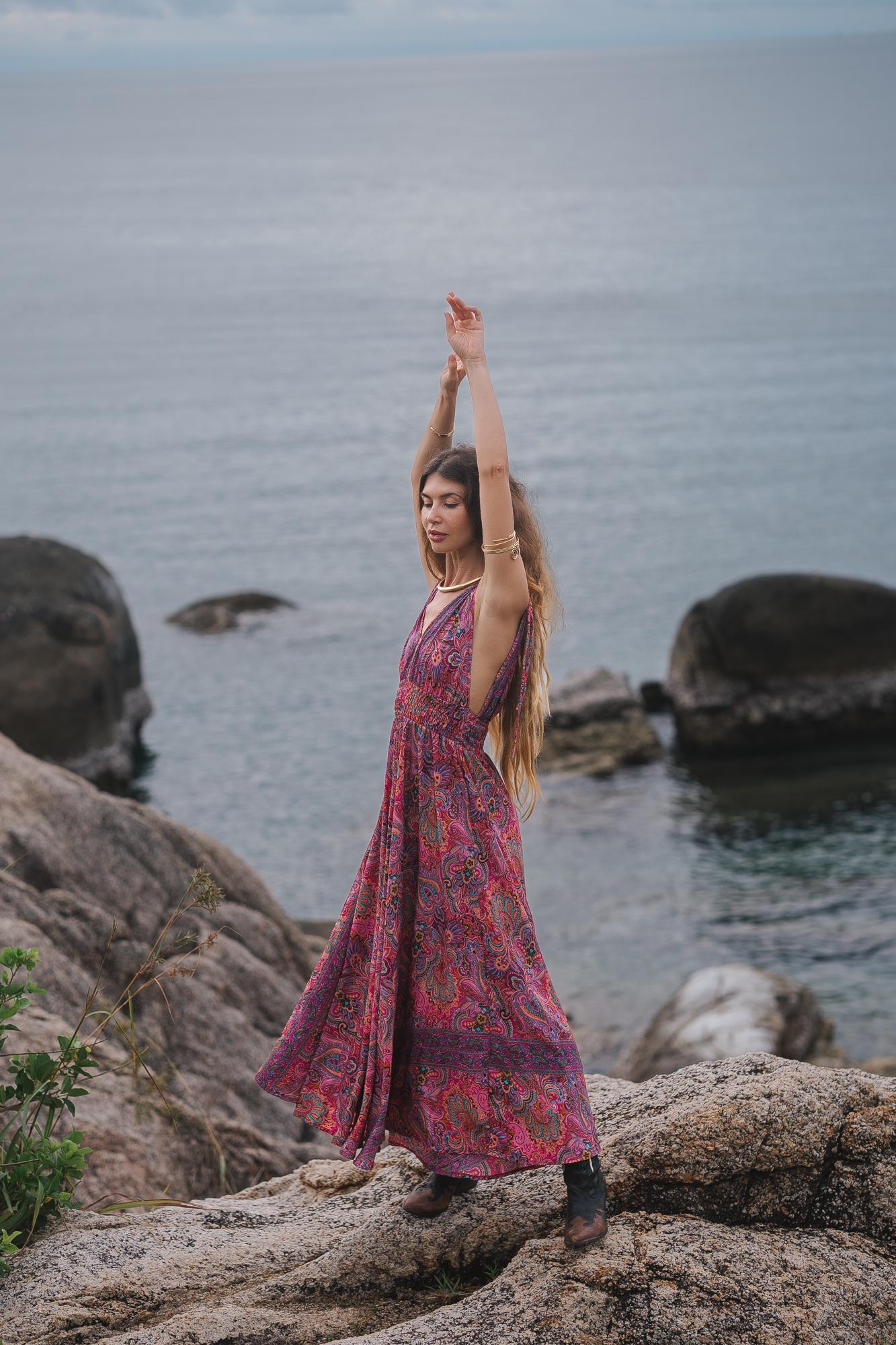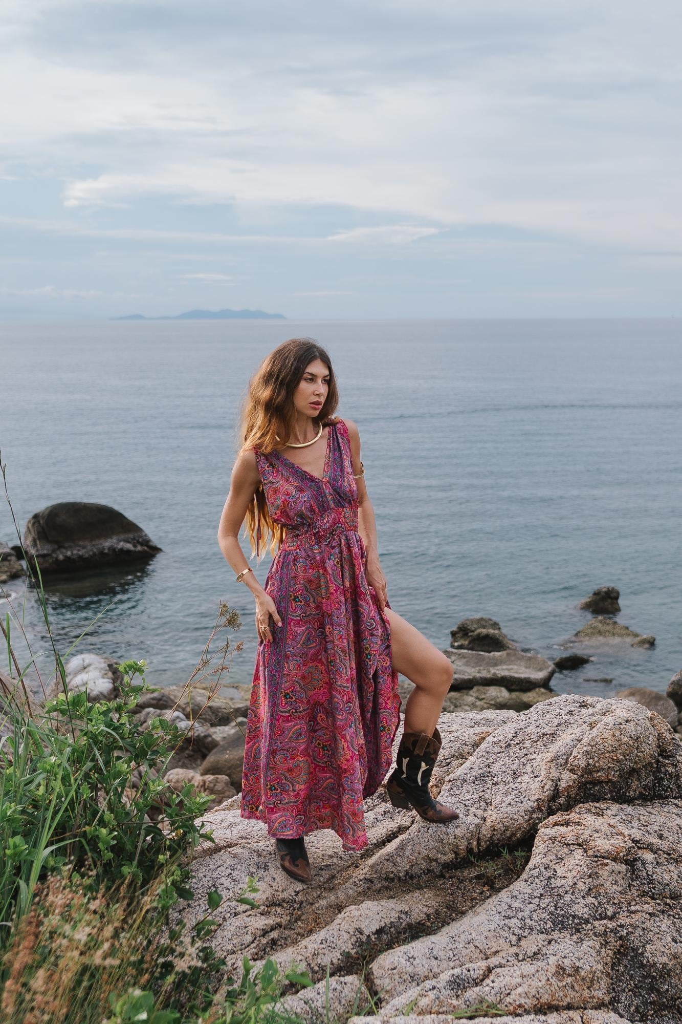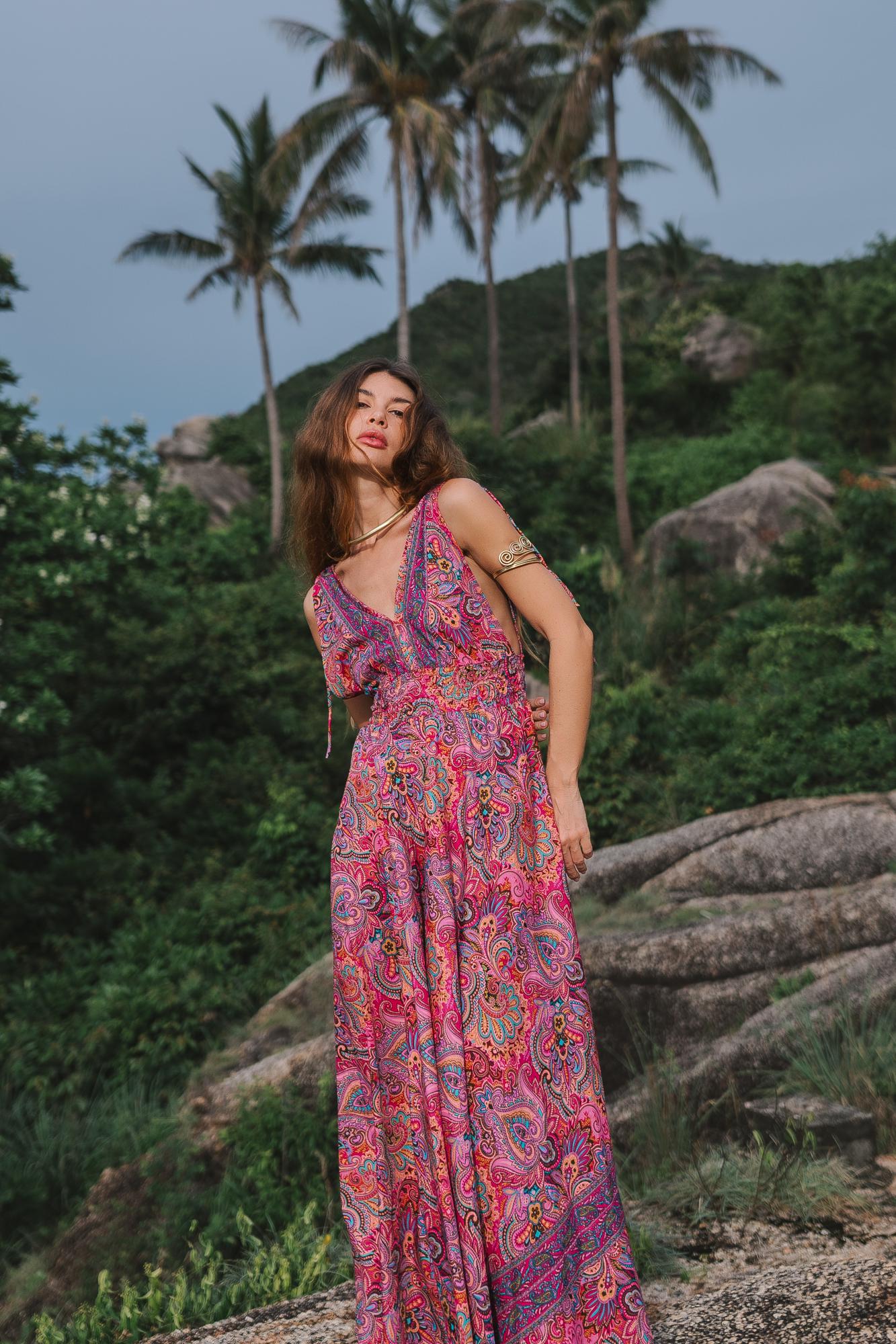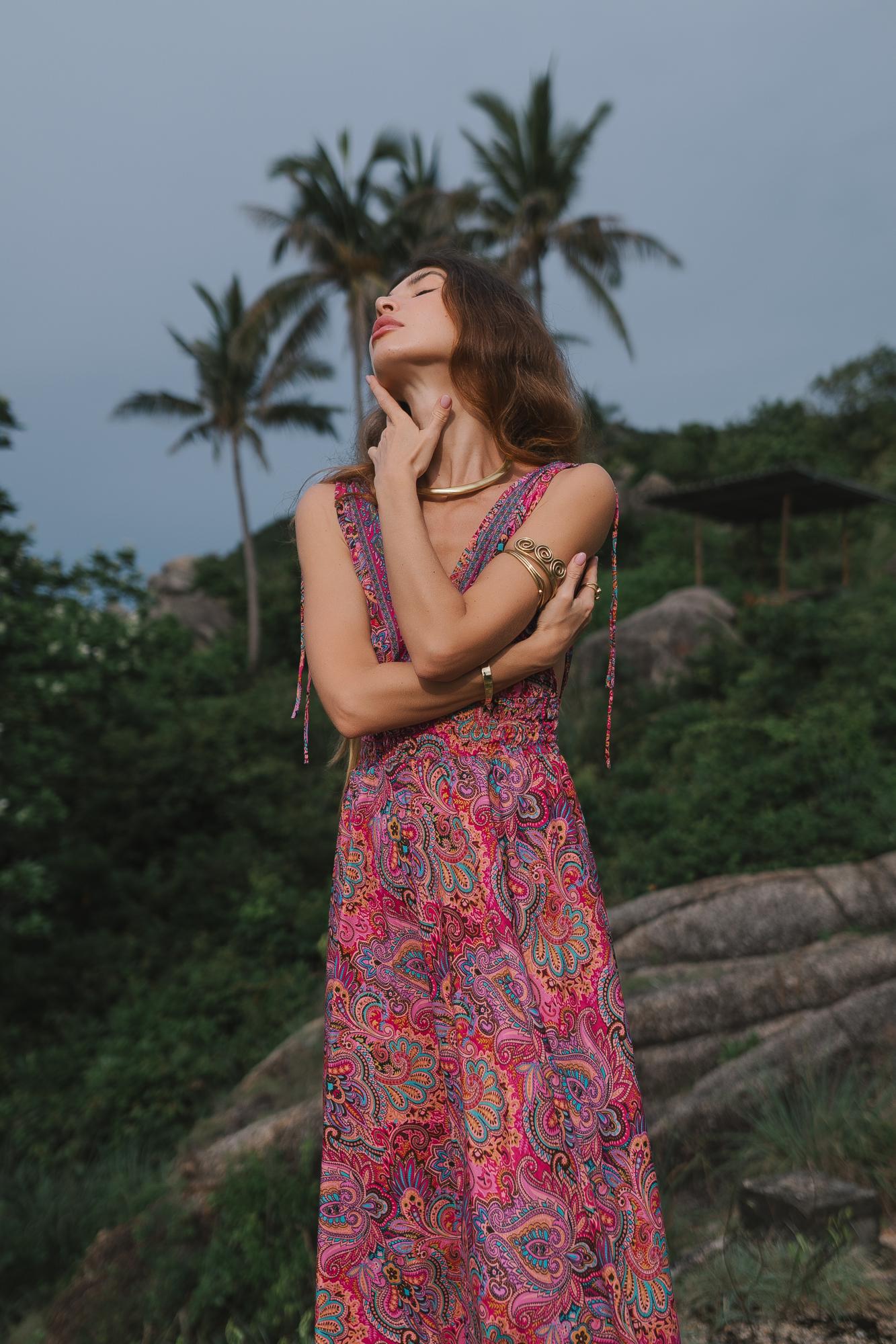 It features a vibrant paisley print, a flattering V-neckline, smocked under the bust for a perfect fit, and a subtly alluring open back.