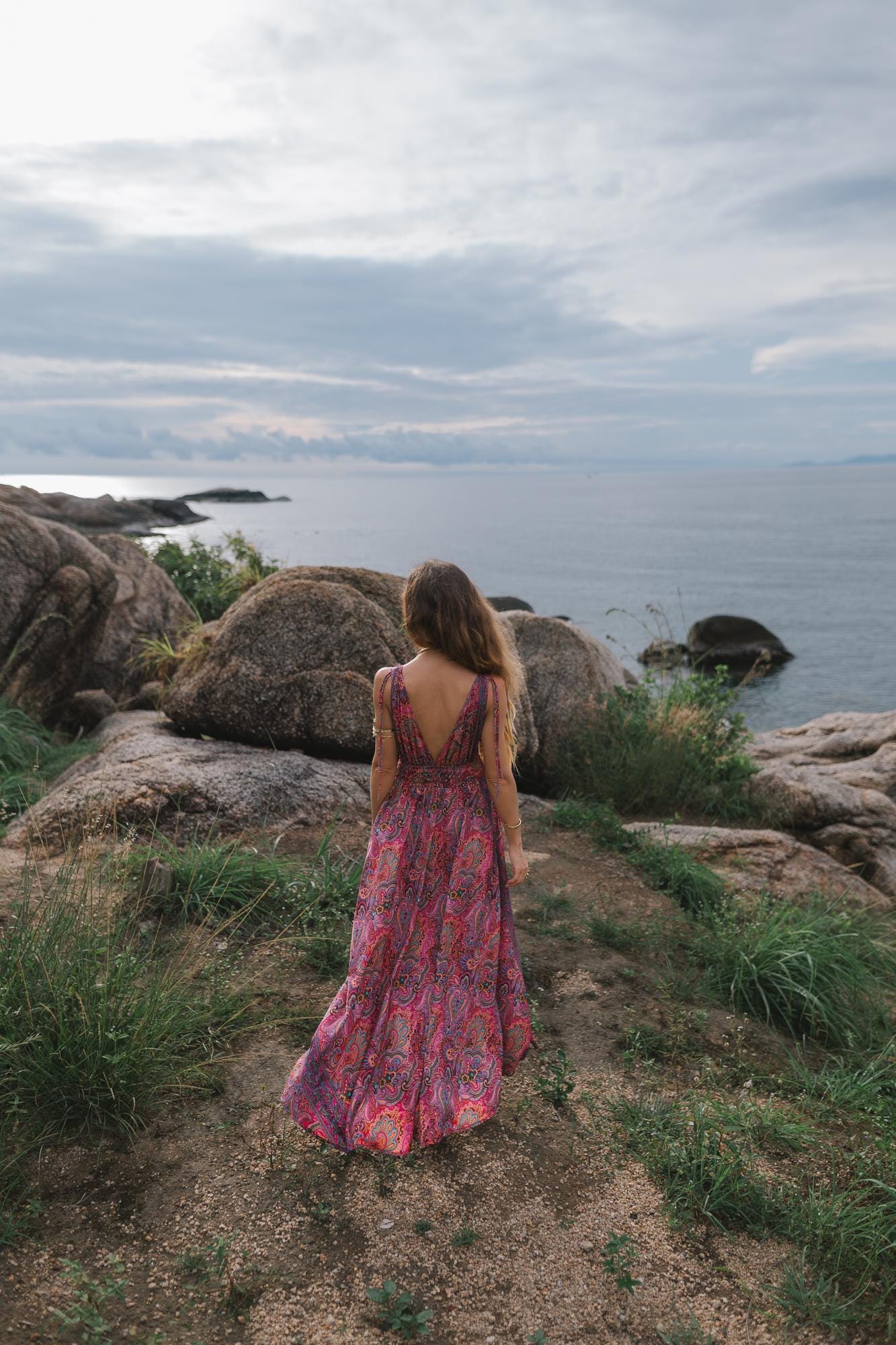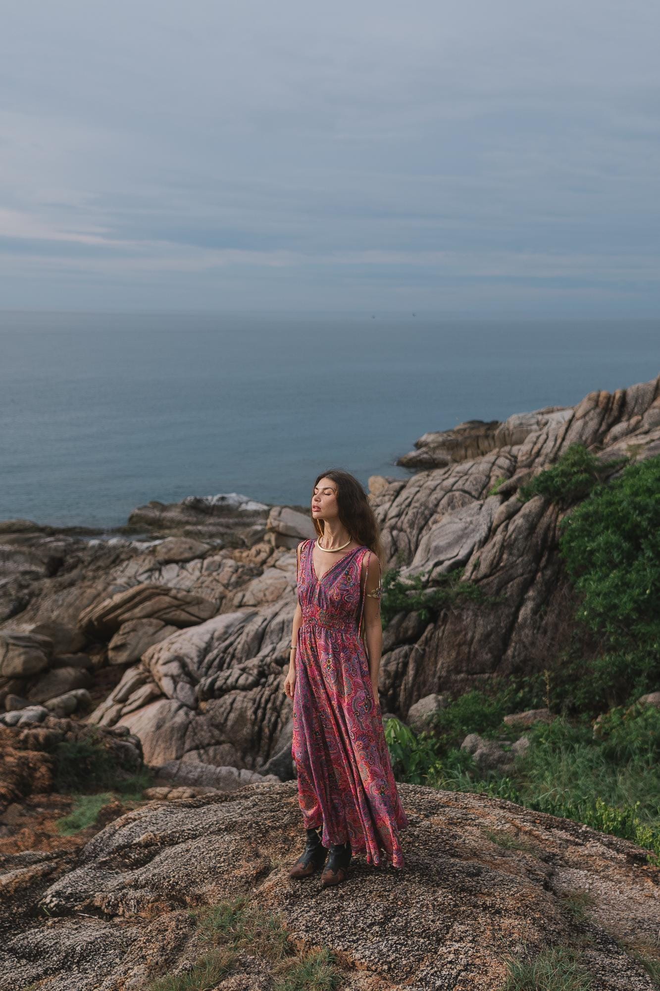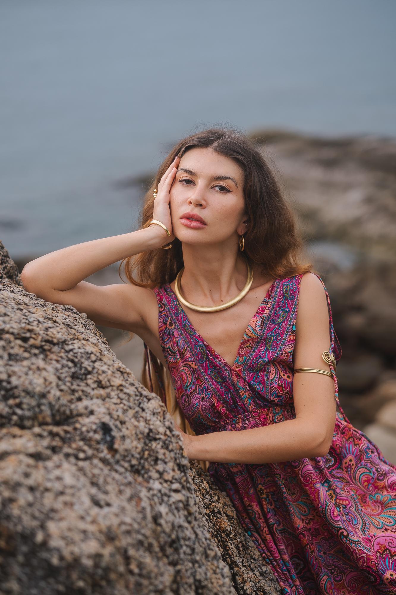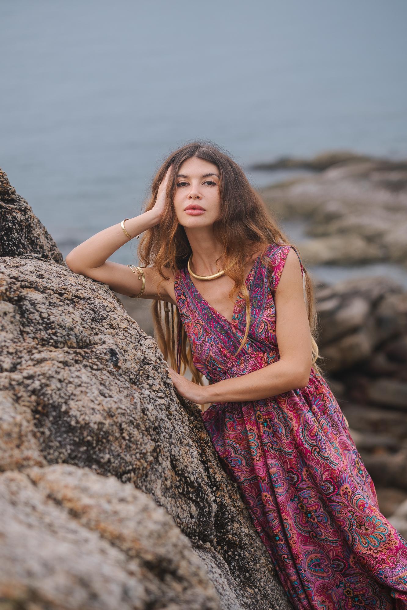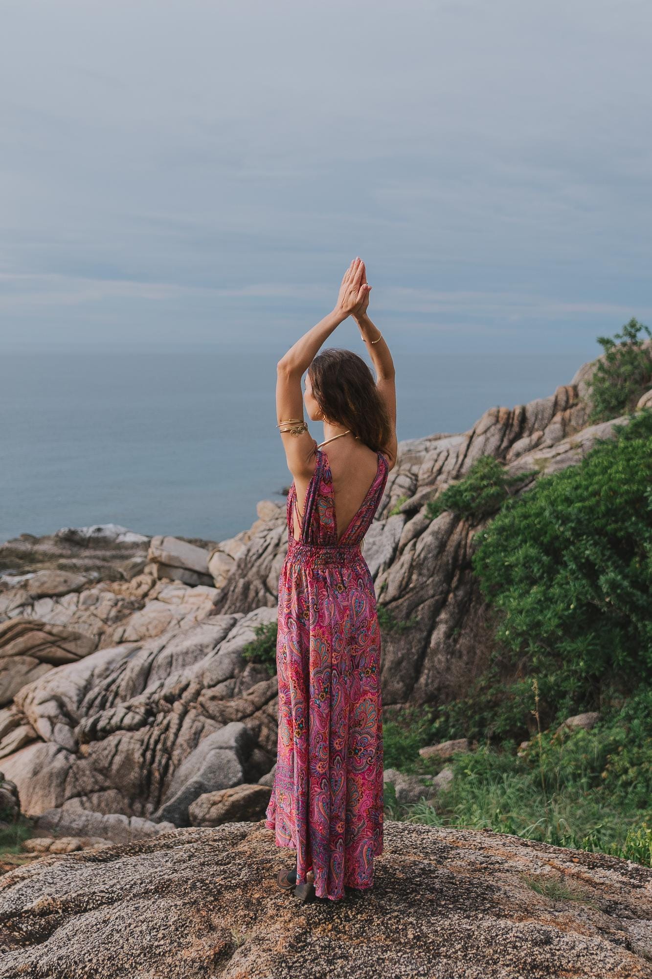 It features a vibrant paisley print, a flattering V-neckline, smocked under the bust for a perfect fit, and a subtly alluring open back.