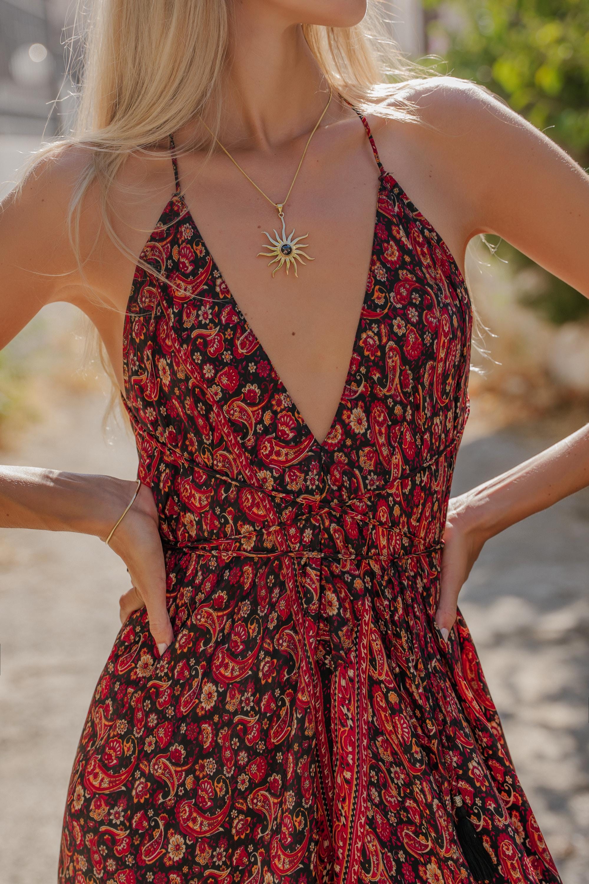 This lightweight and free-flowing dress is the perfect embodiment of carefree style. The vibrant paisley print dances across the soft polyester fabric, creating a mesmerizing kaleidoscope of color.