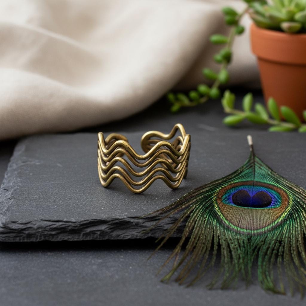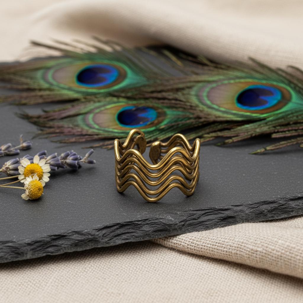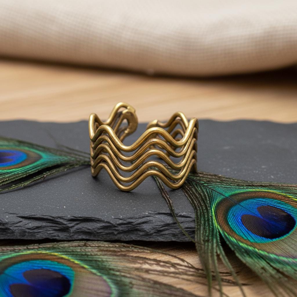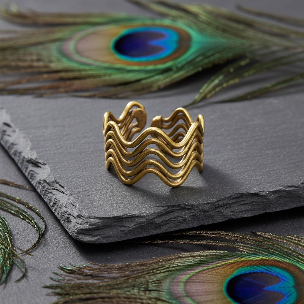 This striking adjustable brass ring features a bold geometrical zigzag pattern in a modern openwork waves design. The clean lines and minimalist aesthetic make it a versatile piece for any outfit.