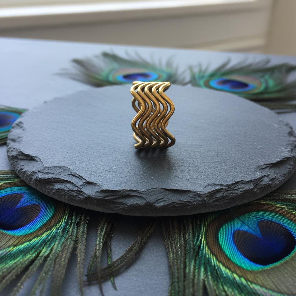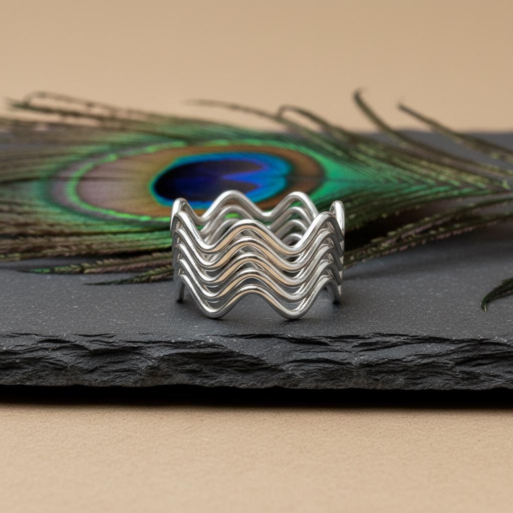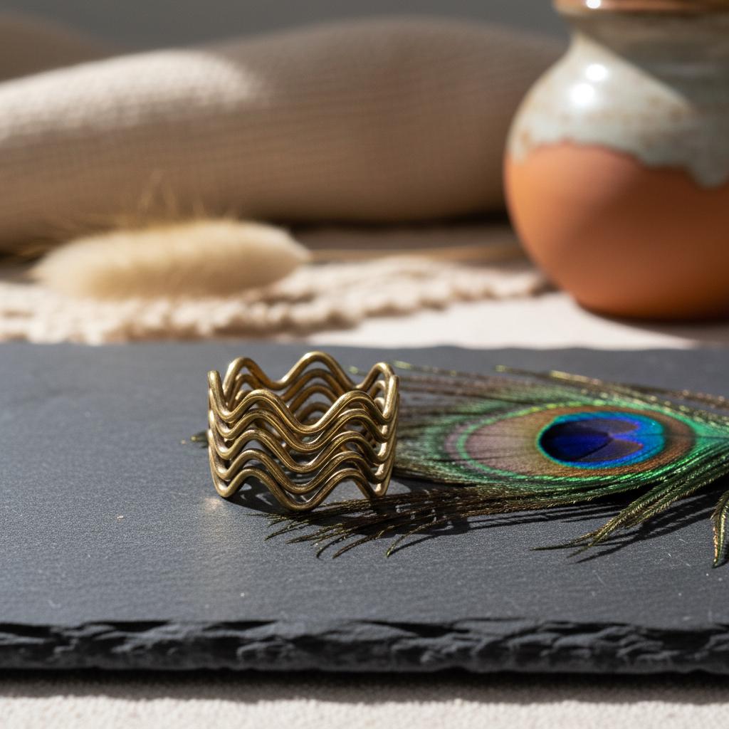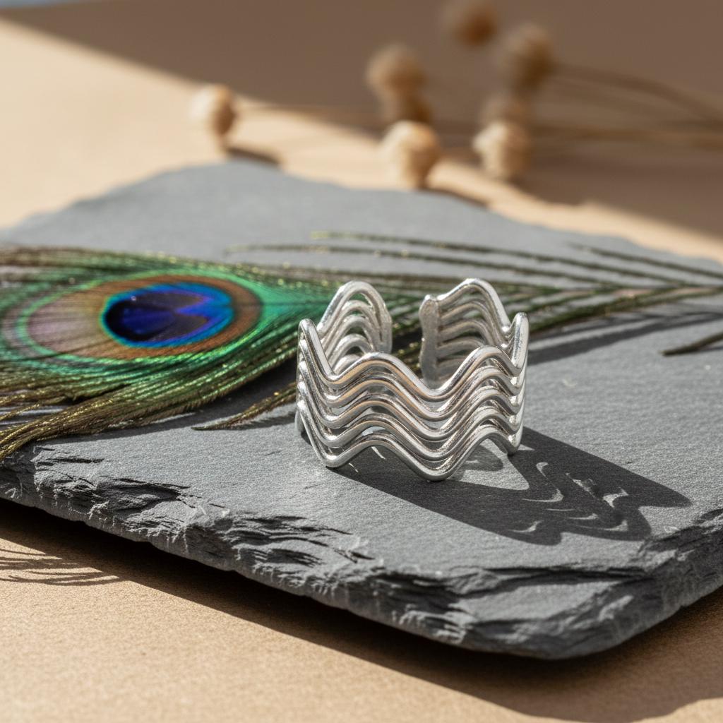 This striking adjustable brass ring features a bold geometrical zigzag pattern in a modern openwork waves design. The clean lines and minimalist aesthetic make it a versatile piece for any outfit.