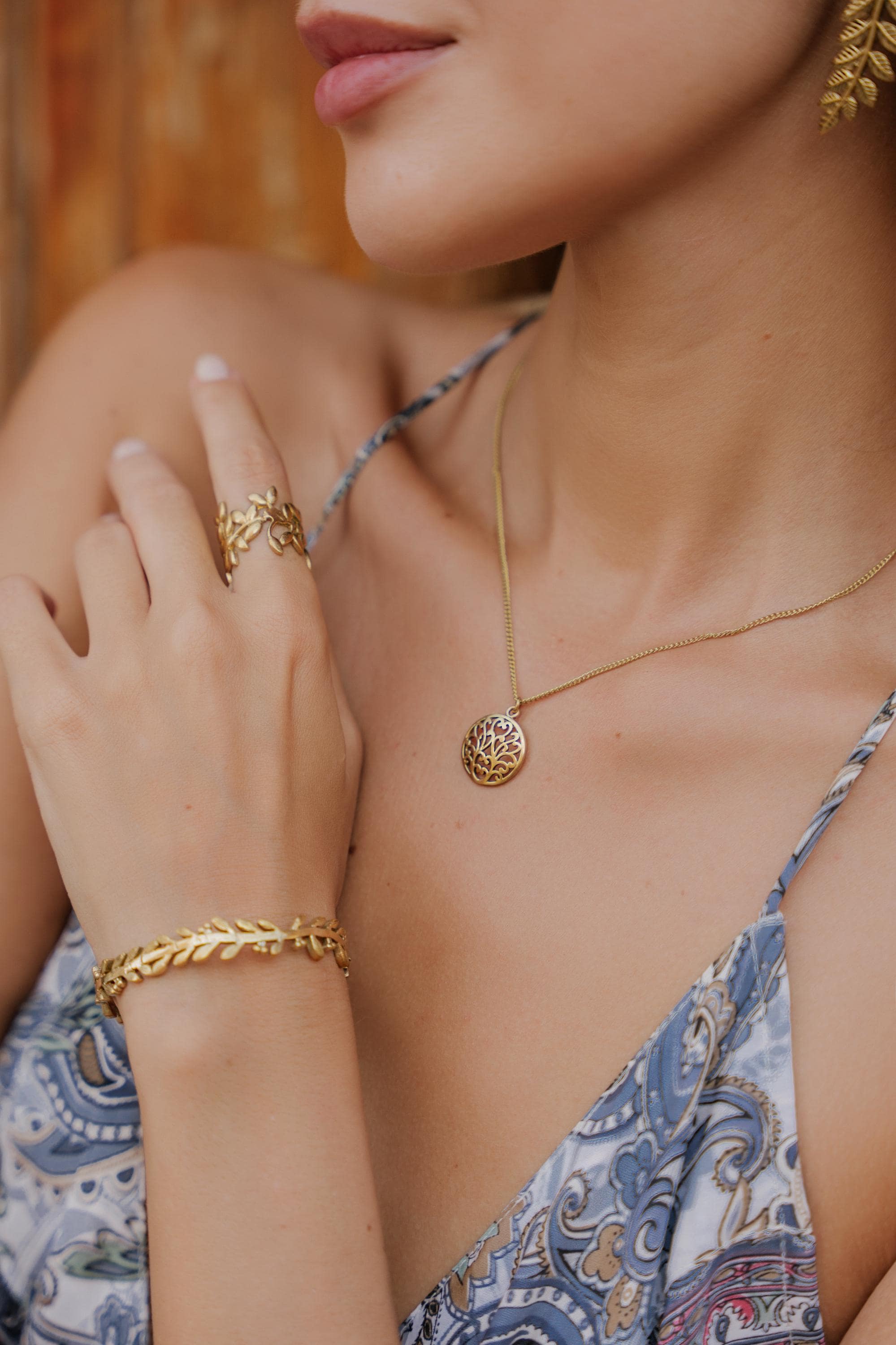This stunning ring is meticulously crafted from polished brass and features a detailed leaves pattern inspired by the wonders of mother nature.