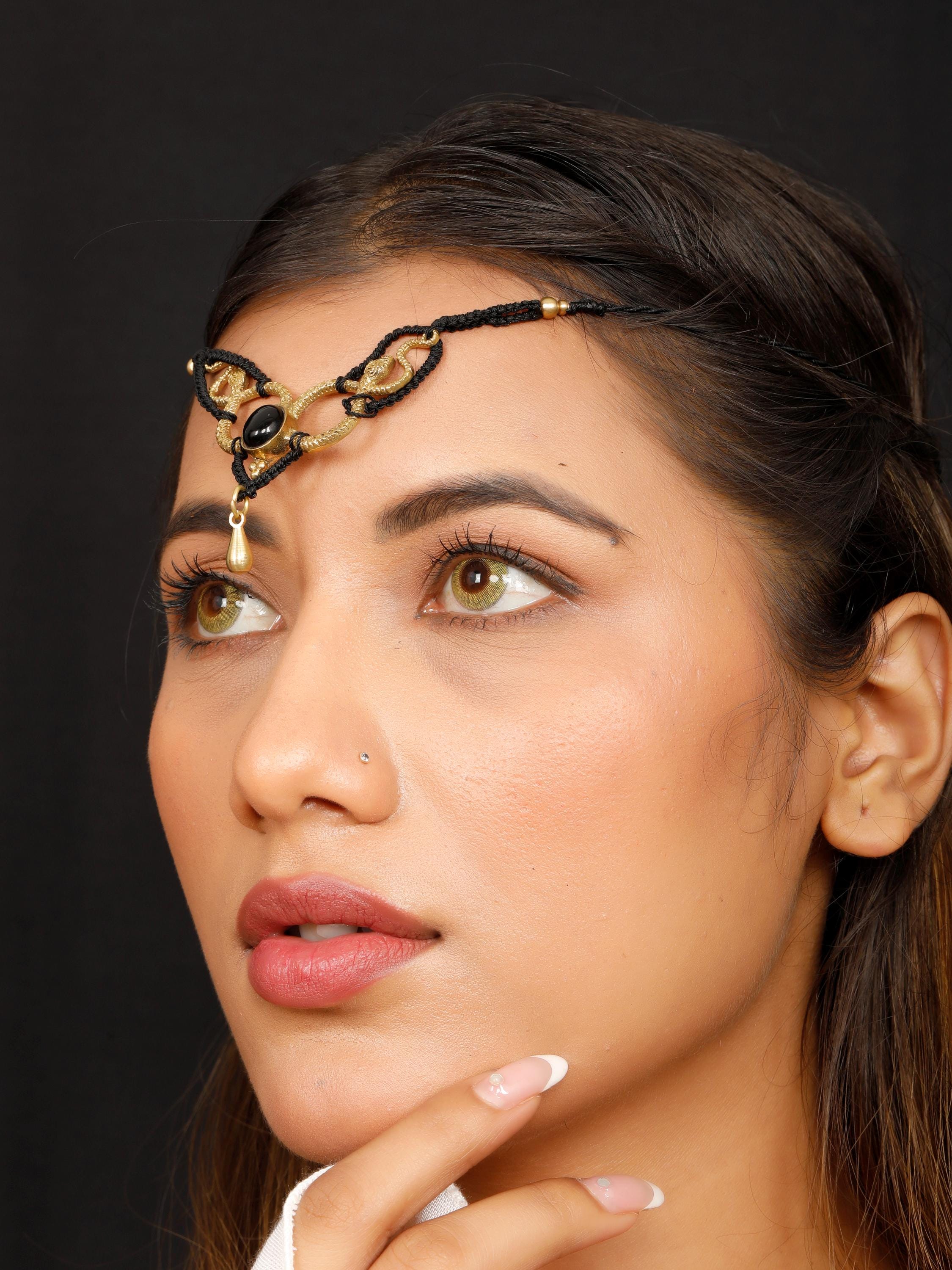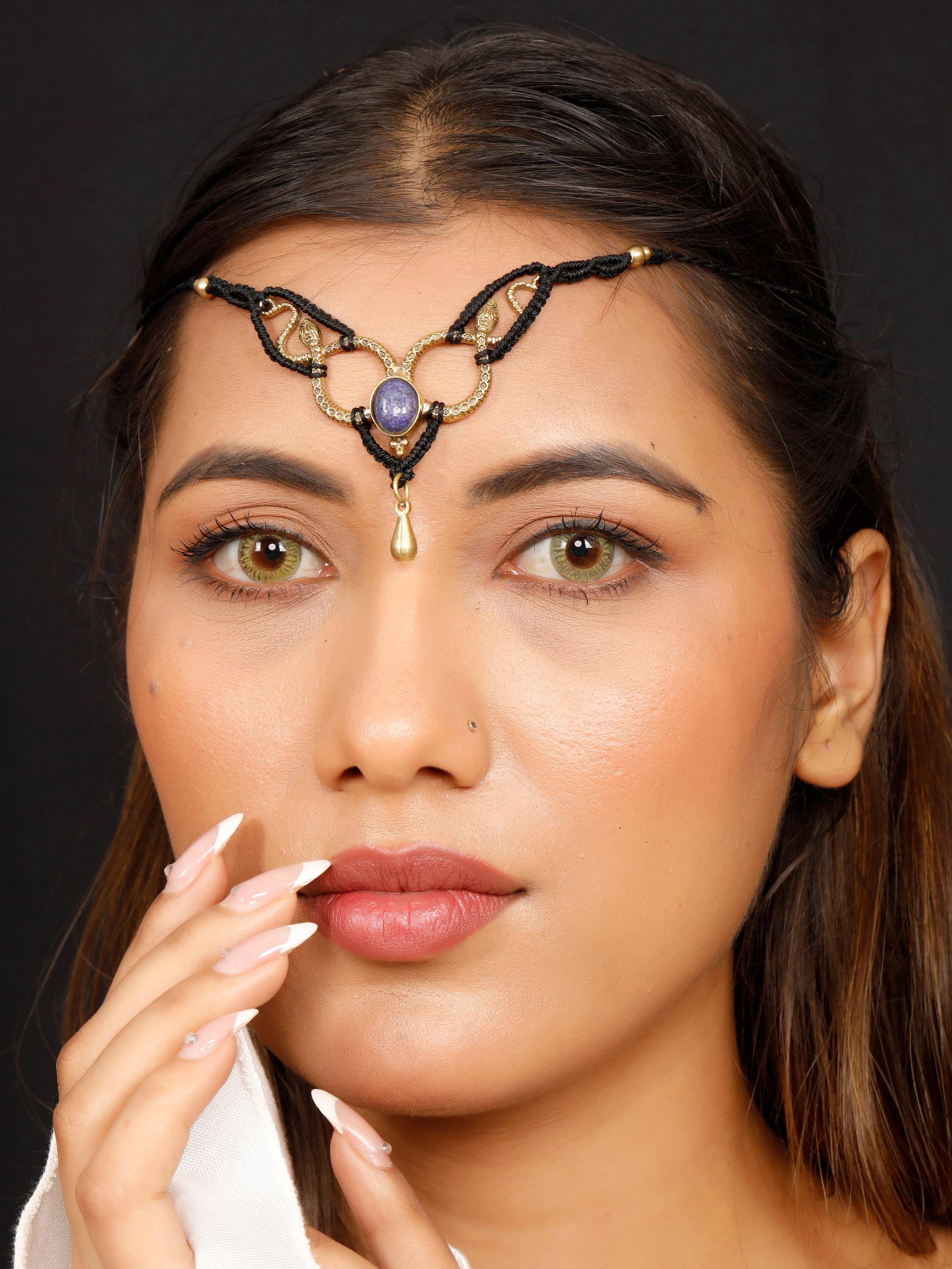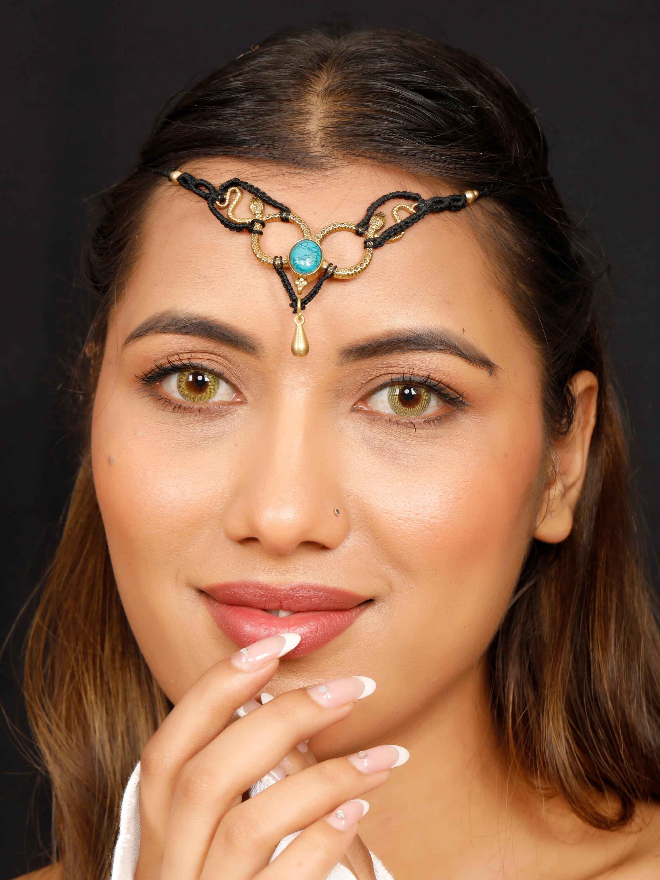 A gemstone is nestled between the snakes, enhancing the tiara's mystic allure.