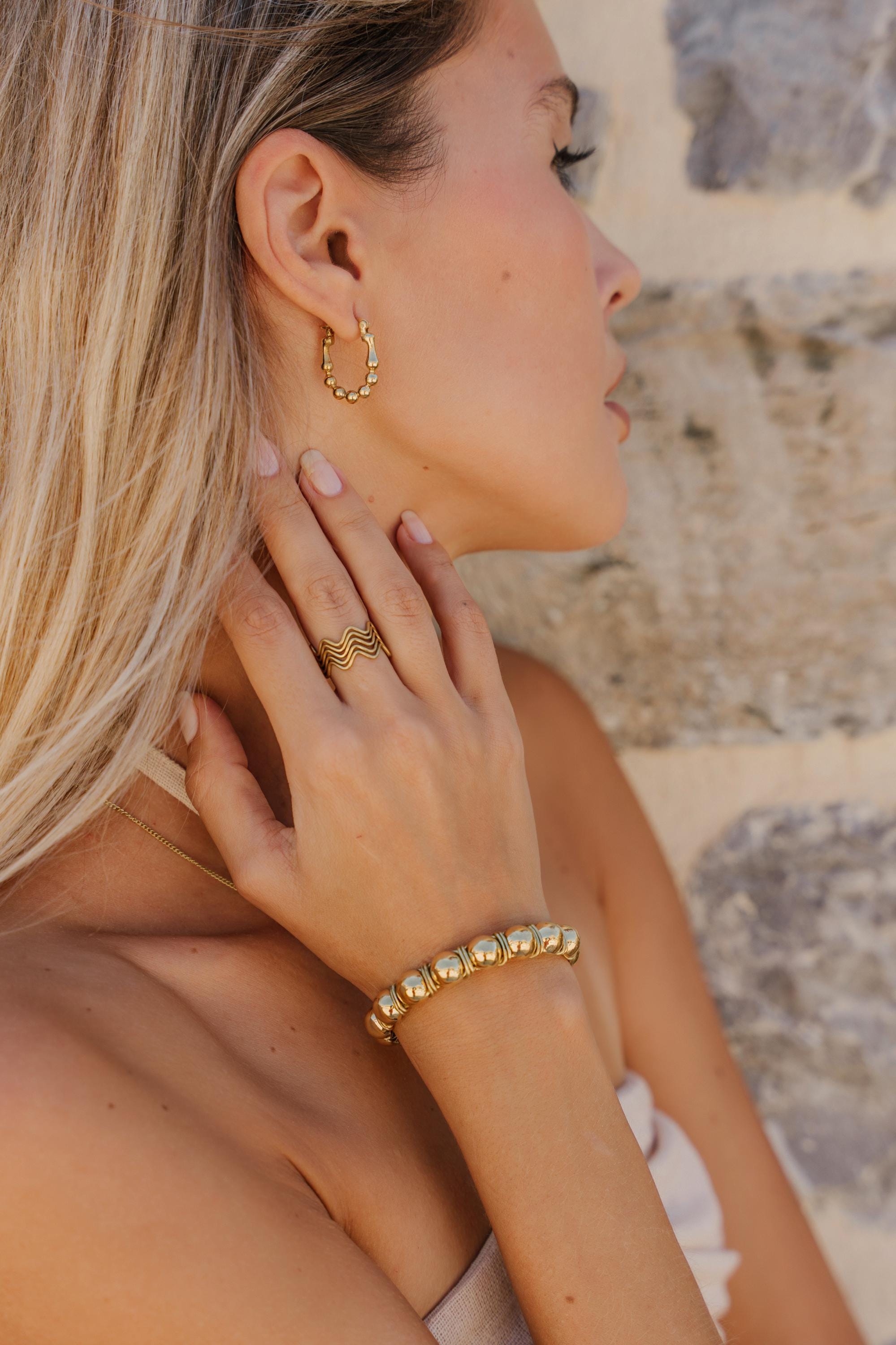 This timeless piece features a smooth, polished brass band accented with strategically placed spheres, the space between each sphere is then decorated with brass wire wrapped all the way around the bracelet, creating a subtle yet captivating graphic design.