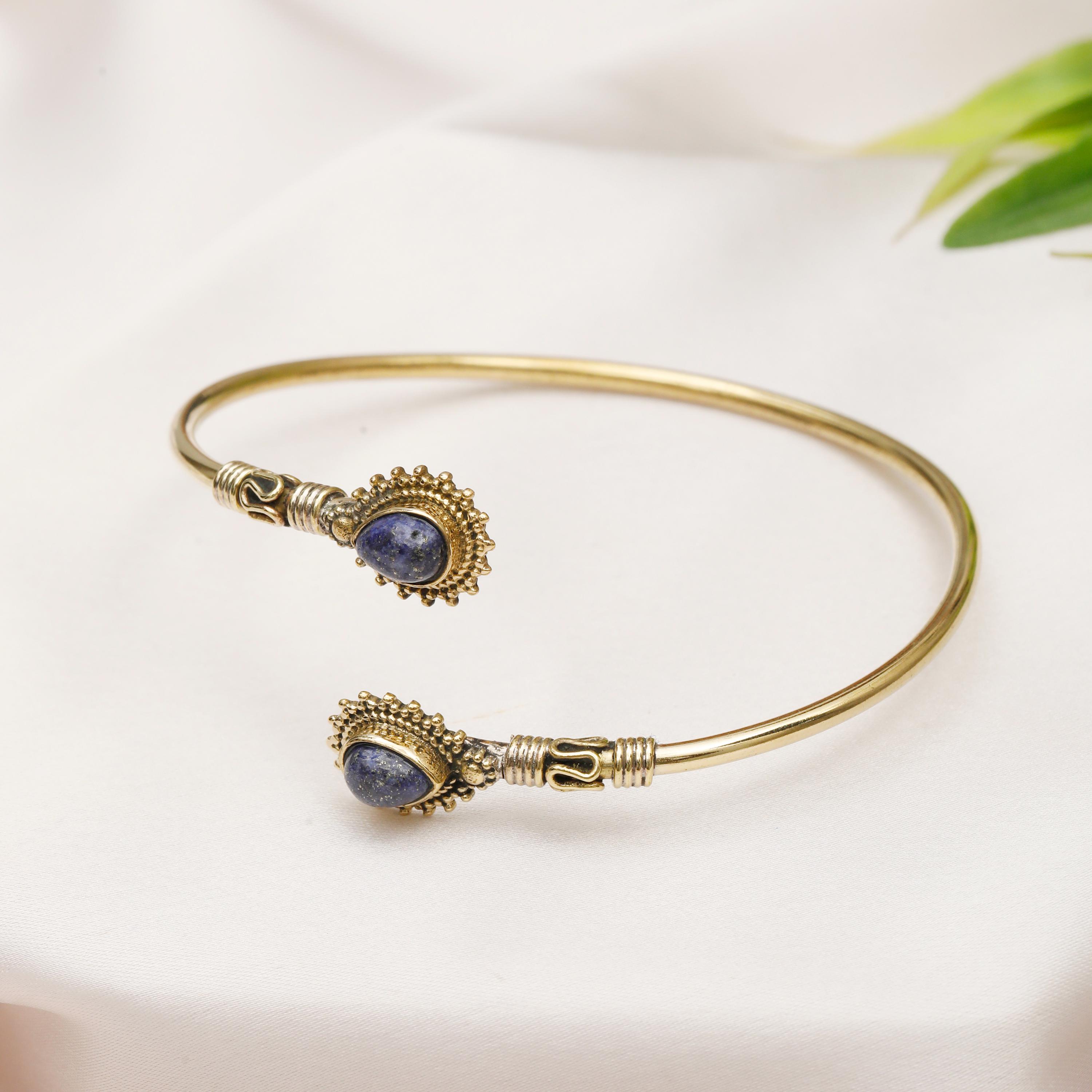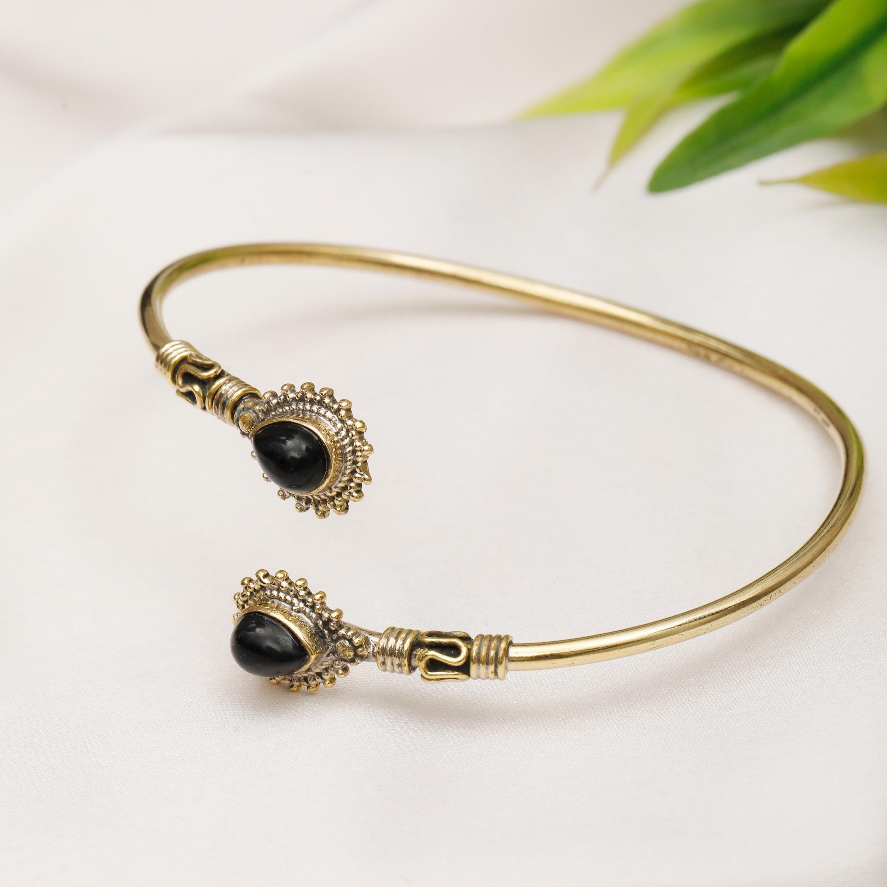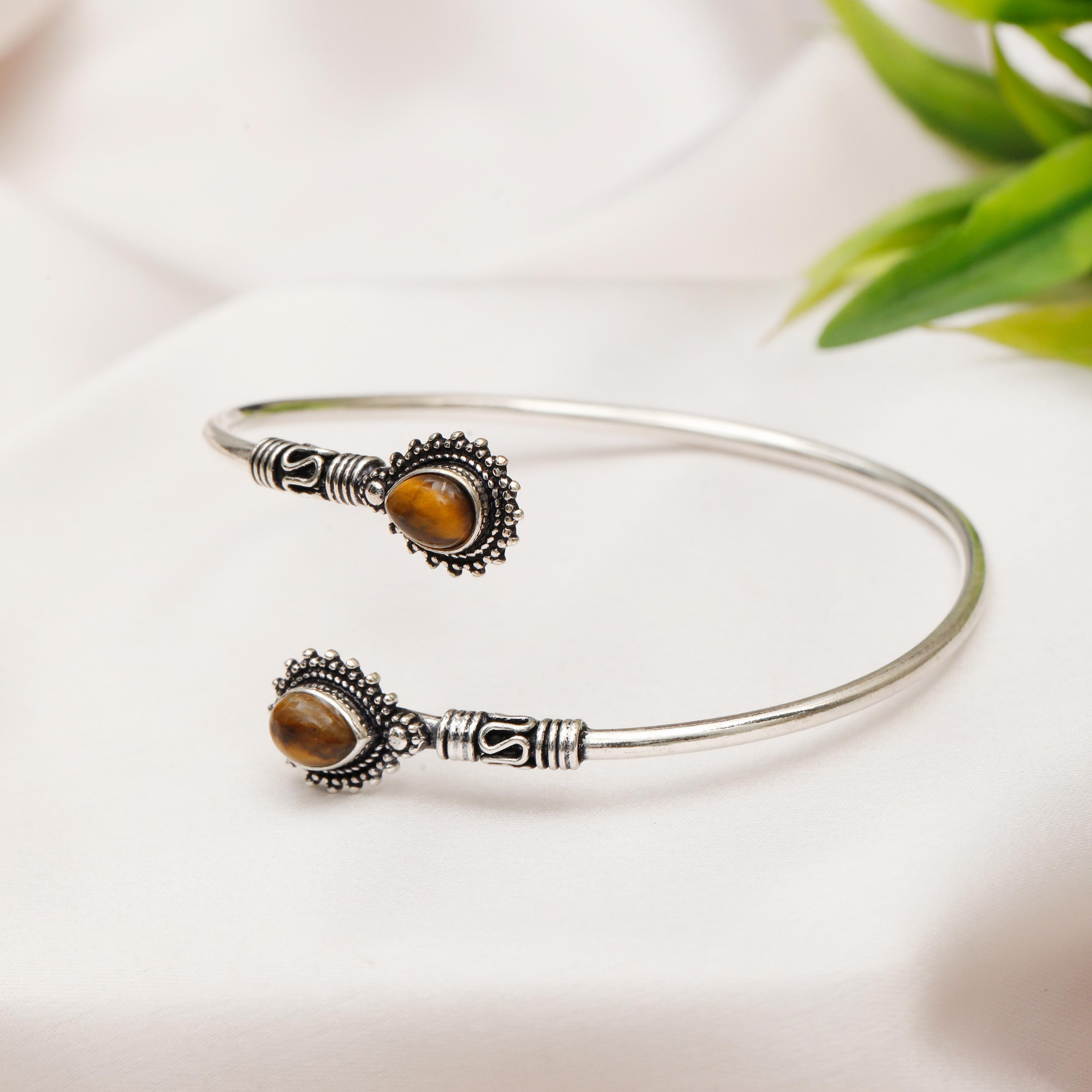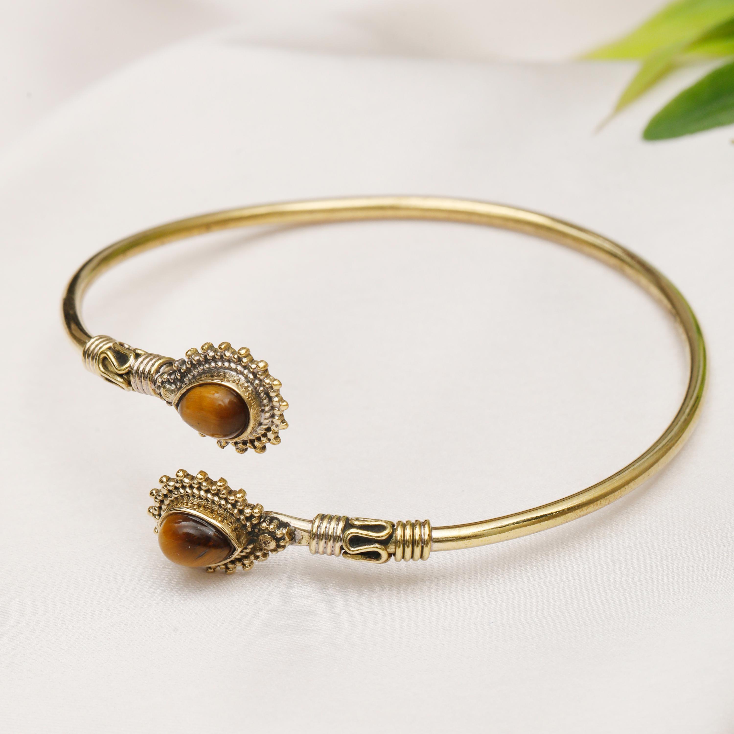 This thin rigid minimalist ethnic cuff bracelet is the perfect accessory for those who appreciate clean lines and natural beauty. Two genuine natural stones are carefully set to face each other, creating a focal point that is both eye-catching and symbolic.