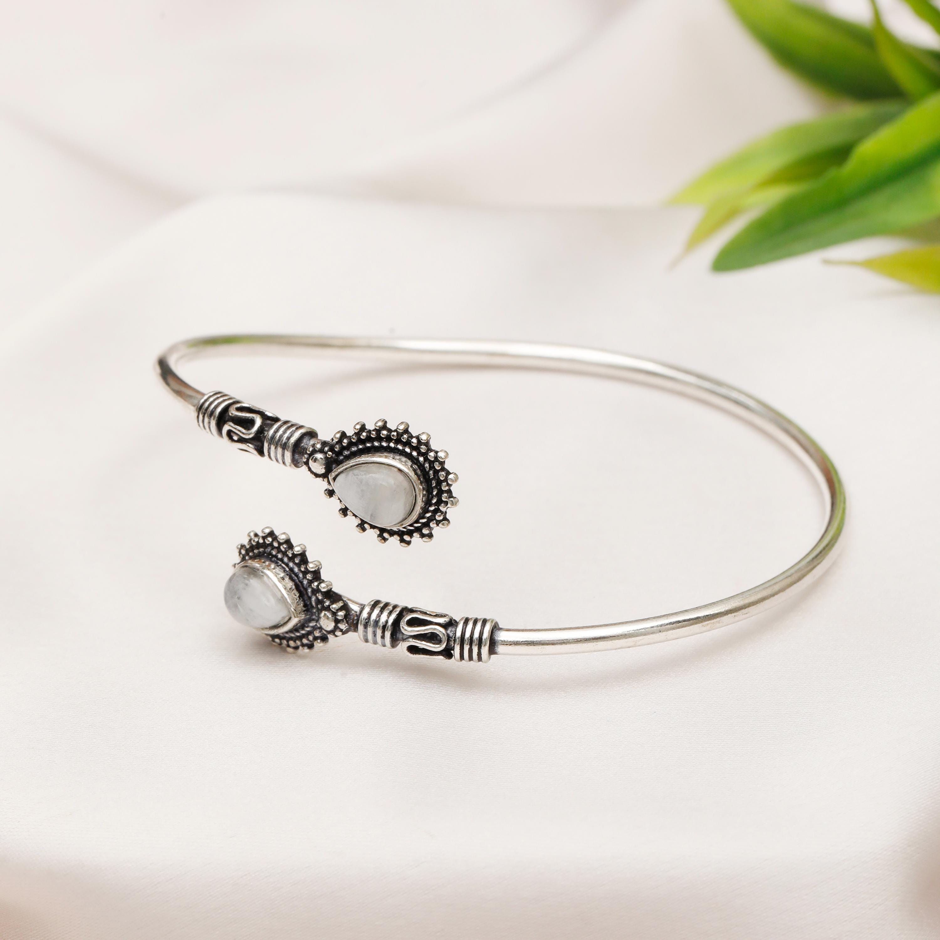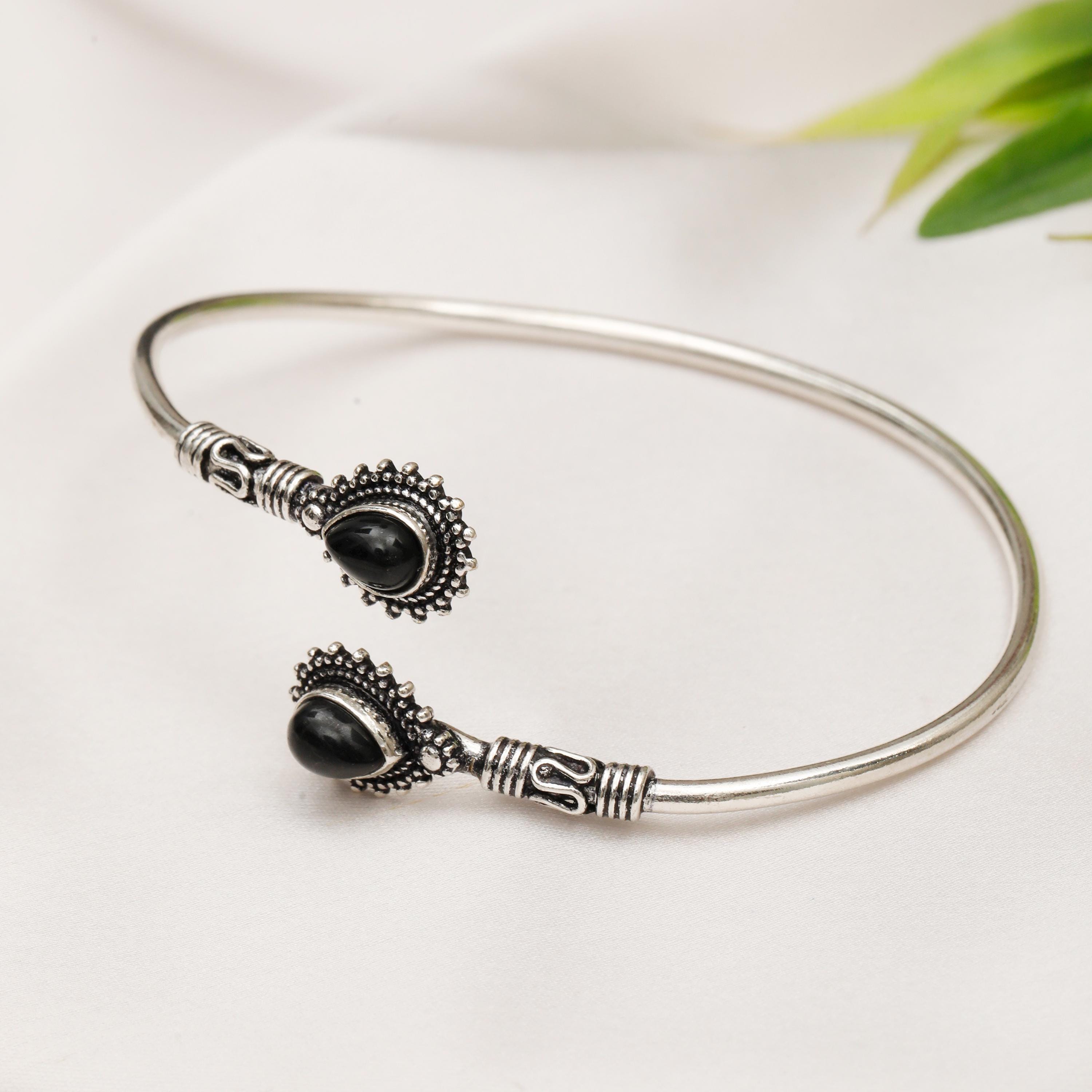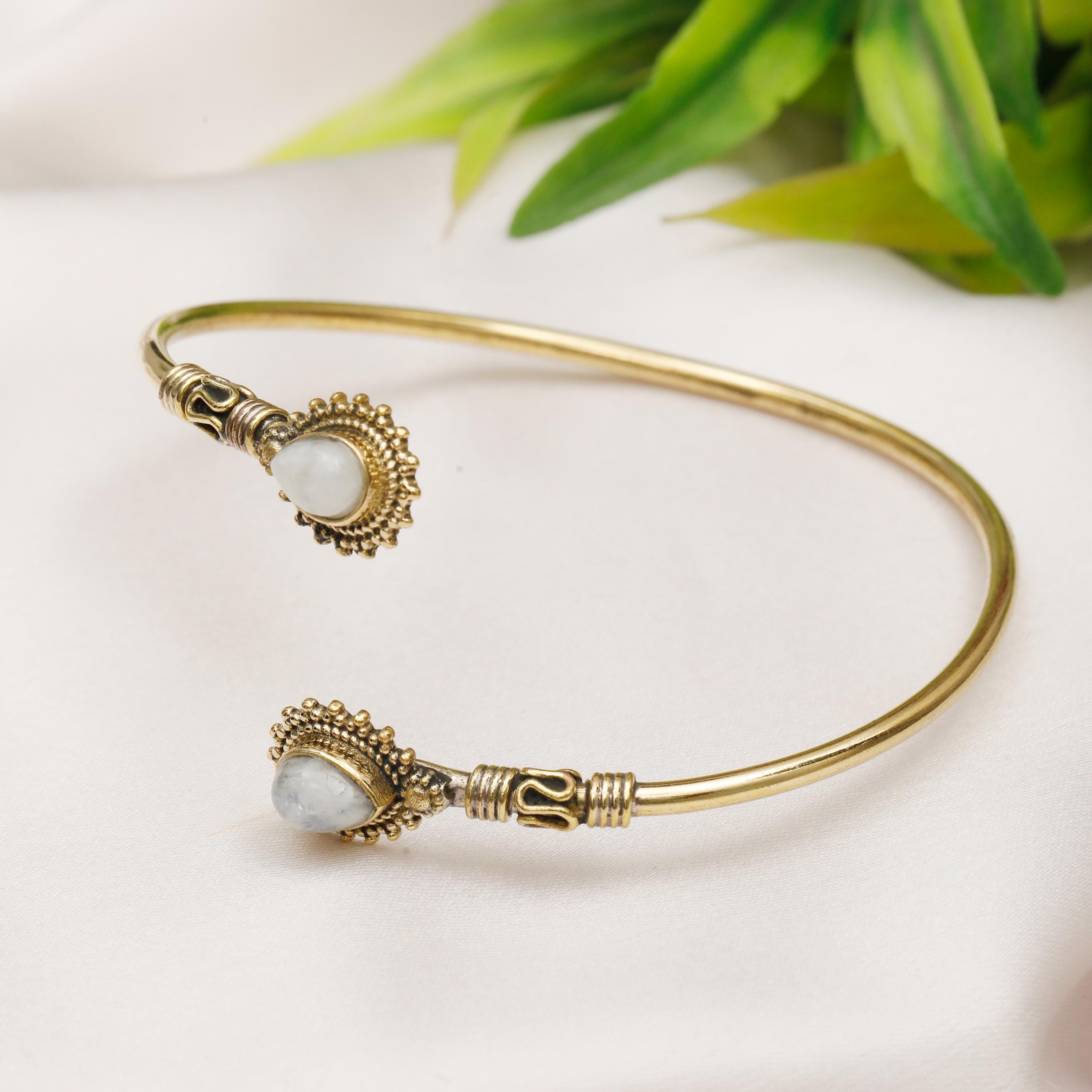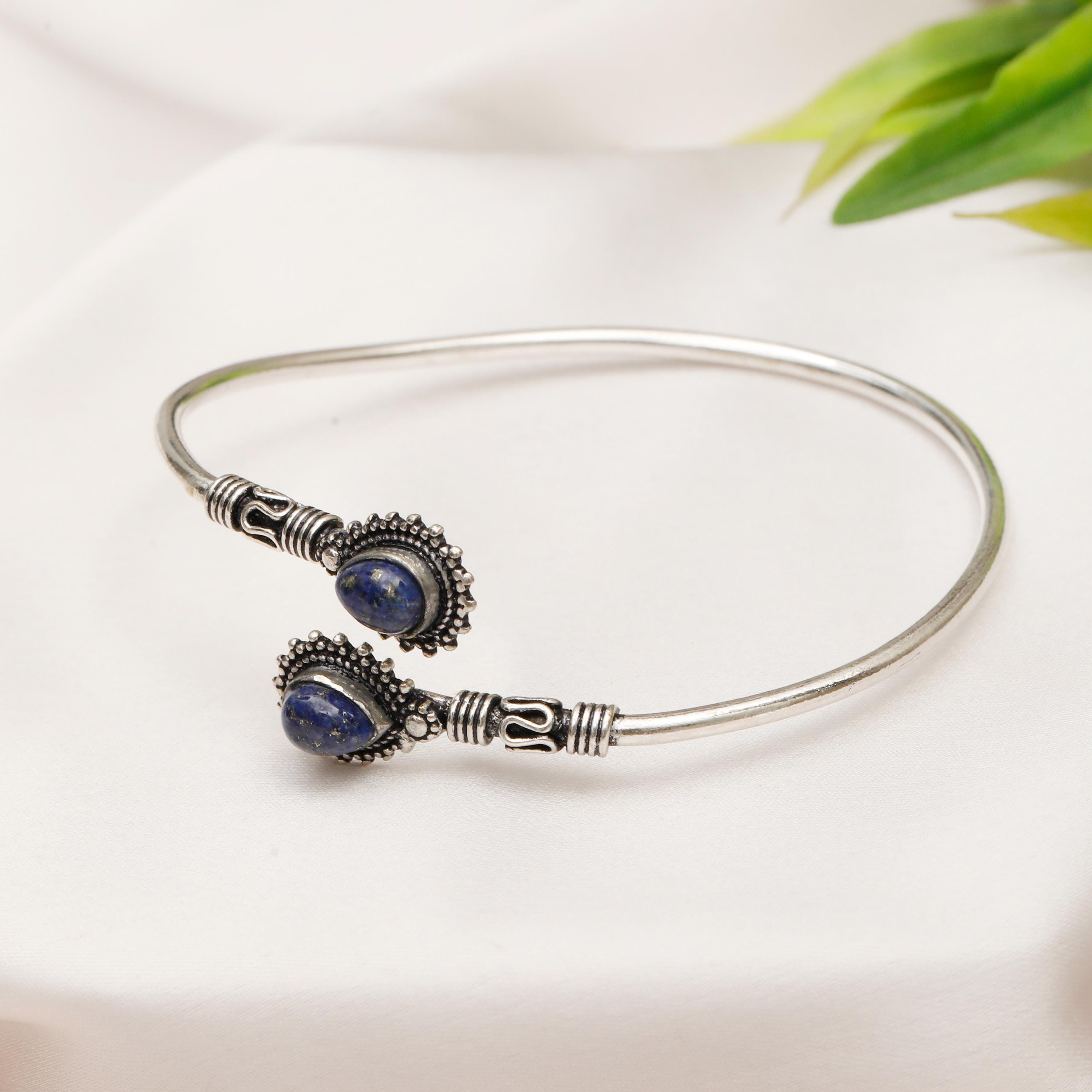 This thin rigid minimalist ethnic cuff bracelet is the perfect accessory for those who appreciate clean lines and natural beauty. Two genuine natural stones are carefully set to face each other, creating a focal point that is both eye-catching and symbolic.