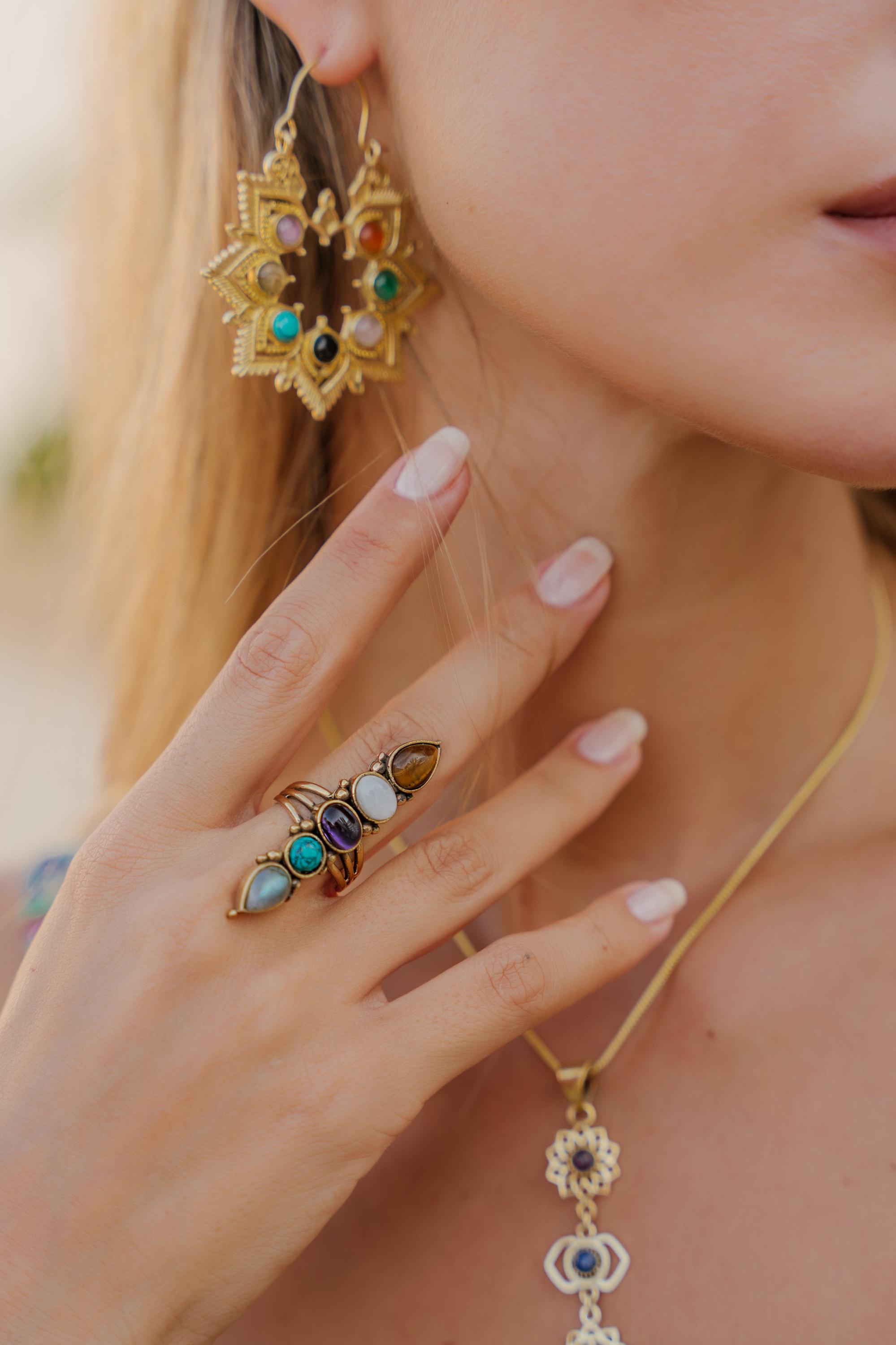 Adorn your fingers with a kaleidoscope of color and bohemian charm with our Long Multi-Gemstone Brass Ring.