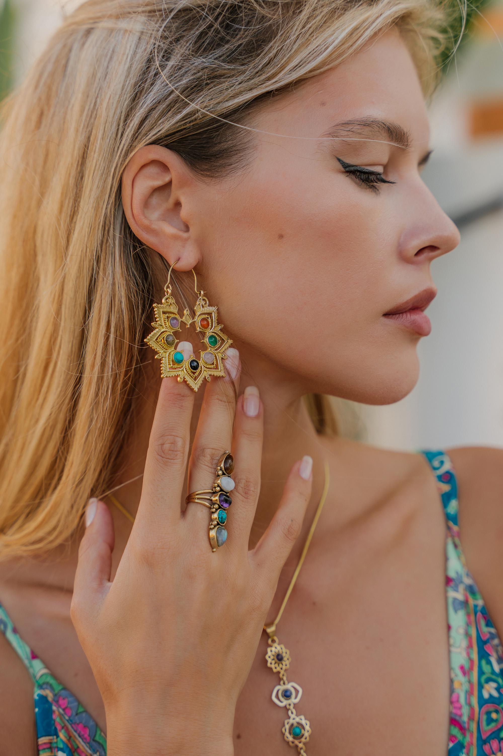 Embrace your inner bohemian goddess with our stunning Long Multi-Gemstone Brass Ring. Add a touch of color, texture, and unique style to your look with this eye-catching and versatile piece.